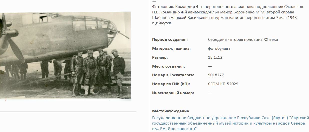 Шабанов А.В. (мл.лейтенант) -флагманский стрелок-радист, погиб 7 мая 1943 года, Якутск. По данным от Александра Кот. - флагманский стрелок-радист, погиб 7 мая 1943 года в составе экипажа Бороненко А.М., Якутск.