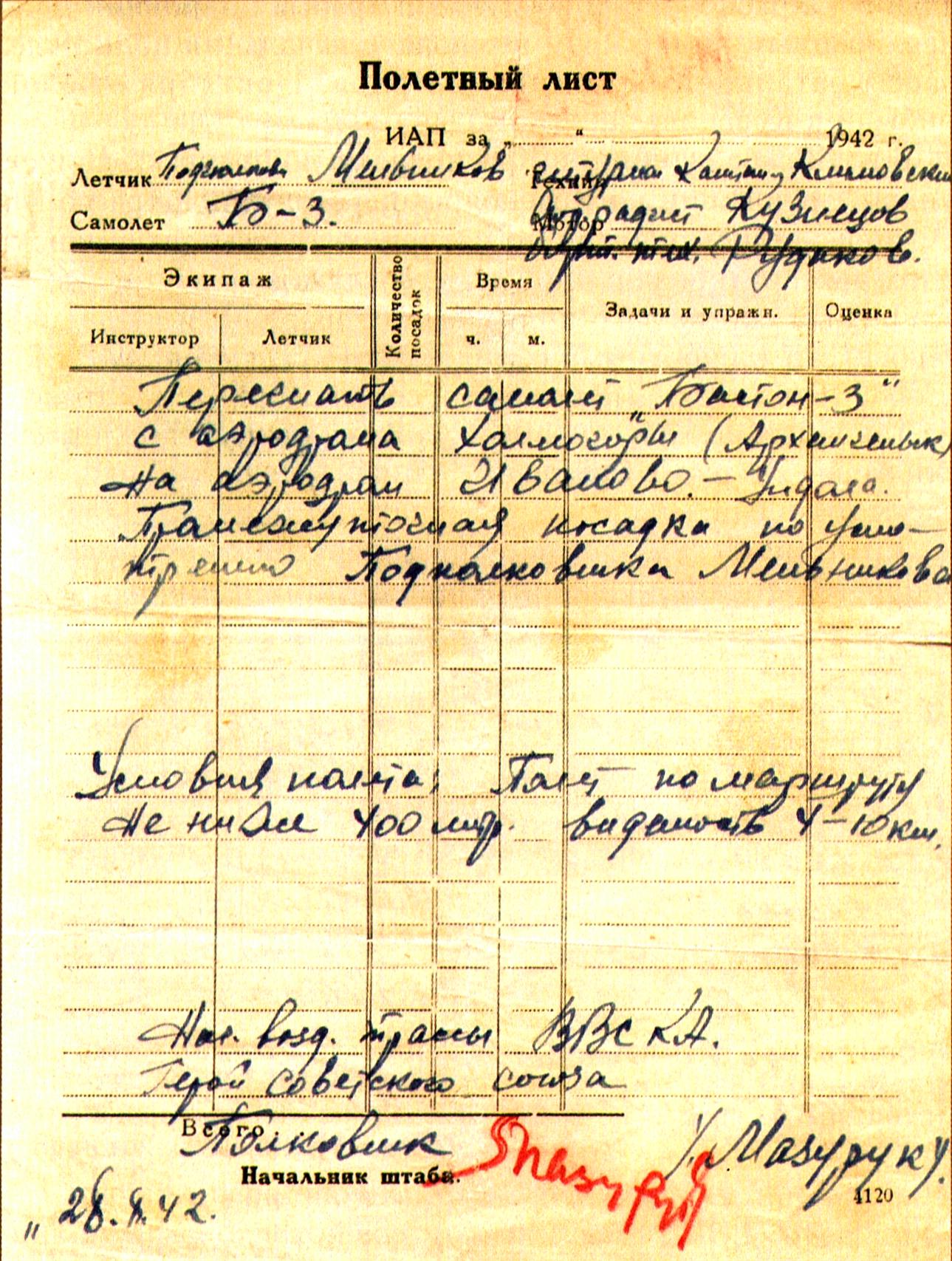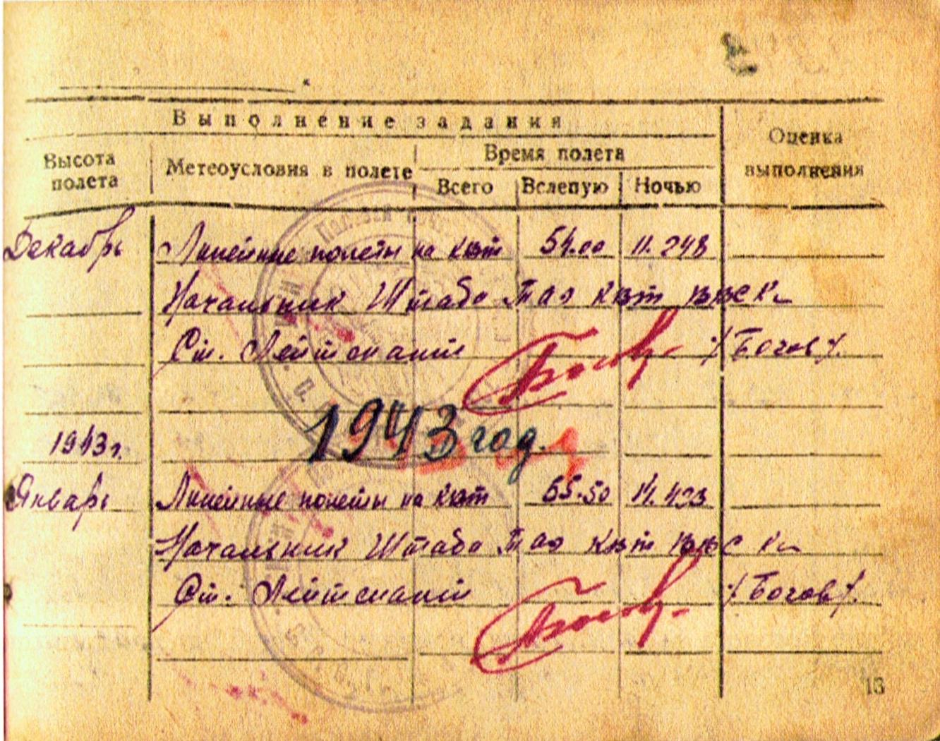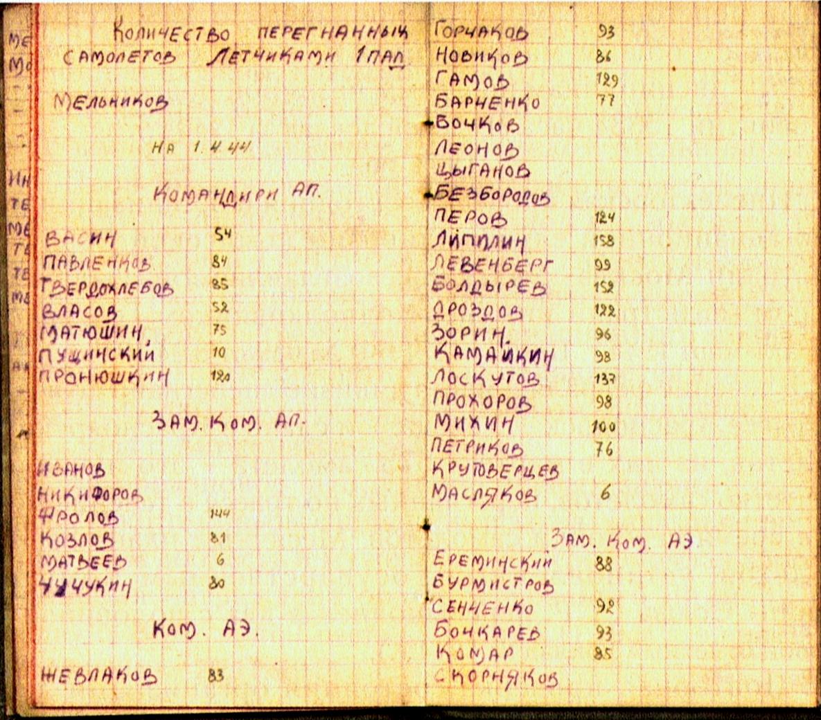 3. Повторная проверка состояния организации летной работы 1-го пап и выполнения указаний, данных полку при проверке в 1943 году. Проверку производили командир дивизии полковник Мельников, заместитель командира дивизии по политчасти подполковник Пушкарский и старший инспектор по технике пилотирования дивизии подполковник Тихомиров (Февраль 1944 г. Акт проверки).