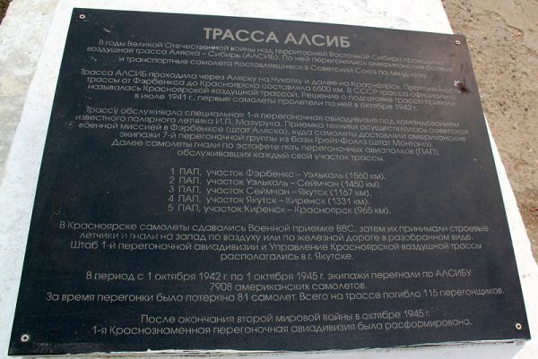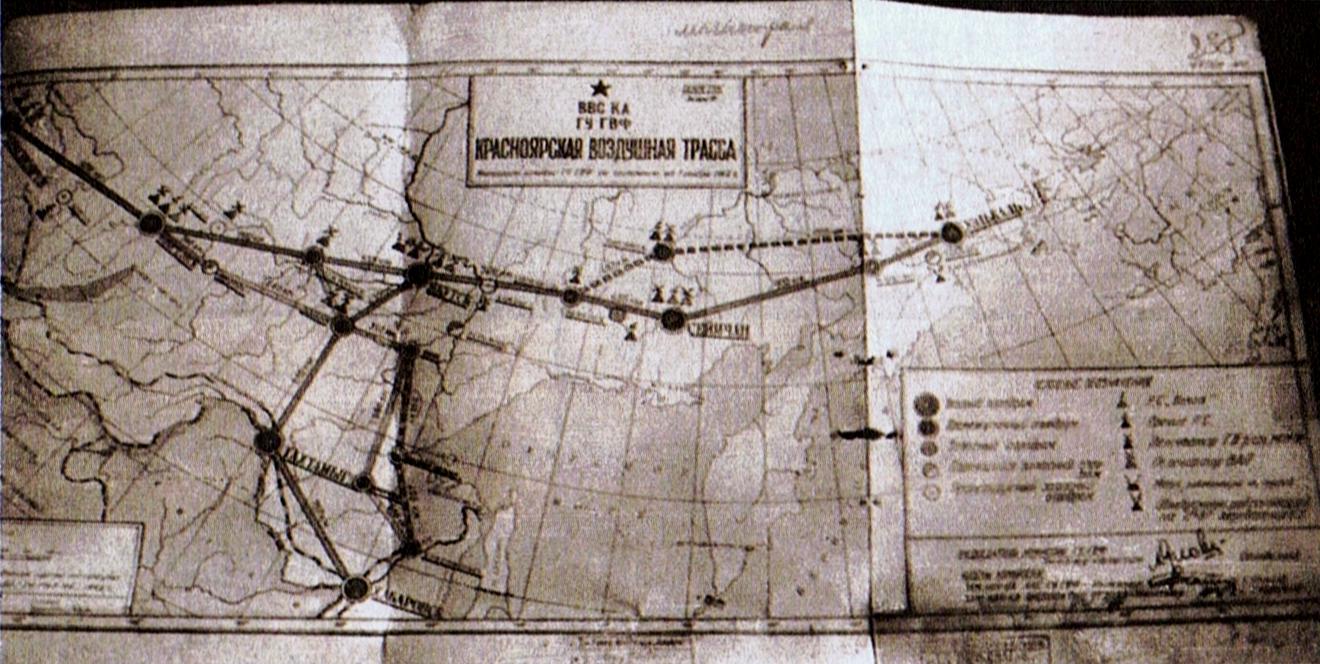 1. На основании решения Государственного Комитета Обороны Союза ССР и директивы заместителя народного комиссара обороны СССР в августе месяце 1942 г. в г. Иванове началось формирование Красноярской воздушной трассы ВВС Красной Армии. Перед трассой была поставлена задача: ускорить строительство аэродромов и немедленно приступить к перегонке боевых и транспортных самолетов из США (Аляска) для действующих частей на фронтах Великой Отечественной войны по вновь организующейся воздушной трассе Фербенкс - Красноярск, маршрутом общей протяженностью - 6371 км, через Уэлькаль (Чукотка) - Сеймчан (река Колыма) - Якутск - Киренск (Иркутской области) - Красноярск (Приказ НКО № 00162 от 3 августа 1942 г.).