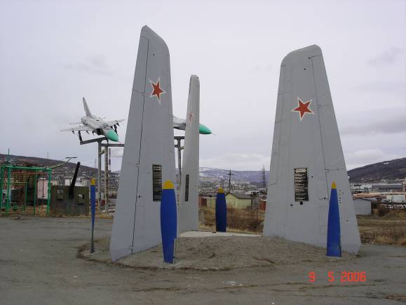 Сооружение из обломков самолетов мирного времени («ОЧК» от Ил-14 и пропеллеры – то ли от Ан-26, то ли от Ил-18), стоящее при въезде в город, показывает, КАК это делается в том случае, когда с этим самым умом проблемы (и, судя по всему, большие) и когда здравый смысл и профессионализм заменяется одной, но пламенной страстью – показать всем (и себе в первую голову) свою НУЖНОСТЬ. В одной из несметных статей, подготовленных пресс-центром клуба «Подвиг» («Свет доброй памяти» - «Магаданская правда» от 17.11.92 г.), читаем: «Три крыла боевых самолётов МИГ в едином порыве взметнулись в небеса в ожерелье ВЕРТОЛЁТНЫХ лопастей». Допускаю, что автор этой ахинеи что-то смыслит в «ожерельях», но «МИГи» (равно как и «вертолётные лопасти») представляет себе весьма смутно. Но суть даже не в этом. Читаем на одной из табличек: «МЕМОРИАЛ погибшим авиаторам создан силами КУРСАНТОВ Магаданского военного спортивно-технического клуба «Подвиг» и лётчиков Военно-Воздушных Сил Дальнего Востока». А на остальных табличках – имена и фамилии погибших авиаторов.