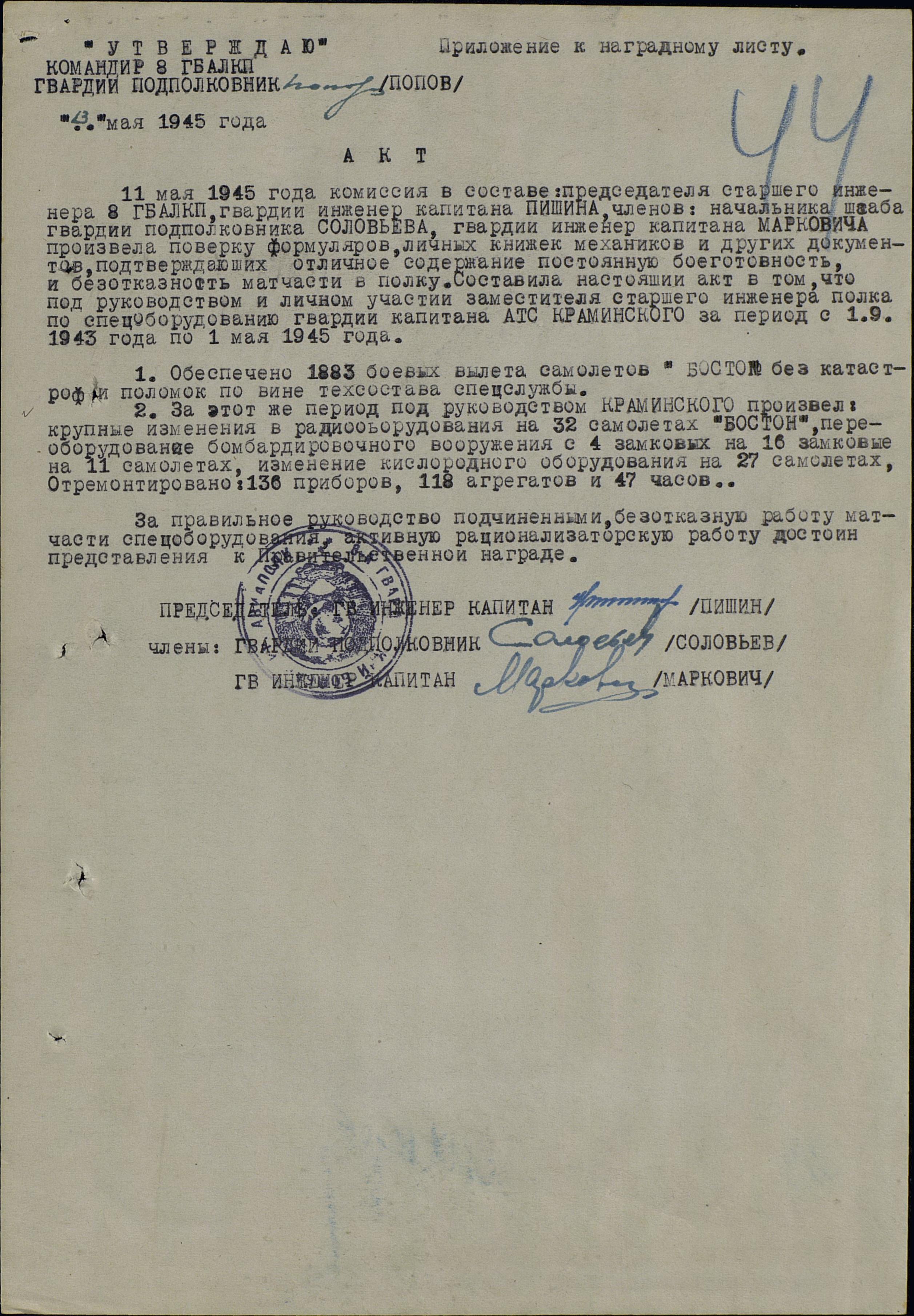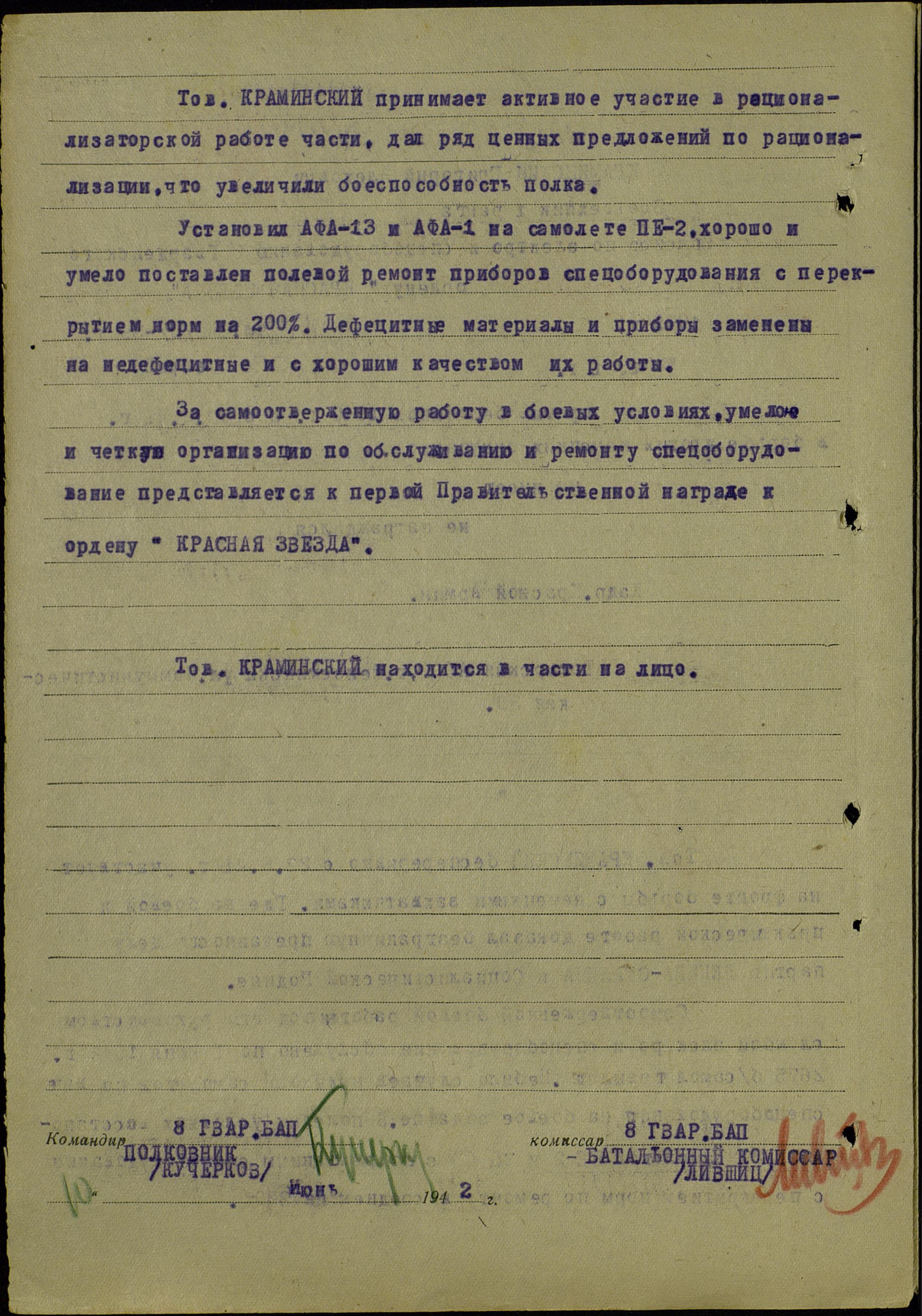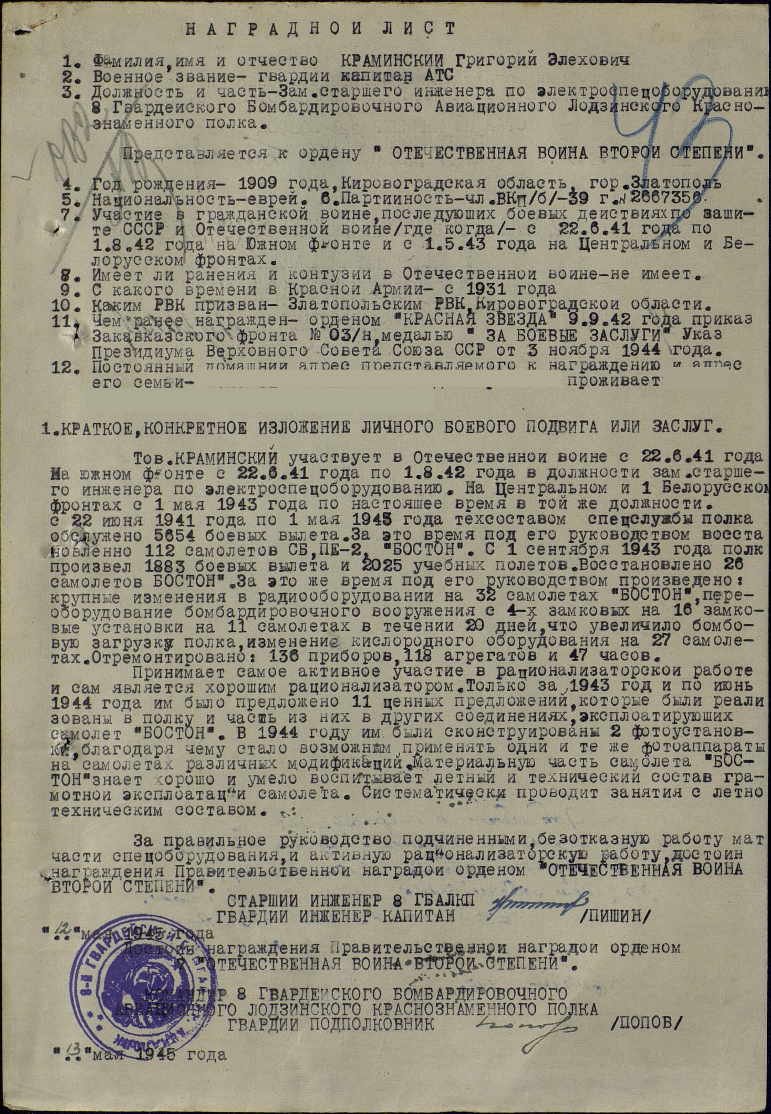 Наиболее подходящая кандидатура - это Краминский Григорий Элехович. В наградных листах все о нем сказано. О послевоенной службе нет данных, как и о причине смерти.