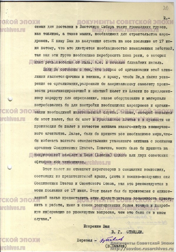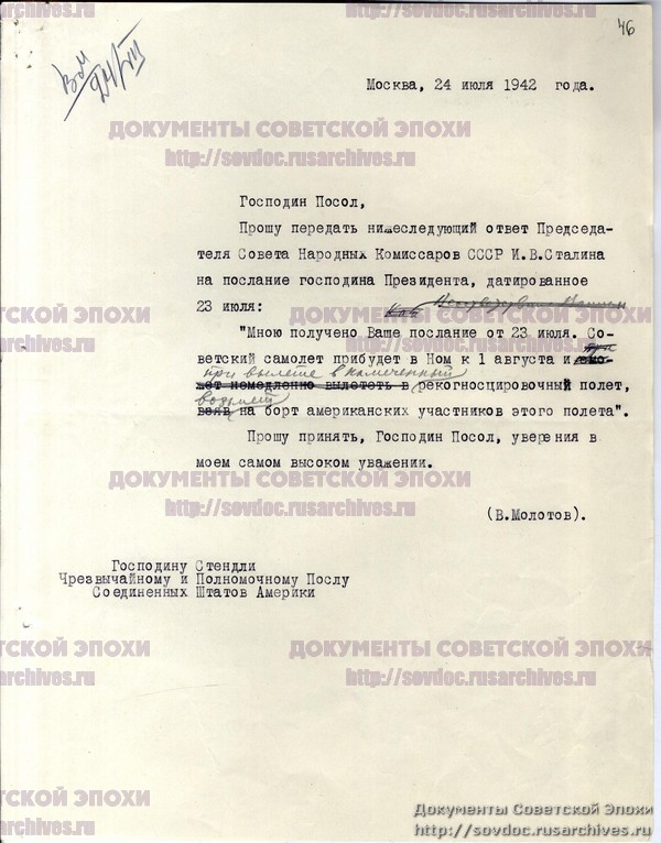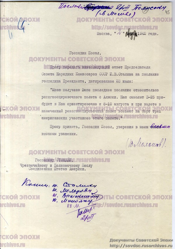 Ответное послание Сталина Рузвельту о разведывательном полете американского самолета с Аляски.