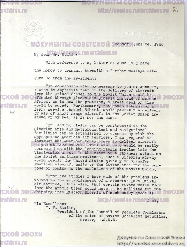 Послание Рузвельта Сталину о переброске самолетов через Дальний Восток, о разведывательном полете американского самолета из Аляски, о встрече военных представителей.