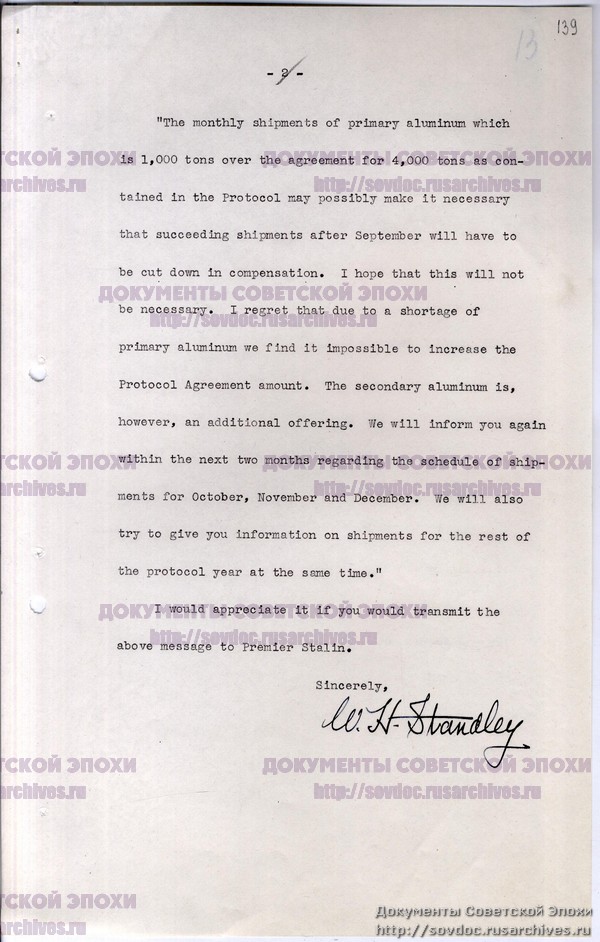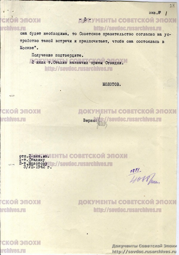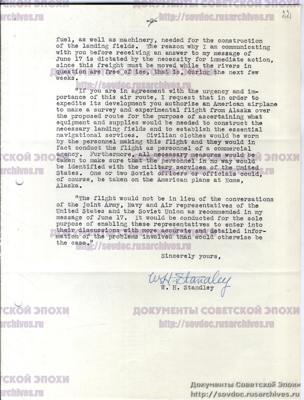 Письмо Стэндли Молотову с текстом послания Рузвельта Сталину о дополнительных поставках самолетов Советскому Союзу.
