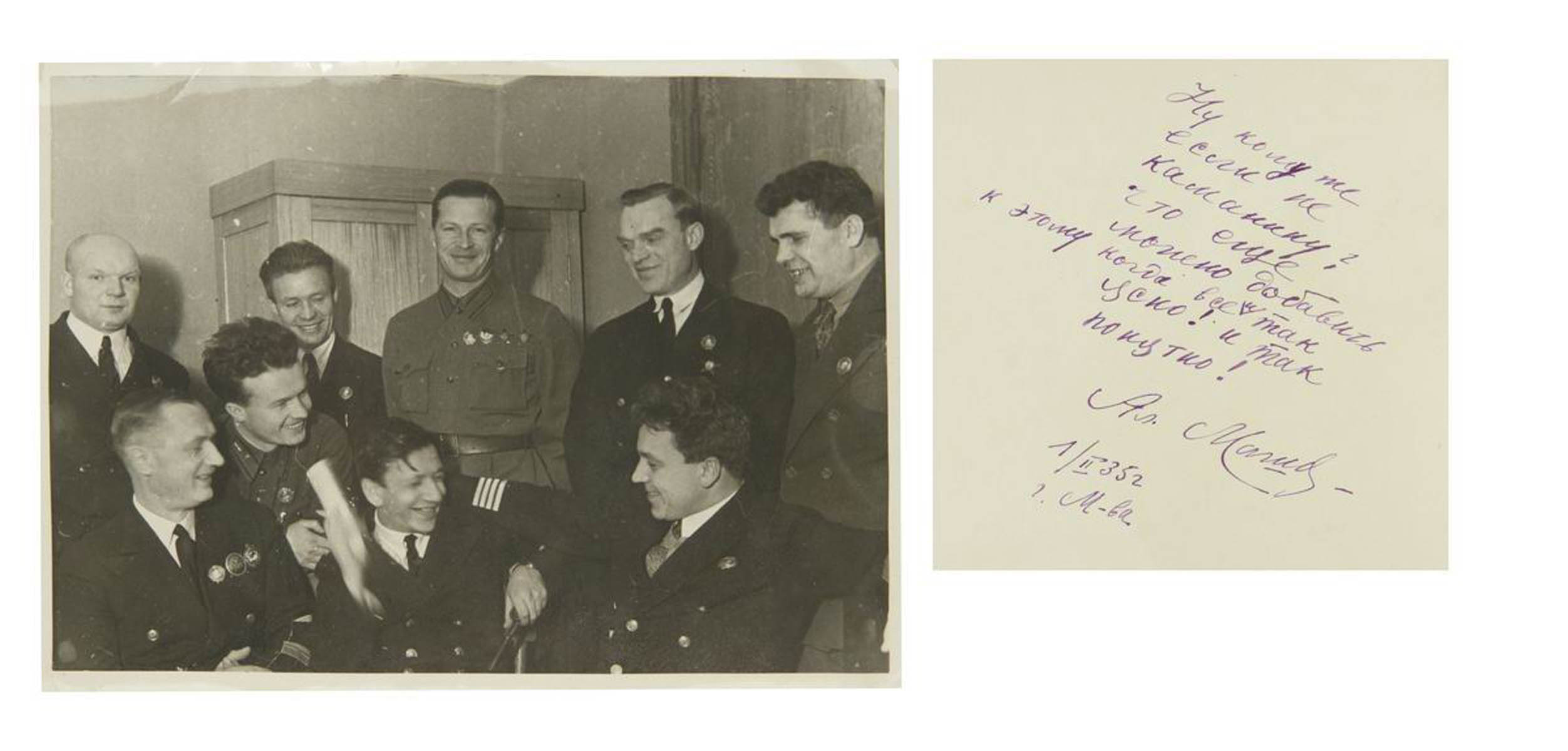 СССР. Фото группы летчиков - первых Героев Советского Союза. Неизвестная мастерская, СССР, 1935 г. На оборотной стороне подпись “Ну кому же если не Каманину? Что еще можно добавить к этому когда все и так ясно! И так понятно! [неразб.] 1/ II 1935 г. М-ва”. Размер 176 х 234 мм. На фото с орденами на груди изображены: (верхний ряд слева направо) И. В. Доронин (Орден Ленина 1 типа), Н. П. Каманин (Орден Ленина 1 типа и знак парашютиста), В. С. Молоков (Орден Ленина 1 типа), М. М. Громов (Орден Ленина 2 типа,Орден Боевого Красного Знамени и 2 Ордена Красного Знамени), С. А. Леваневский (Орден Ленина 1 типа, Орден Красной Звезды), М. В. Водопьянов (Орден Ленина 1 типа); (нижний ряд слева направо) М. Т. Слепнев (Орден Ленина 1 типа, знак Таджикской ССР за борьбу с басмачеством, но в послужном списке он обозначен как Орден Красного Полумесяца Таджикской ССР и неизвестный авиационный знак), А. Б. Юмашев, А. В. Ляпидевский (Орден Ленина 1 типа).
