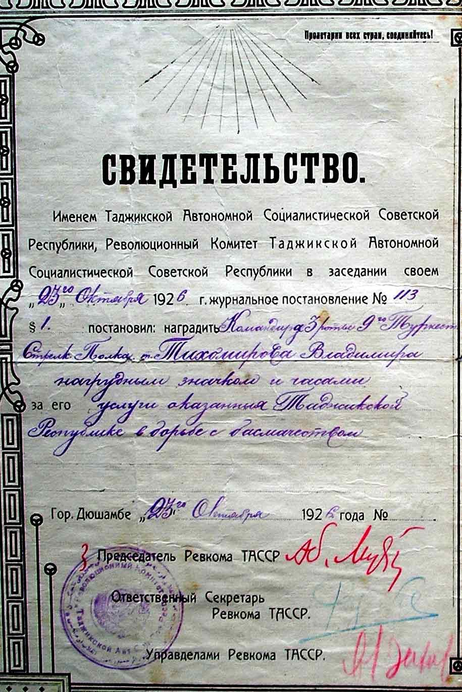 Среди кавалеров этого ордена был Маврикий Трофимович Слепнев, который в 1925-29 летал в Средней Азии, в том числе в опрерациях против басмачей.