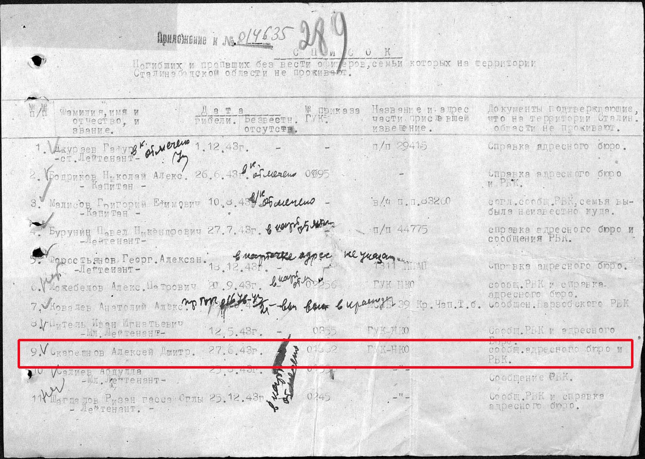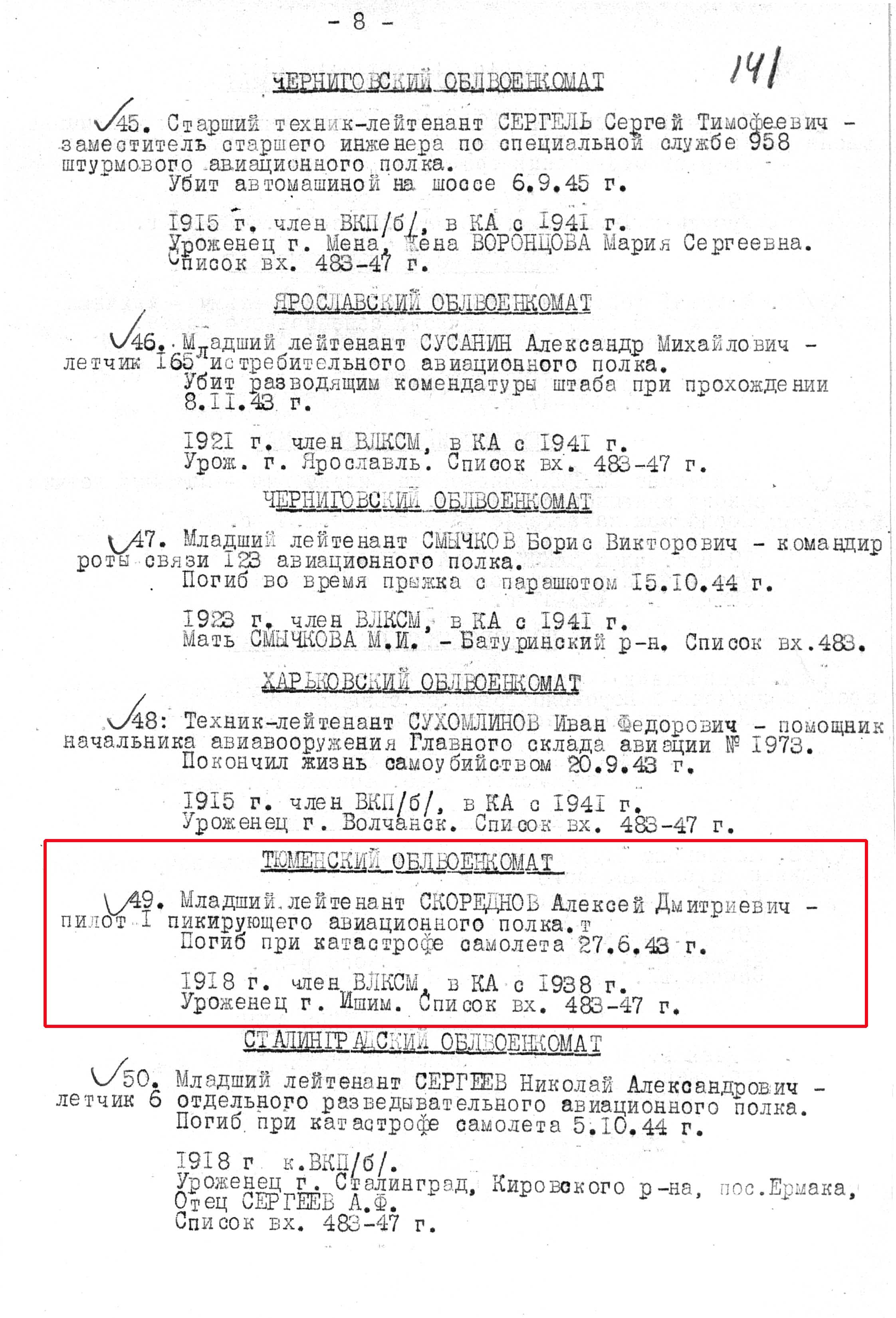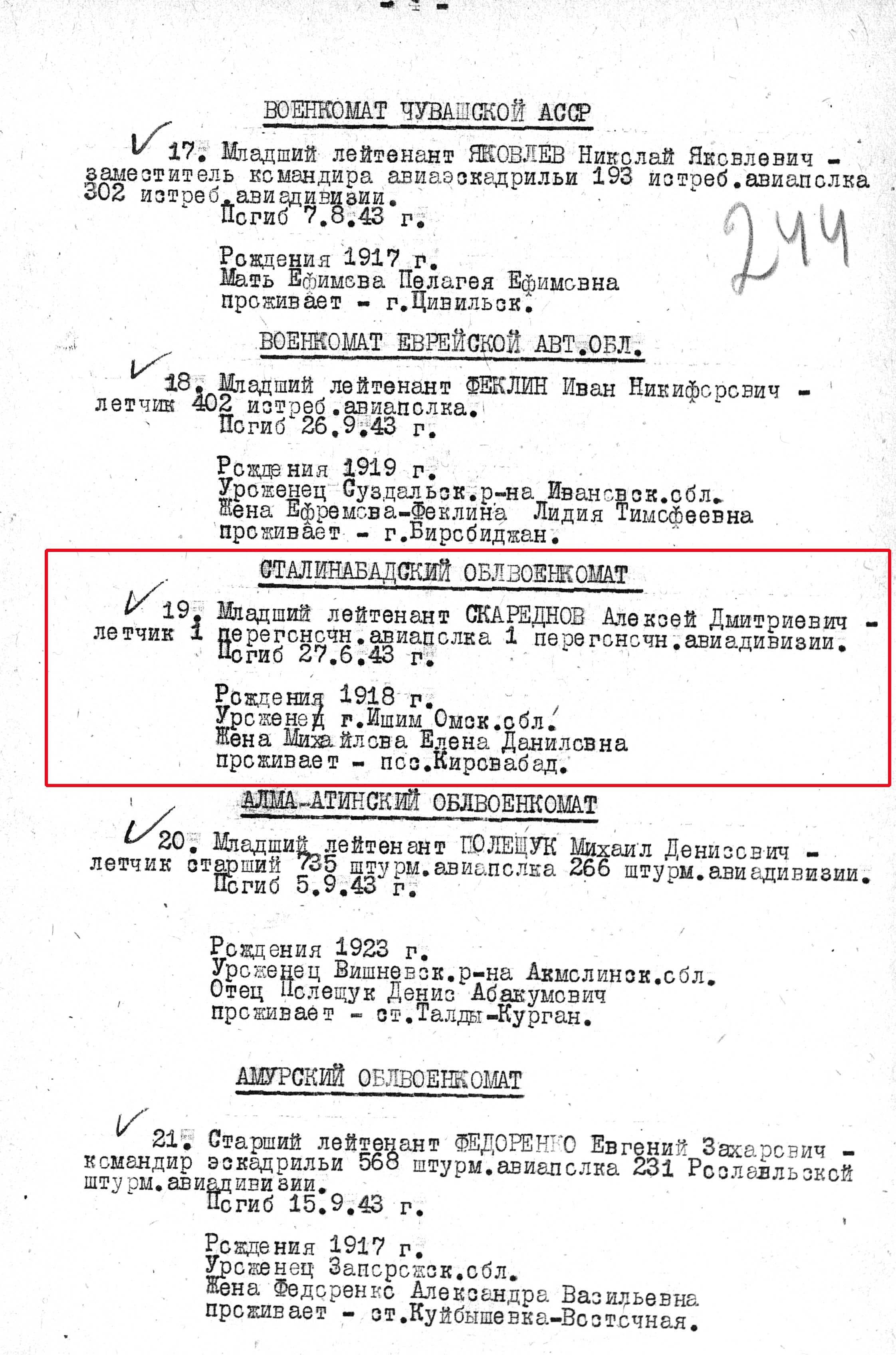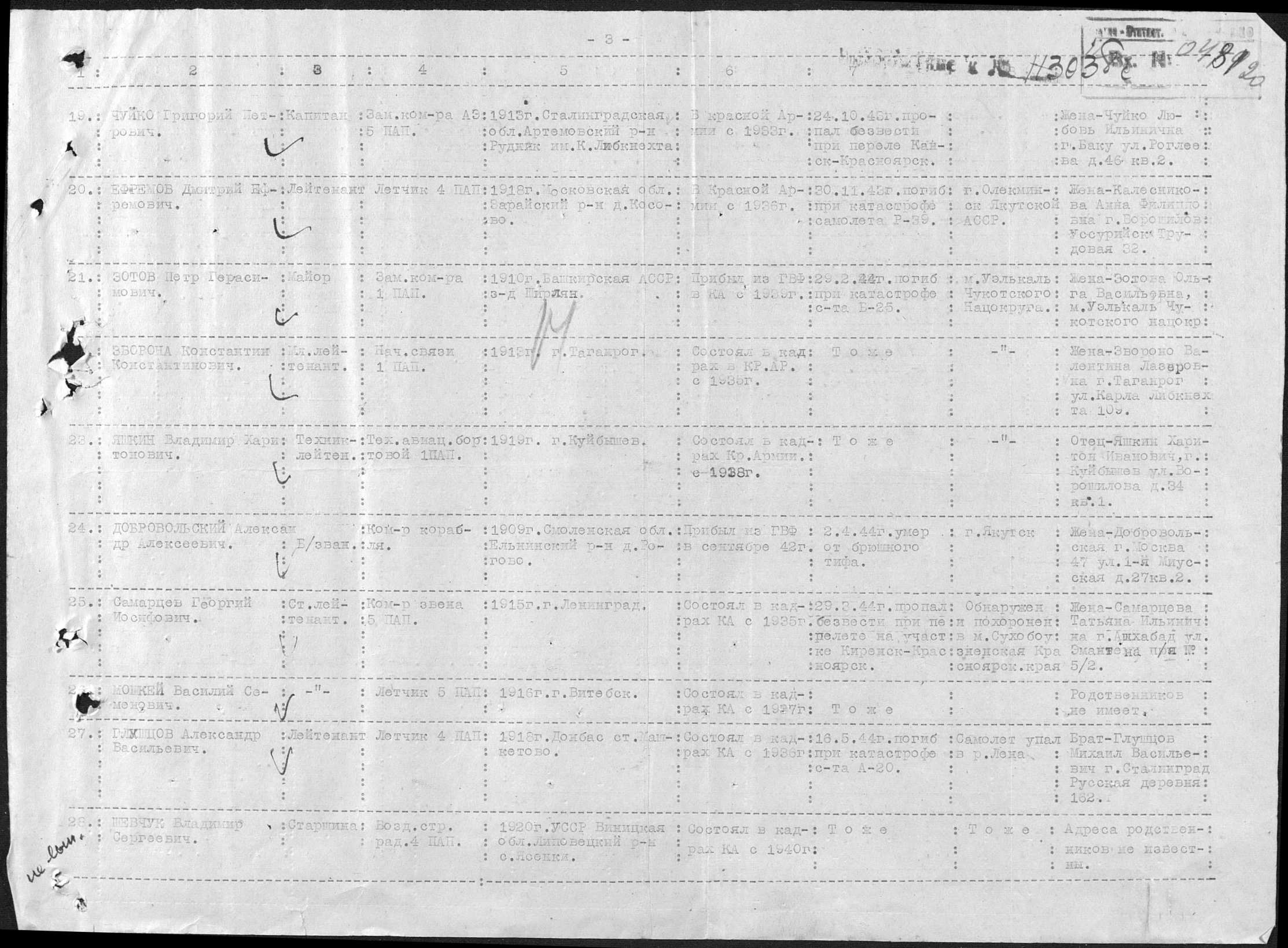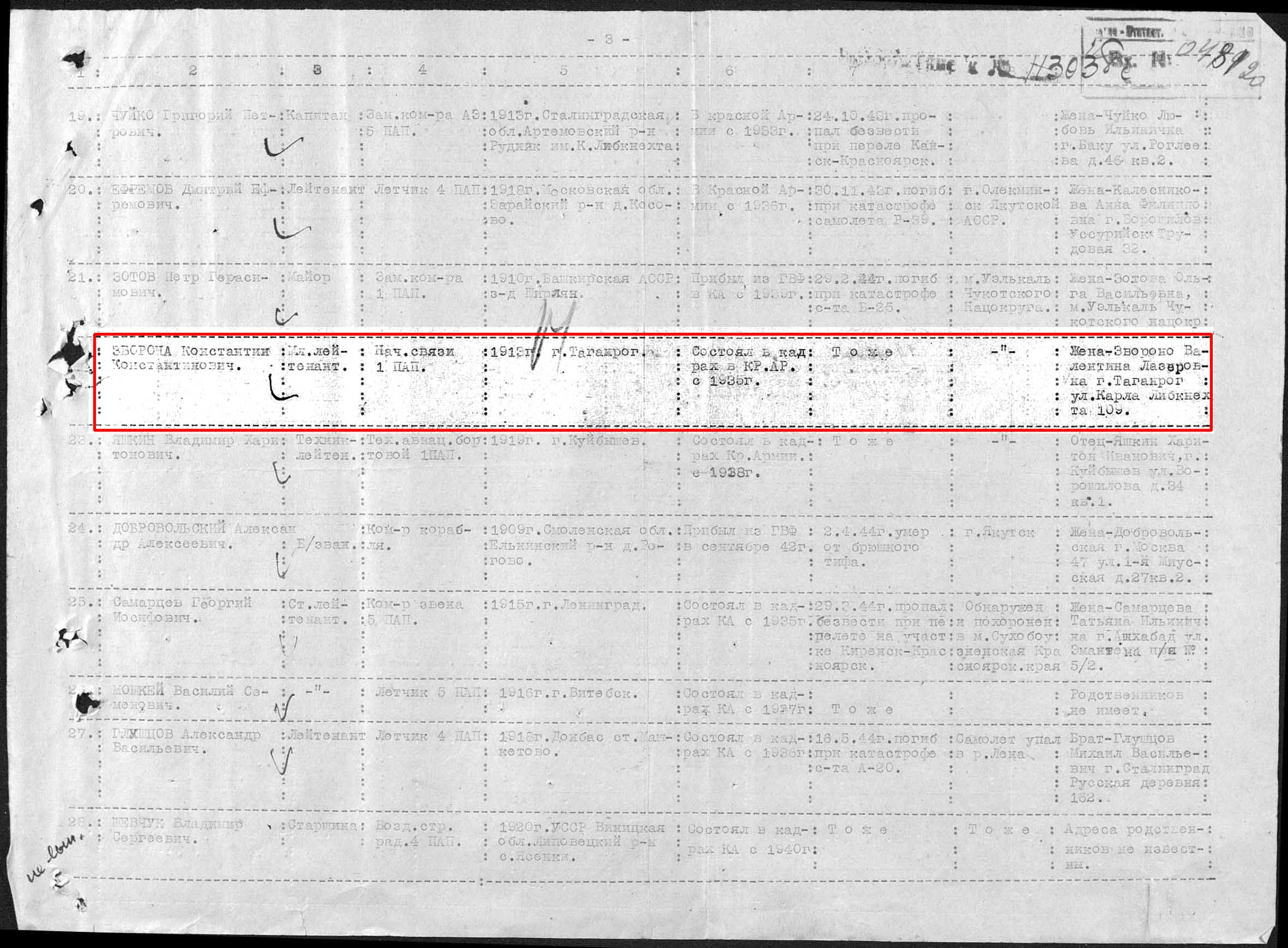 Голубенко Николай Андреевич (лейтенант) – штурман, за недисциплинированность переведен в 3-й ПАП, (2.08.43г за недисциплинированность и пьянку отчислен в распоряжение отдела кадров ВВС СибВО)