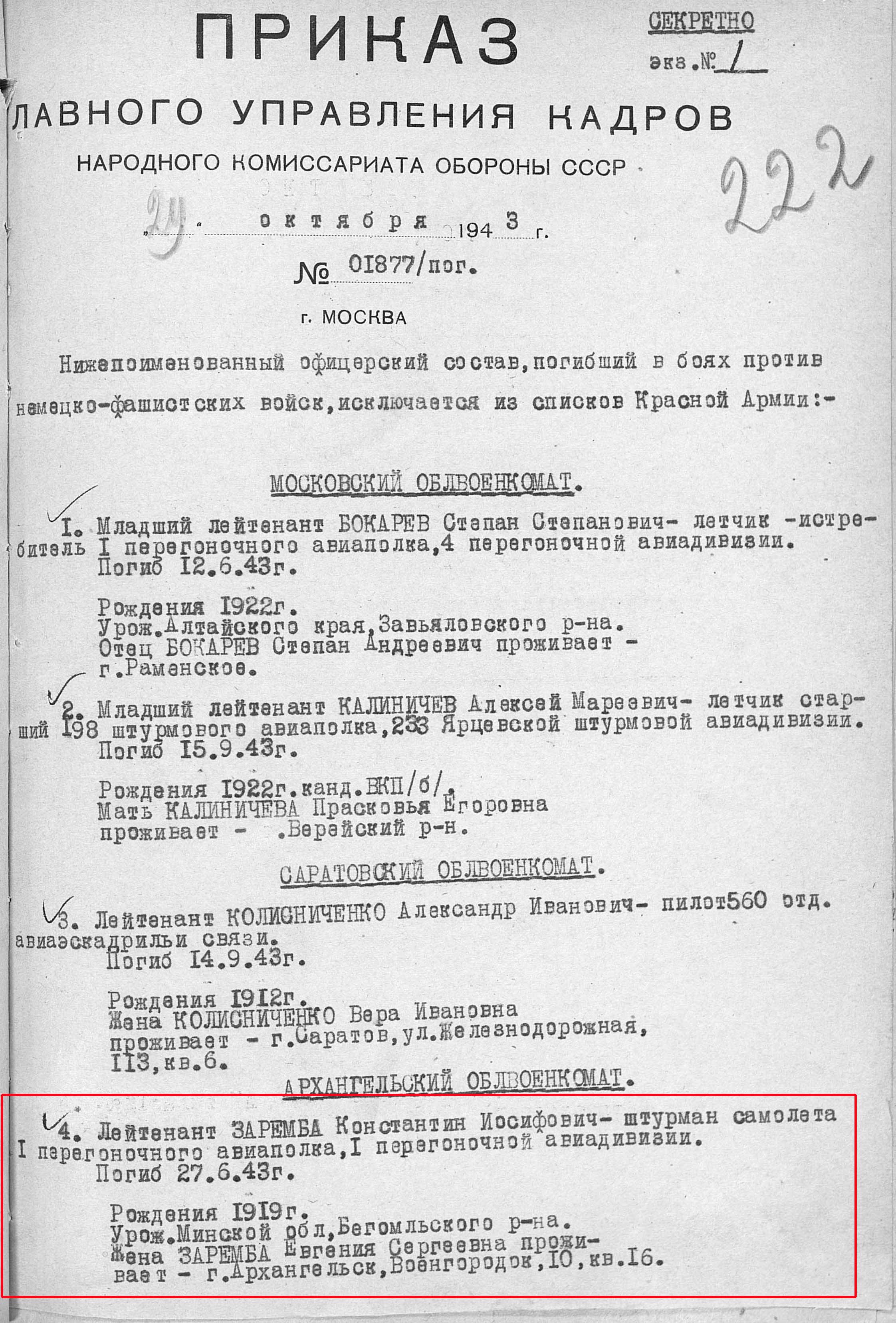 Зарембо Константин Иосифович (лейтенант) - штурман, погиб в катастрофе А-20G 27.06.43г. в составе экипажа капитана Моисеева И.Н. (АК)