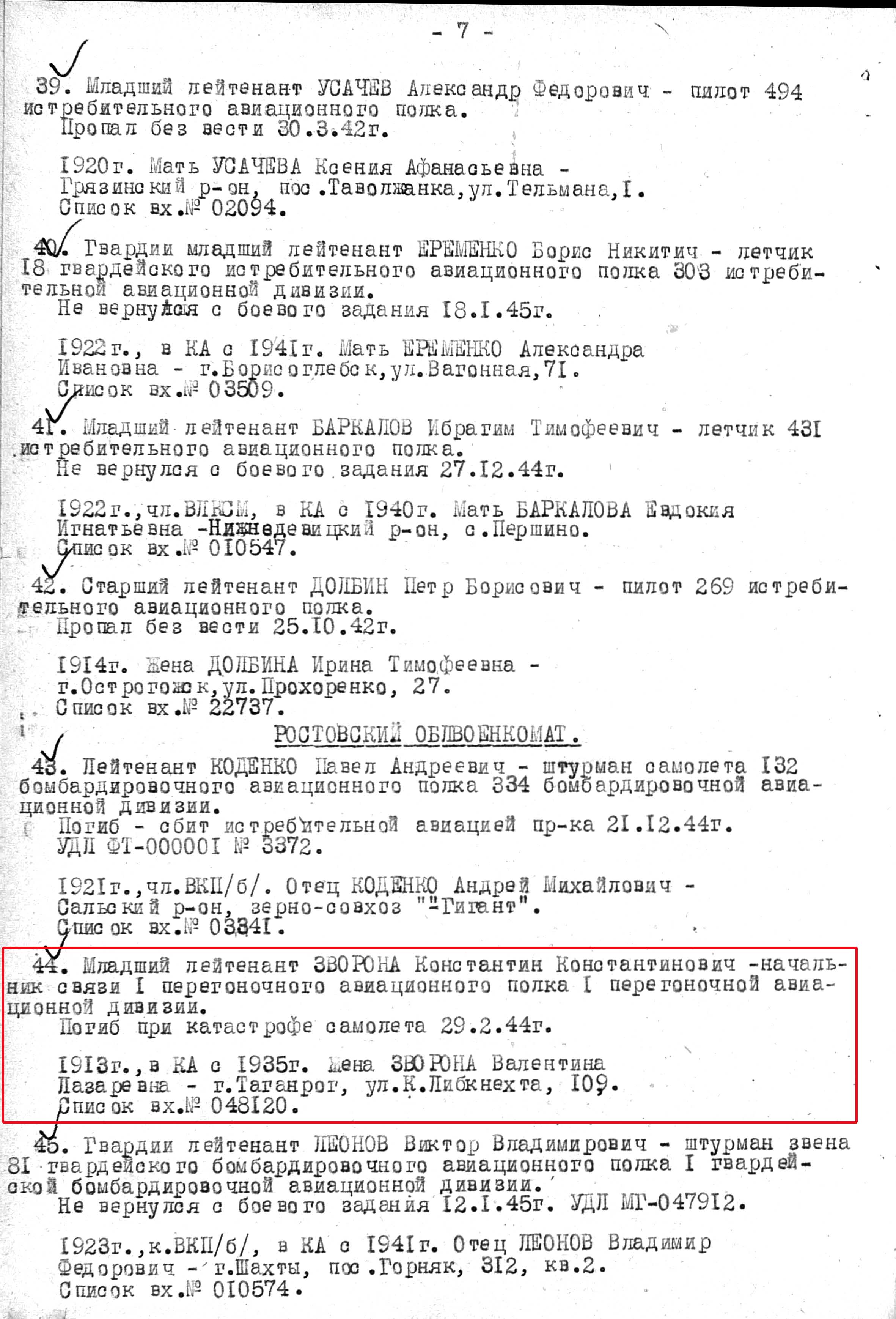 Звороно (Зворона) Константин Константинович (младший лейтенант) – начальник связи 1-го полка, погиб 29.02.44г. в составе экипажа майора Зотова П.Г.(АК)