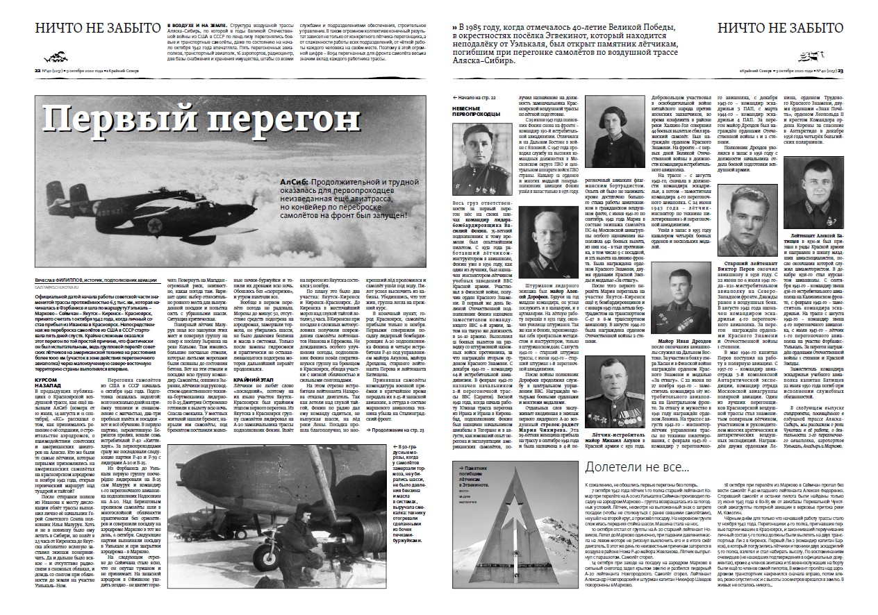 Вот уже в течение пяти лет наш «могучий» тандем двух авиационных инженеров — военного и гражданского, красноярца и якутянина — методично и результативно закрывает «белые пятна» истории авиации северо-востока нашей необъятной Родины, в том числе — истории перегона боевых и транспортных самолётов, поступавших из США в СССР по программе ленд-лиза во время Великой Отечественной войны. История Красноярской воздушной трассы, более известной как АЛСИБ (Аляска — Сибирь), зацепила сильнее других тем своей необычностью, множеством нестандартных организационных и административных решений, множеством ярчайших примеров массового трудового героизма, высочайшим профессионализмом и самопожертвованием простых советских людей, достойно выполнявших свой патриотический долг во имя Победы, во имя жизни и мира на земле. Не зря вылет на перегон приравнивался к боевому вылету и не зря за работу в тылу награждали боевыми орденами и медалями. Более 8000 самолётов для фронта — огромная цифра! Но всё это мы и наши предшественники смогли узнать и донести до наших читателей далеко не сразу — многие годы этому мешали грифы «секретно» и «совершенно секретно» на большинстве документов, связанных с работой Красноярской воздушной трассы. Когда открылись архивы, стали появляться статьи, а потом и книги. Книг немного, выходили они небольшими тиражами, в большинстве случаев частным порядком. Но благодаря этому история трассы стала известна большему количеству людей, откликнулись ветераны трассы и их родственники. Юбилеи трассы стали отмечаться в Якутске, Иркутске, Красноярске, Москве. И вот уже 2017 год — 75-летие первого перегона по трассе Аляска — Сибирь: первая партия самолётов из США приземлилась на Красноярском аэродроме 11 ноября 1942 года.