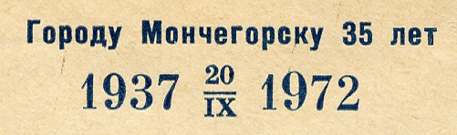 Клубная надпечатка: "Городу Мончегорску 35 лет 1937 20/IX 1972" Мончегорск отд ВОФ тираж 150 шт