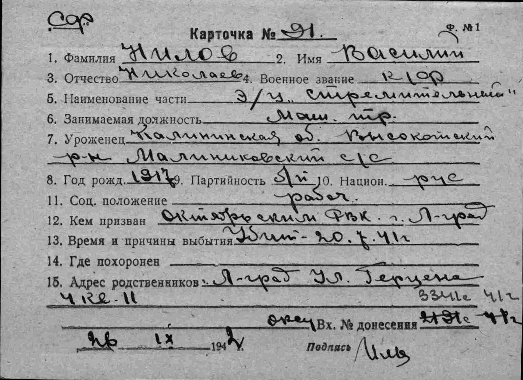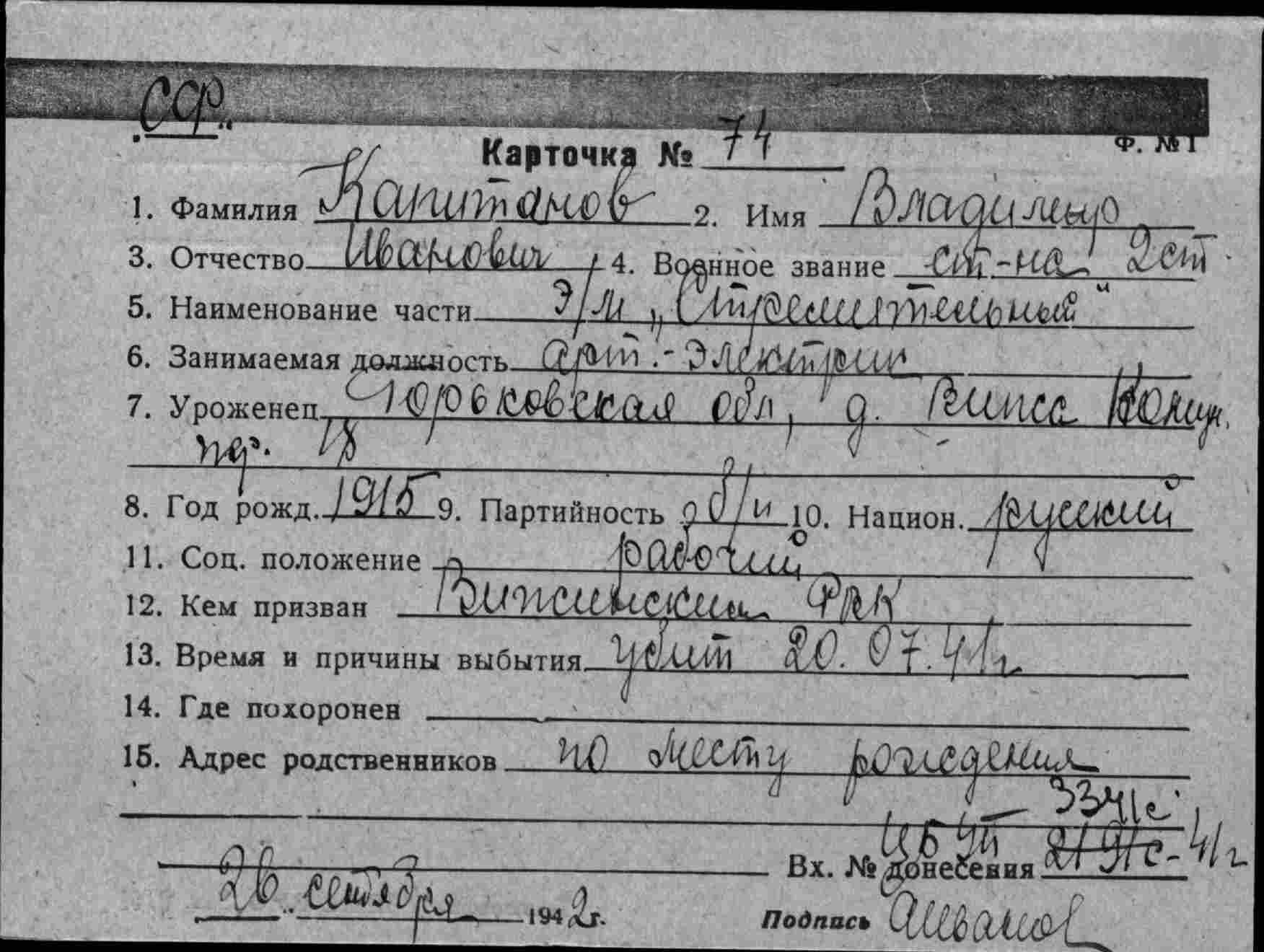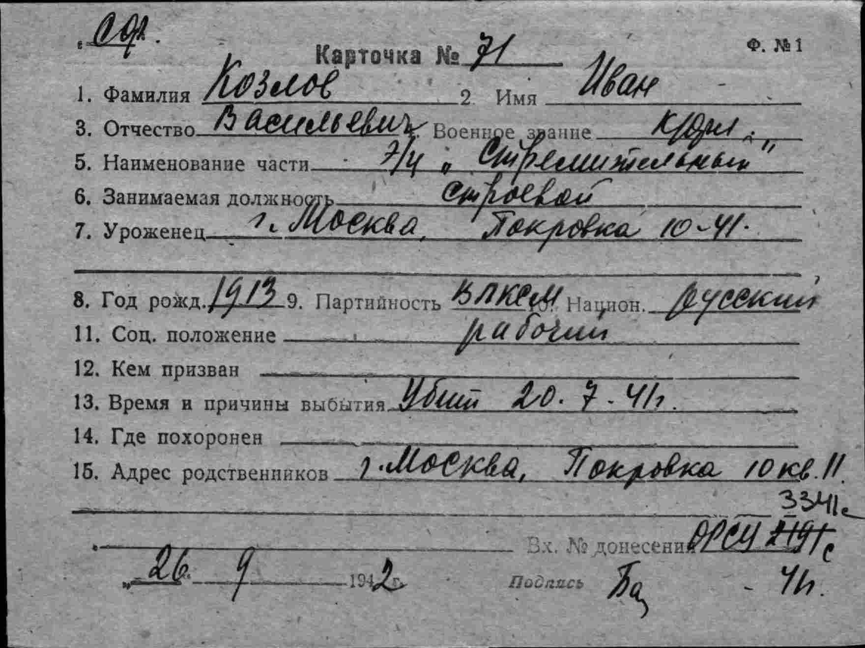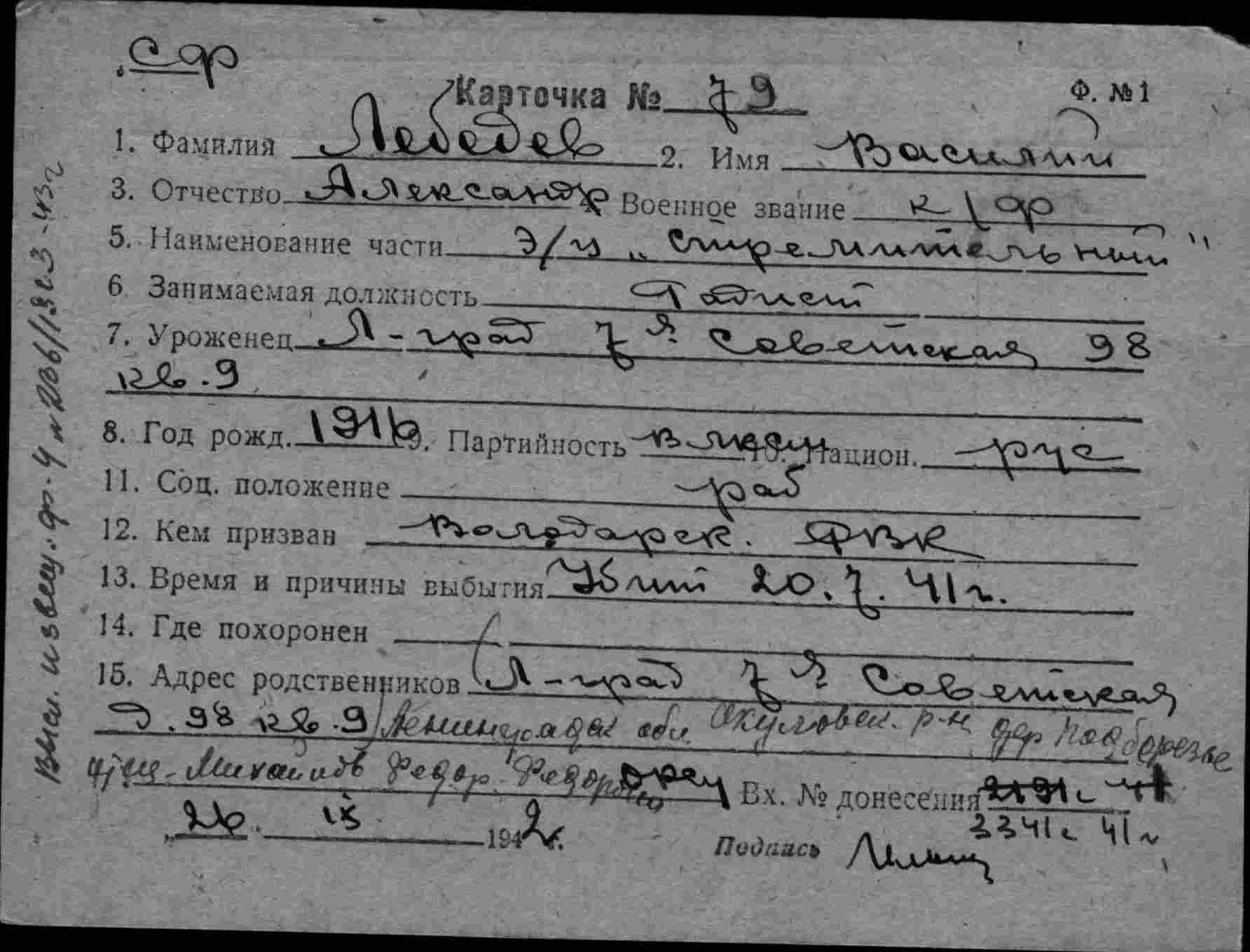 Дата выбытия 20.07.1941
