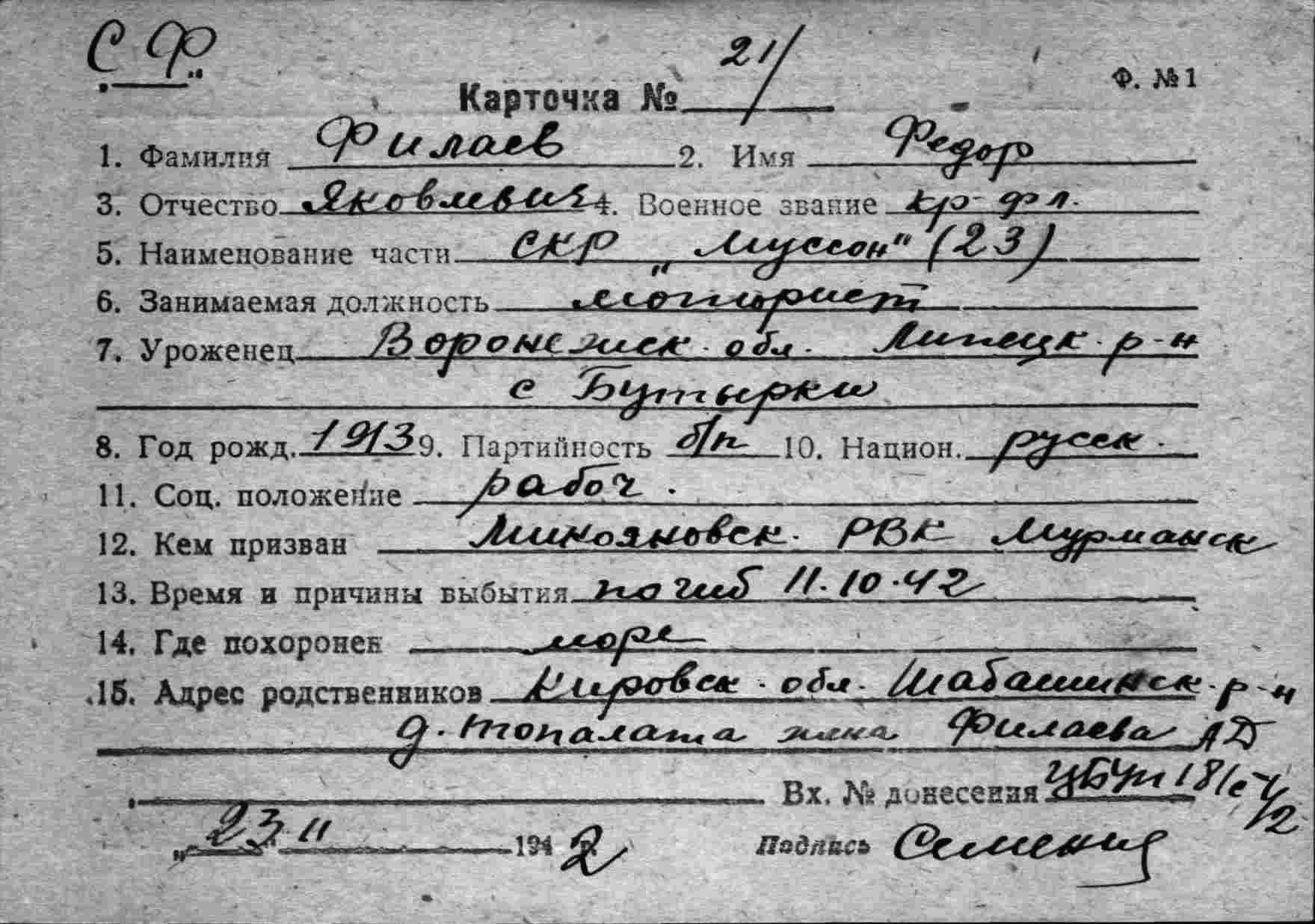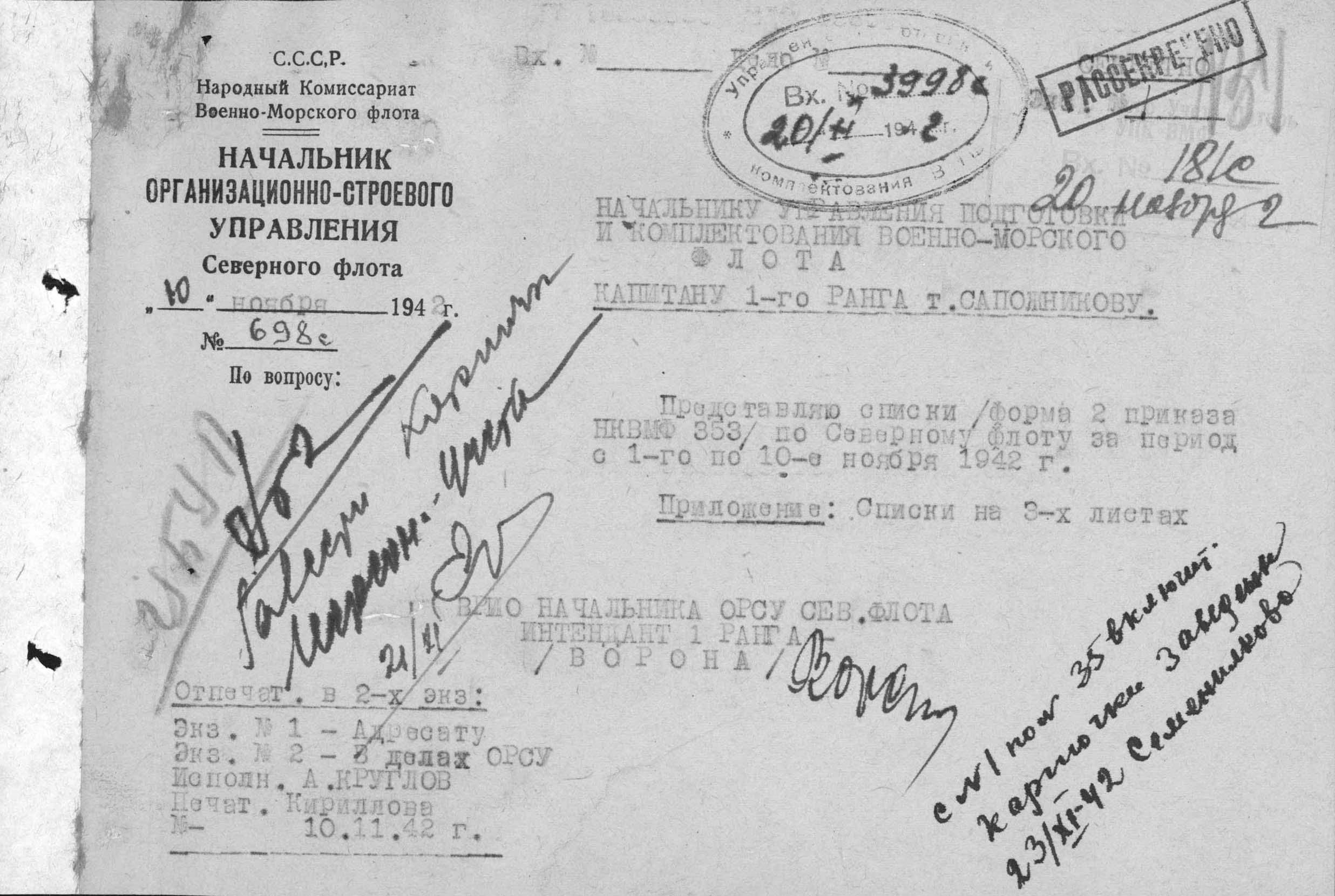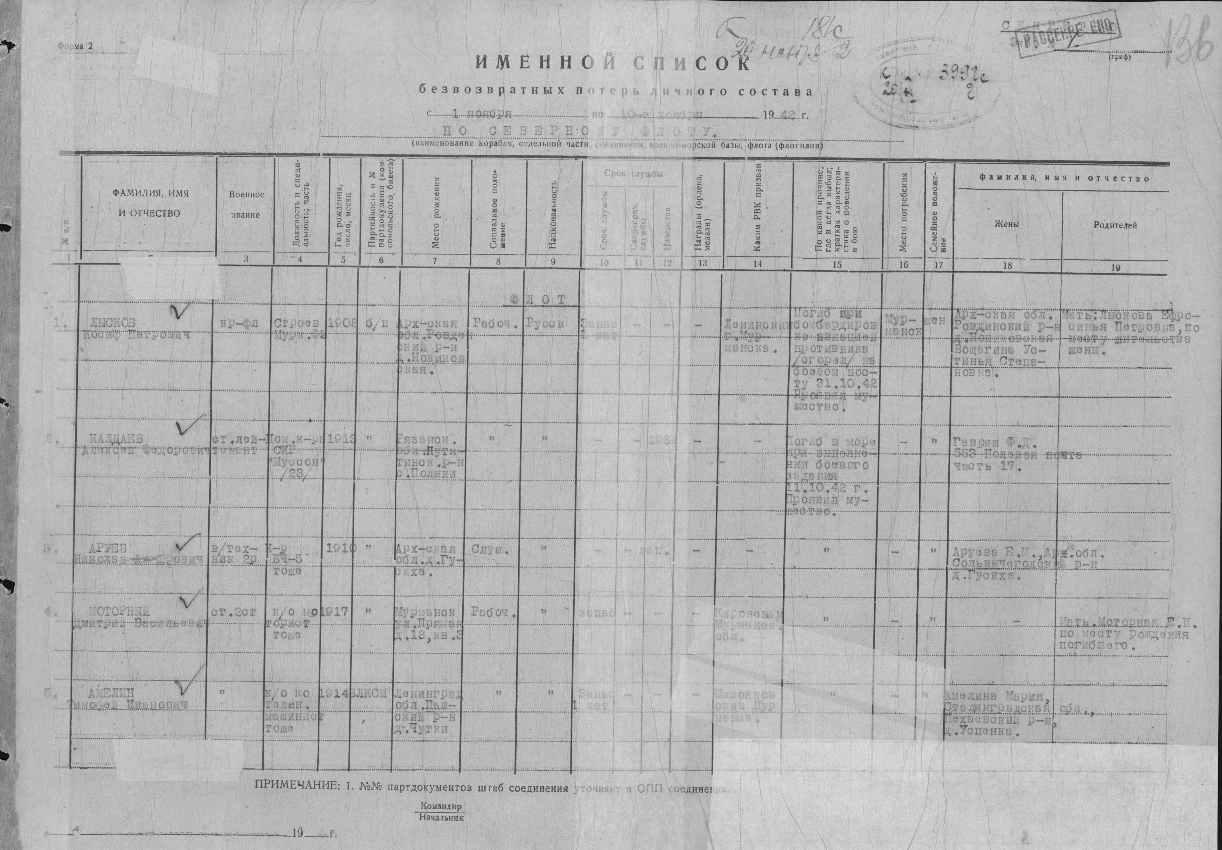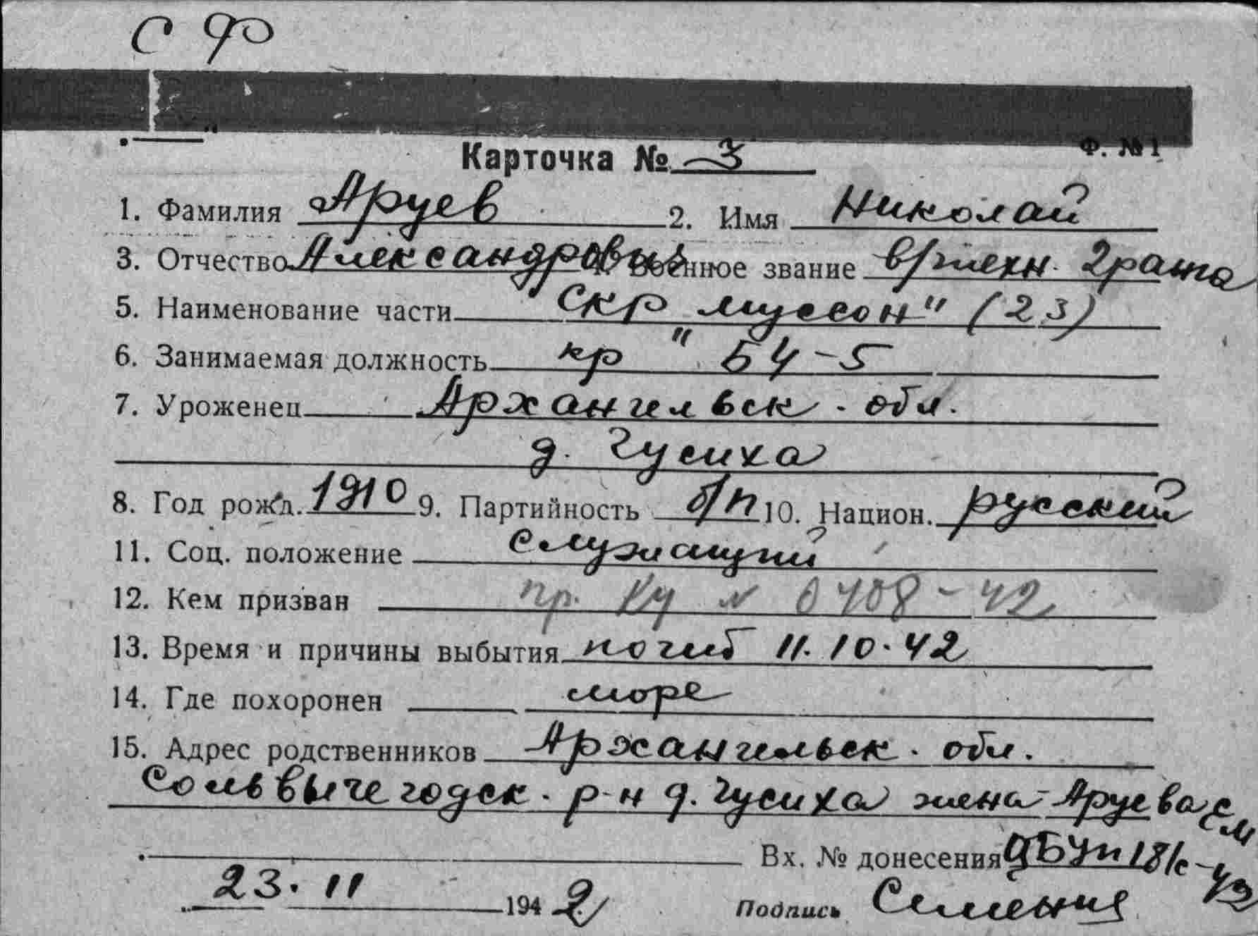 Донесения о безвозвратных потерях №12669 19.11.1942 КО СФ.