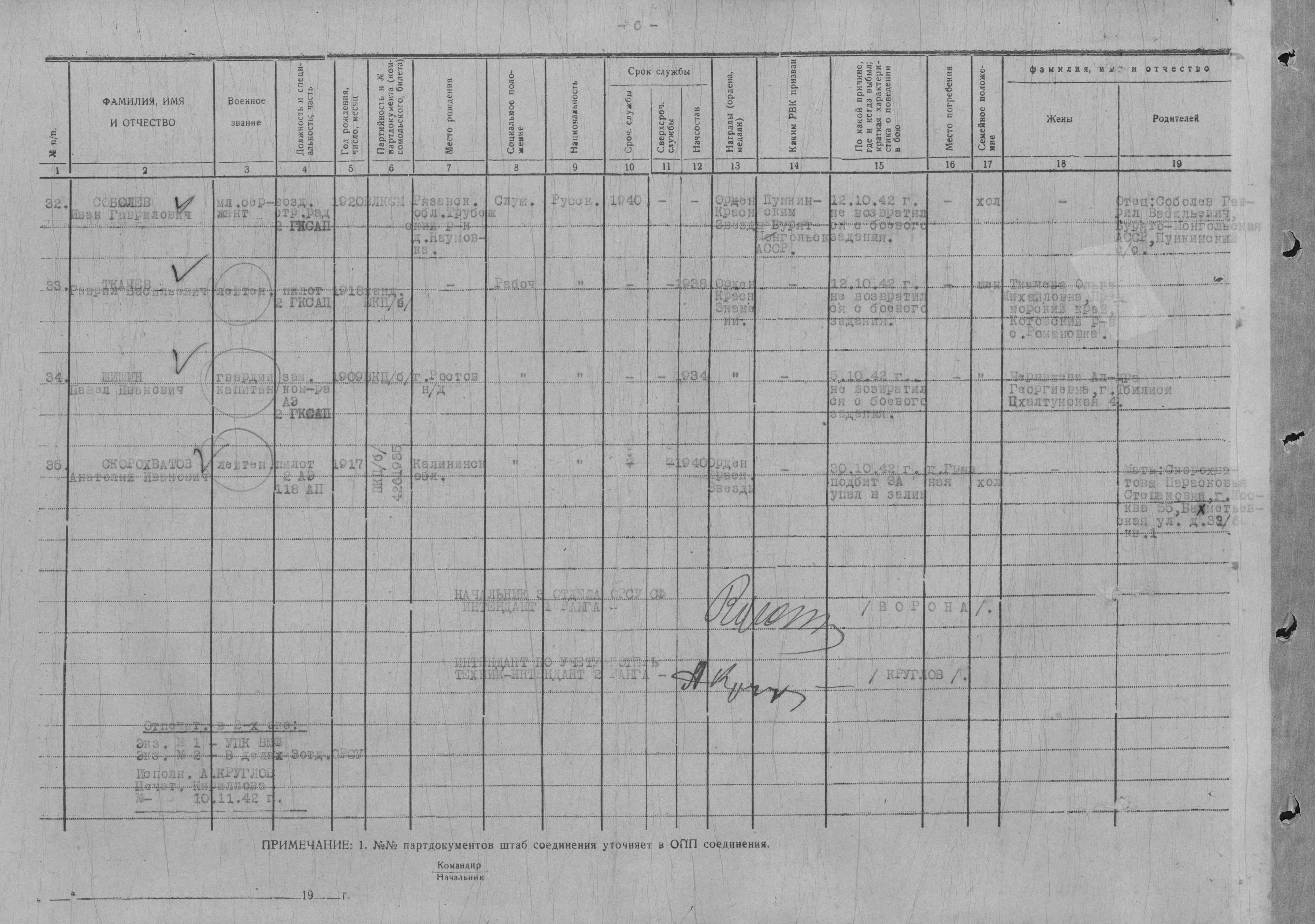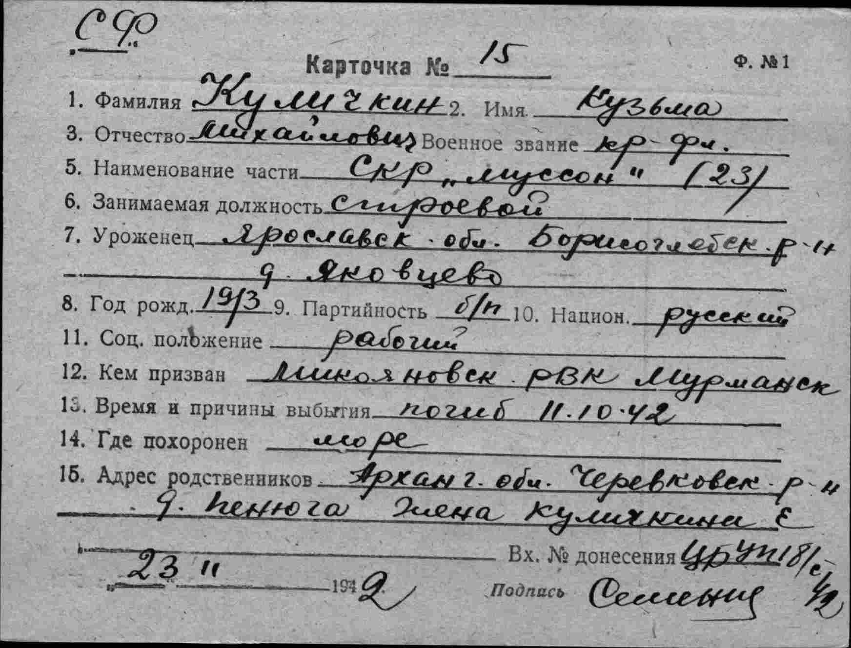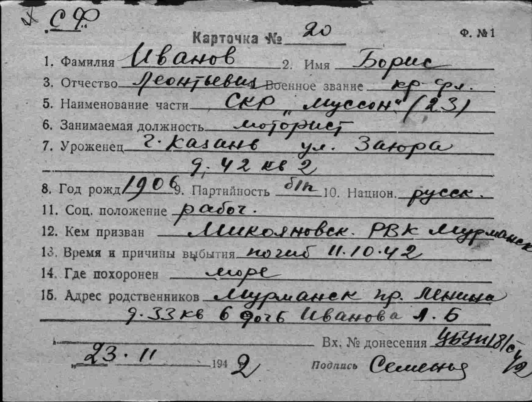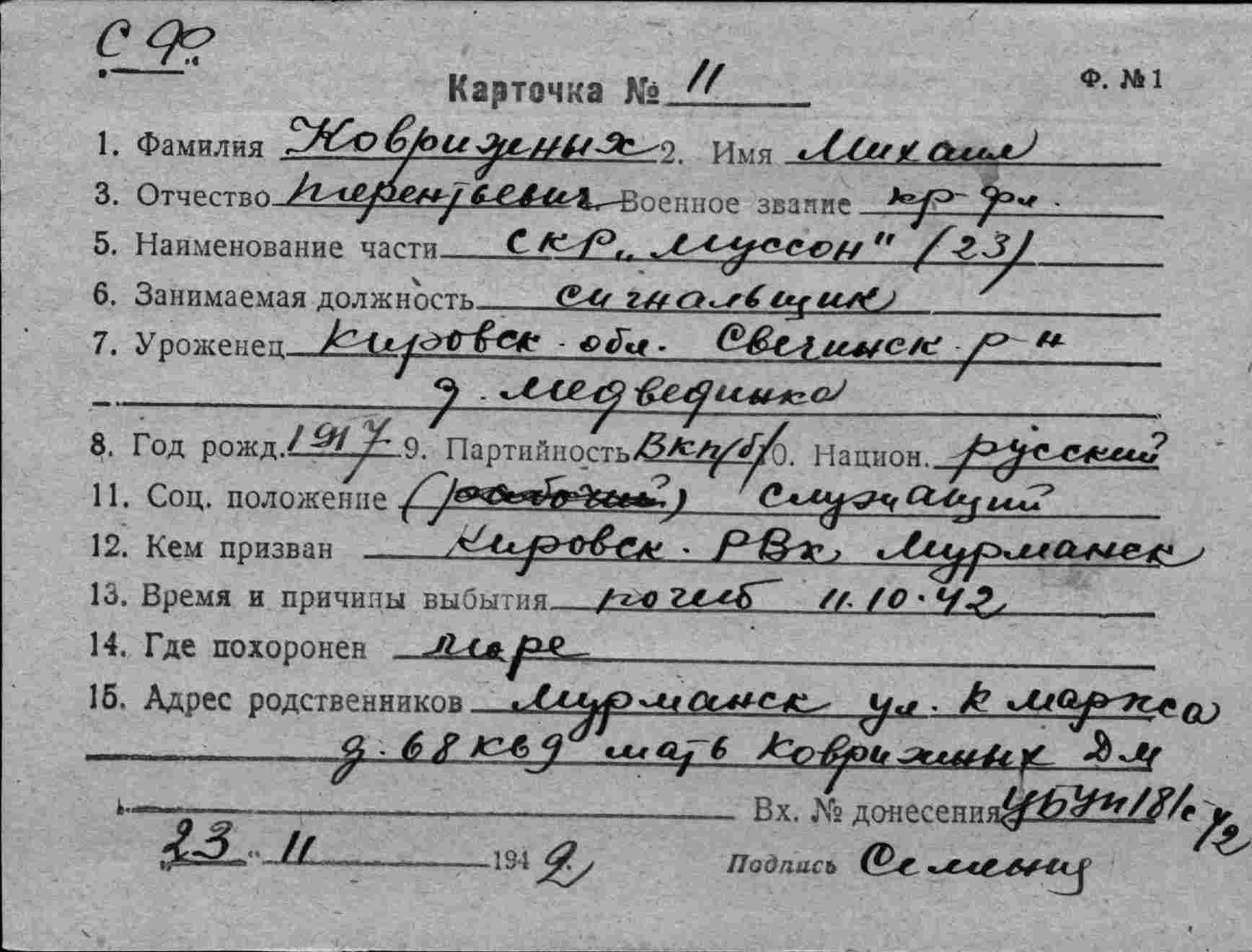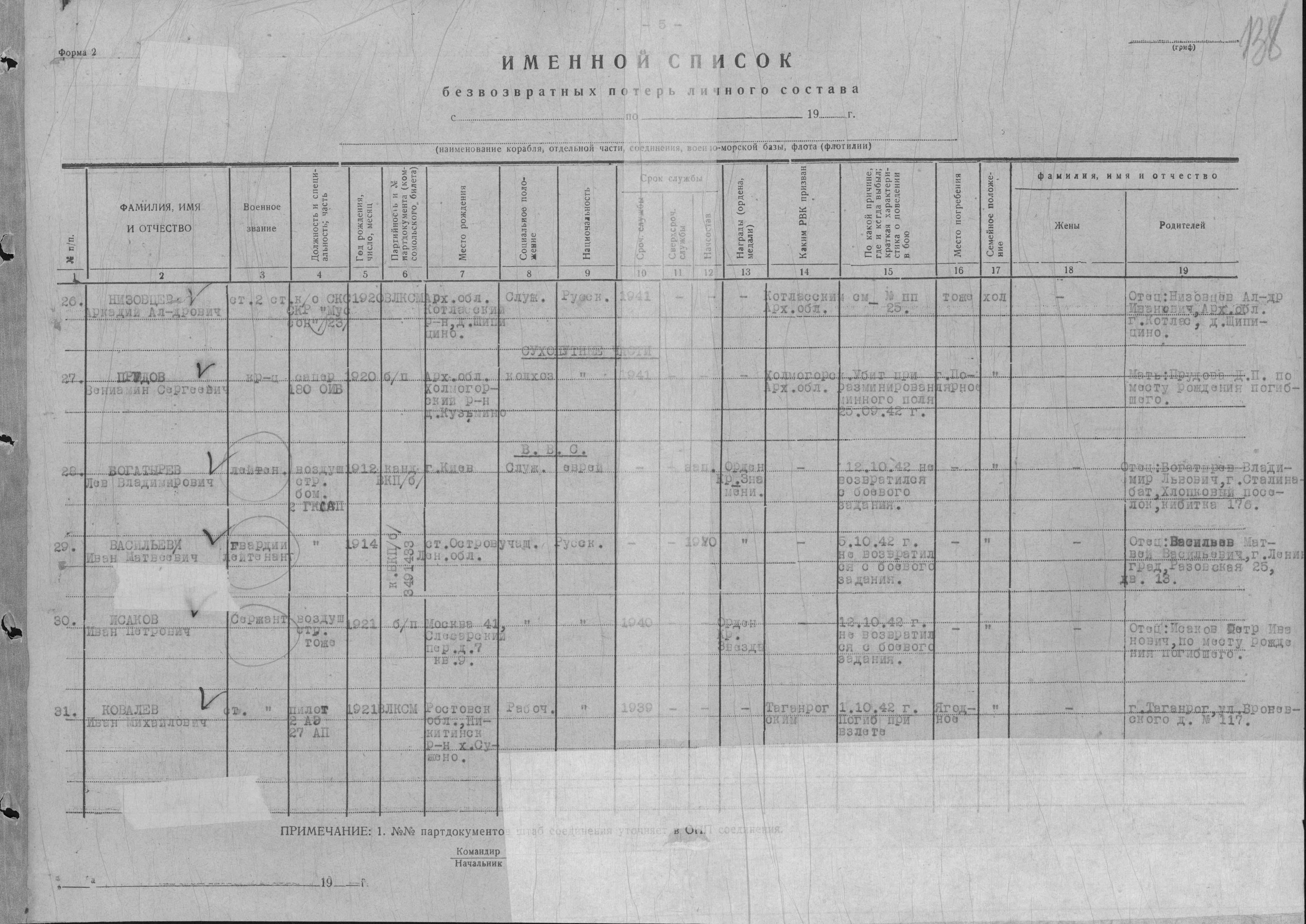 Донесения о безвозвратных потерях №12669 19.11.1942 КО СФ.