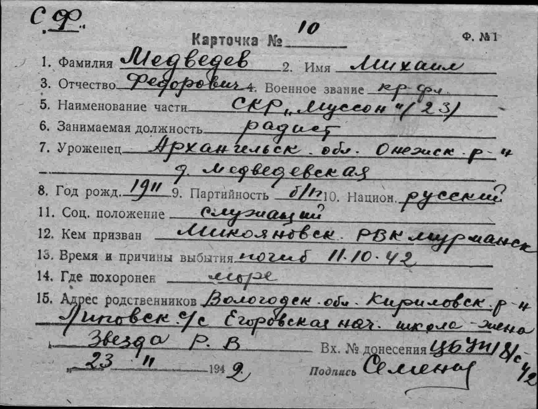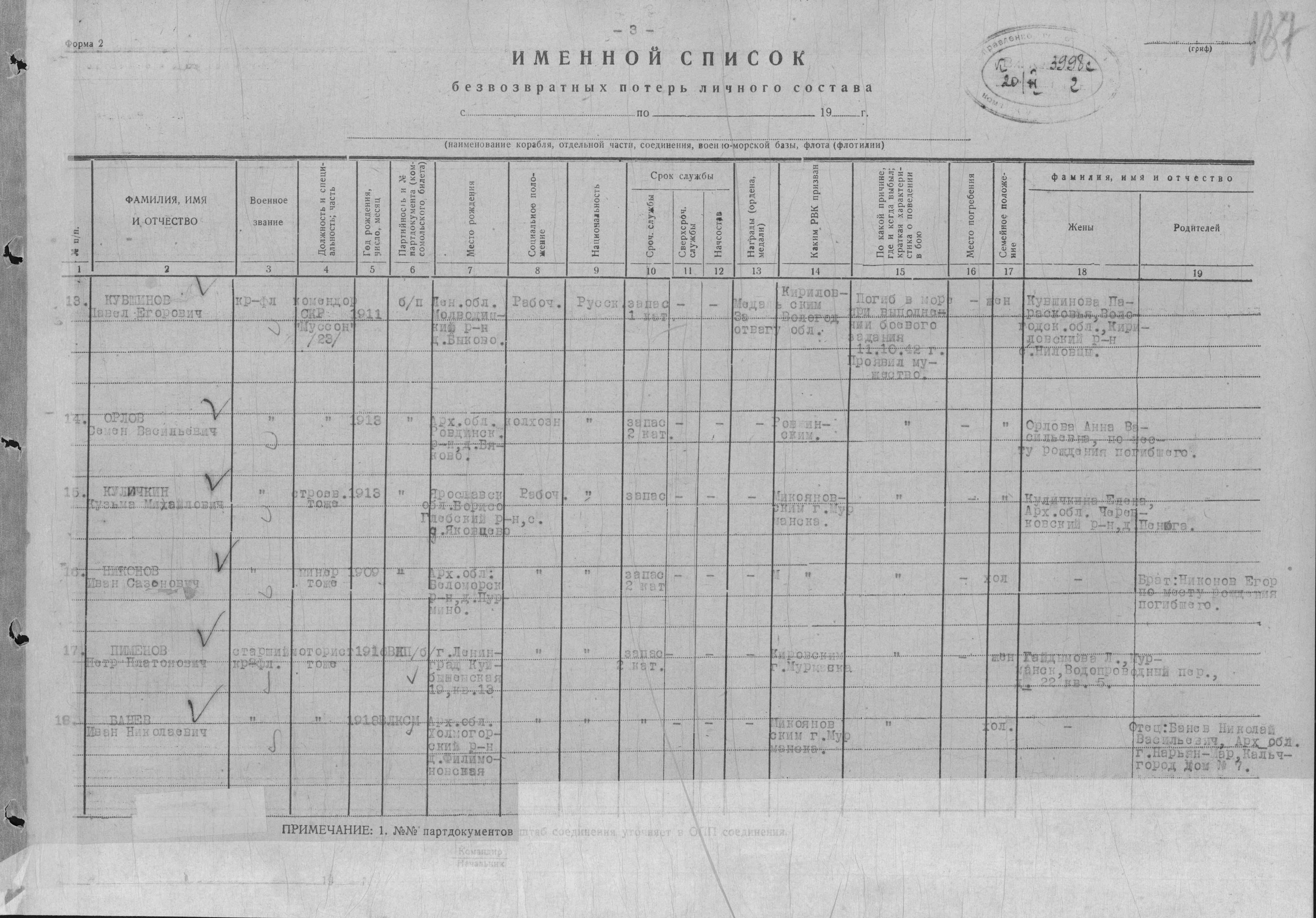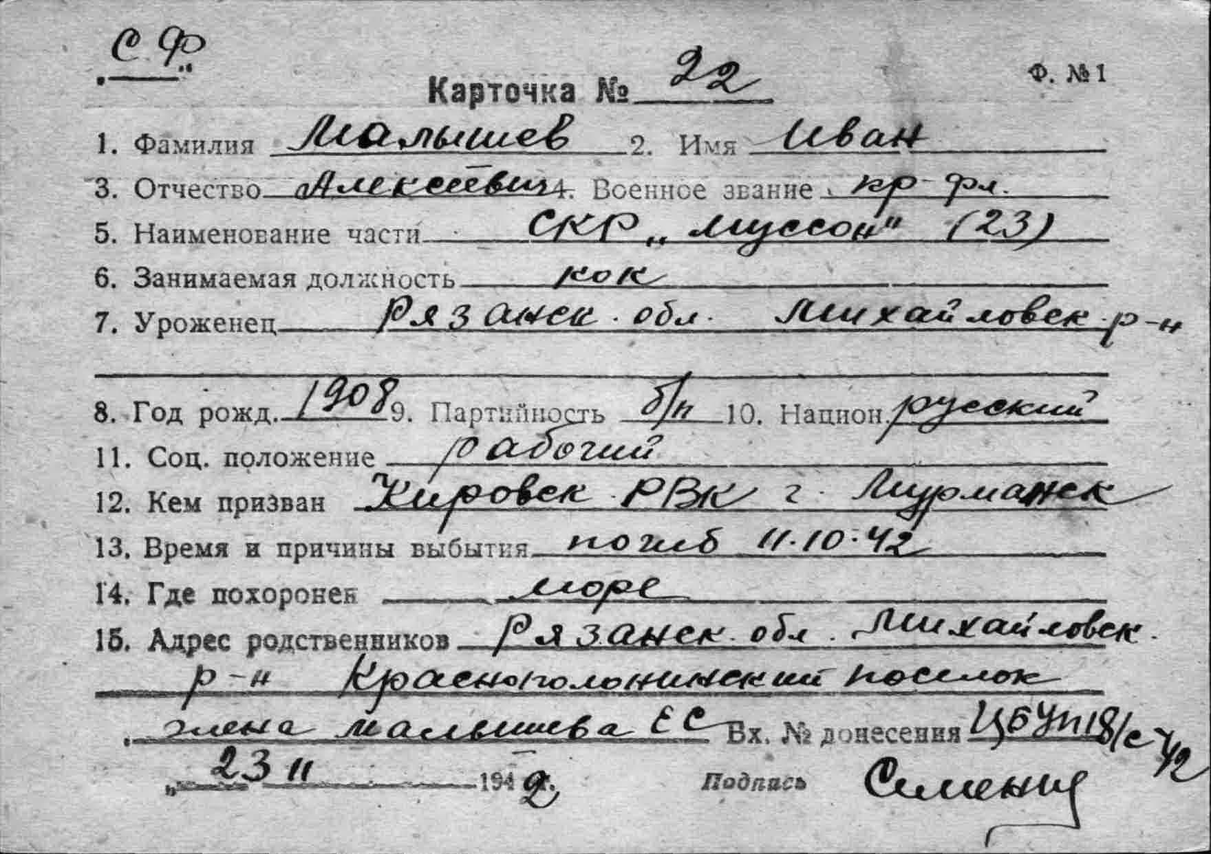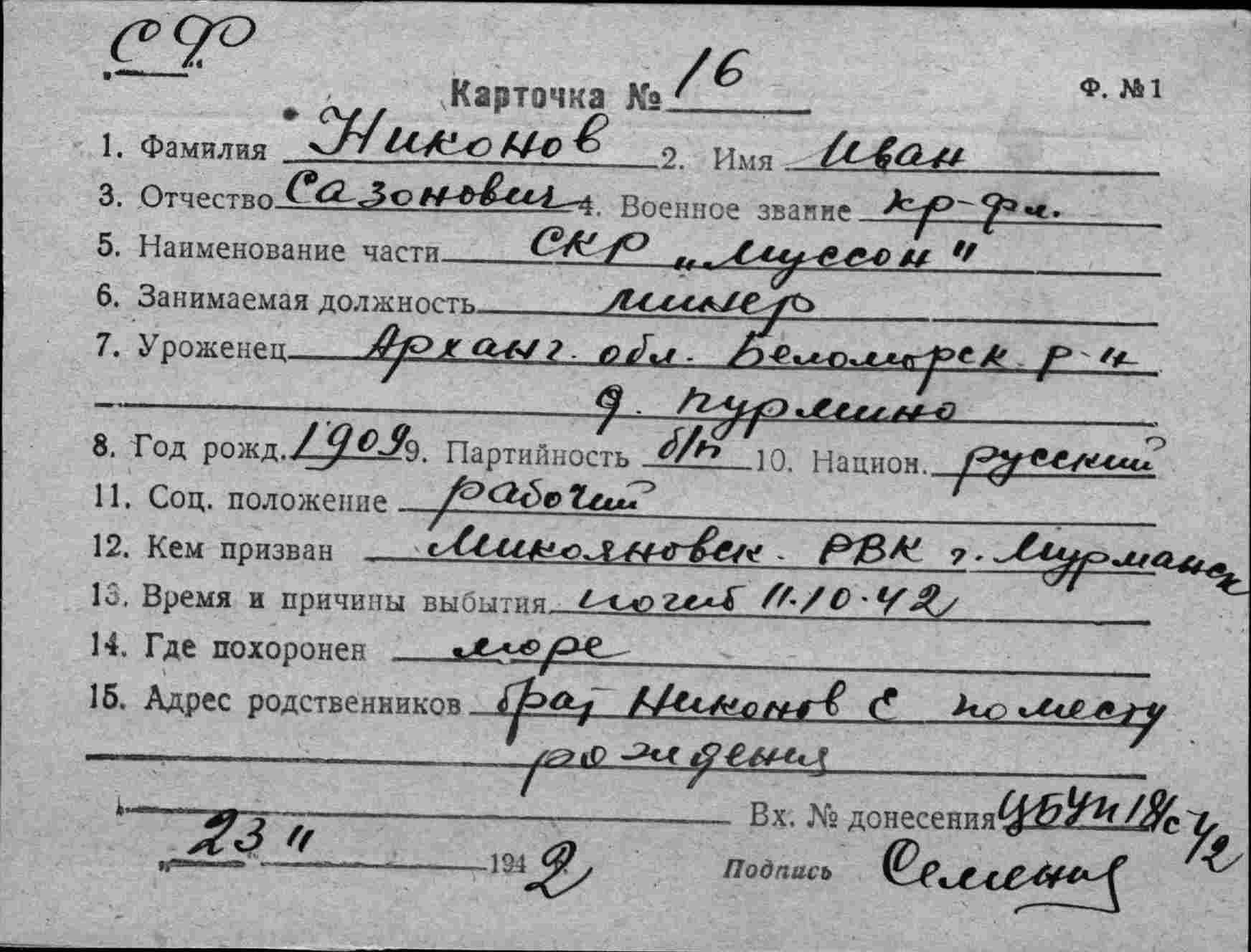 25. Низовцев Аркадий Александрович,старшина 2 ст.,к/о СКС,1920,Архангельская обл., Котласский р-н., д.Шипицино,умер от ранения 11.10.42, похоронен Новая Земля, Маточкин Шар.