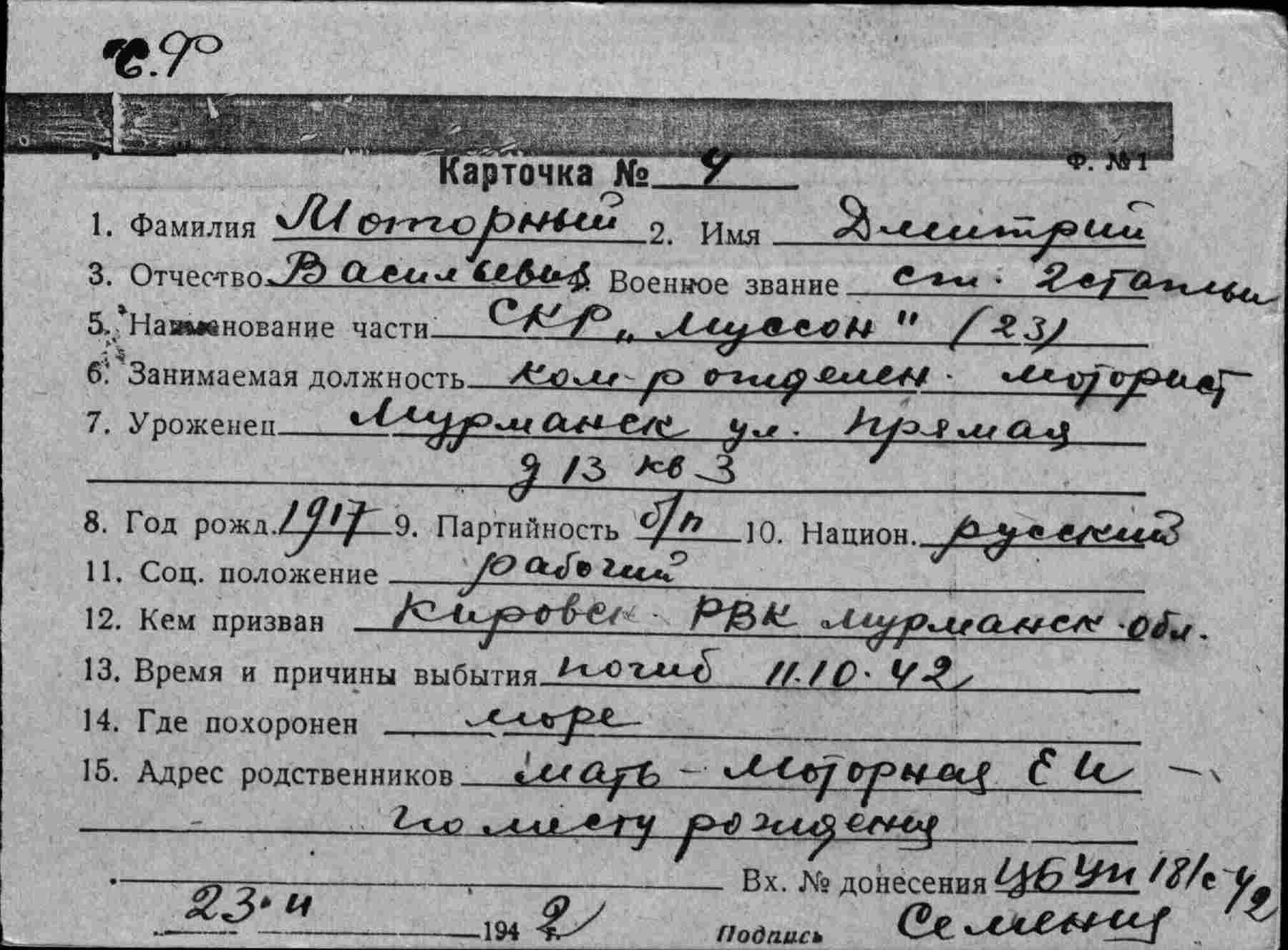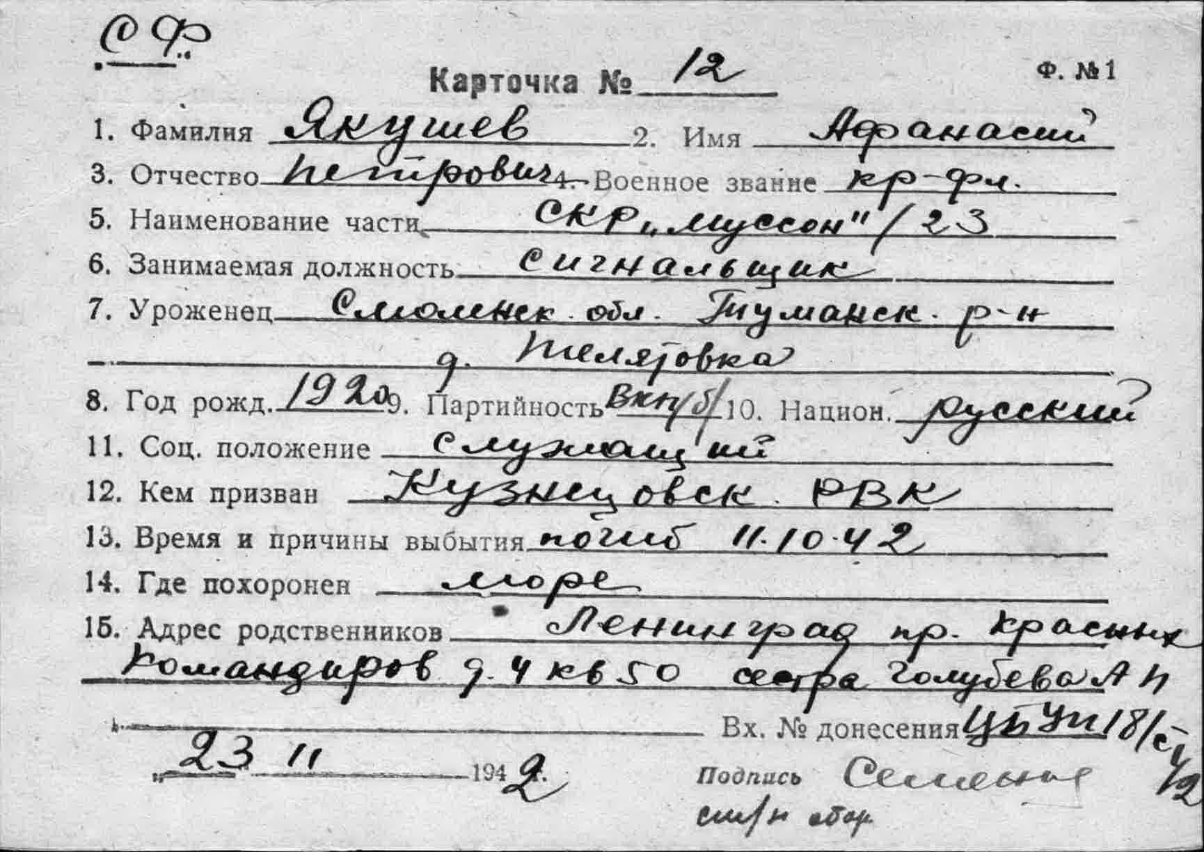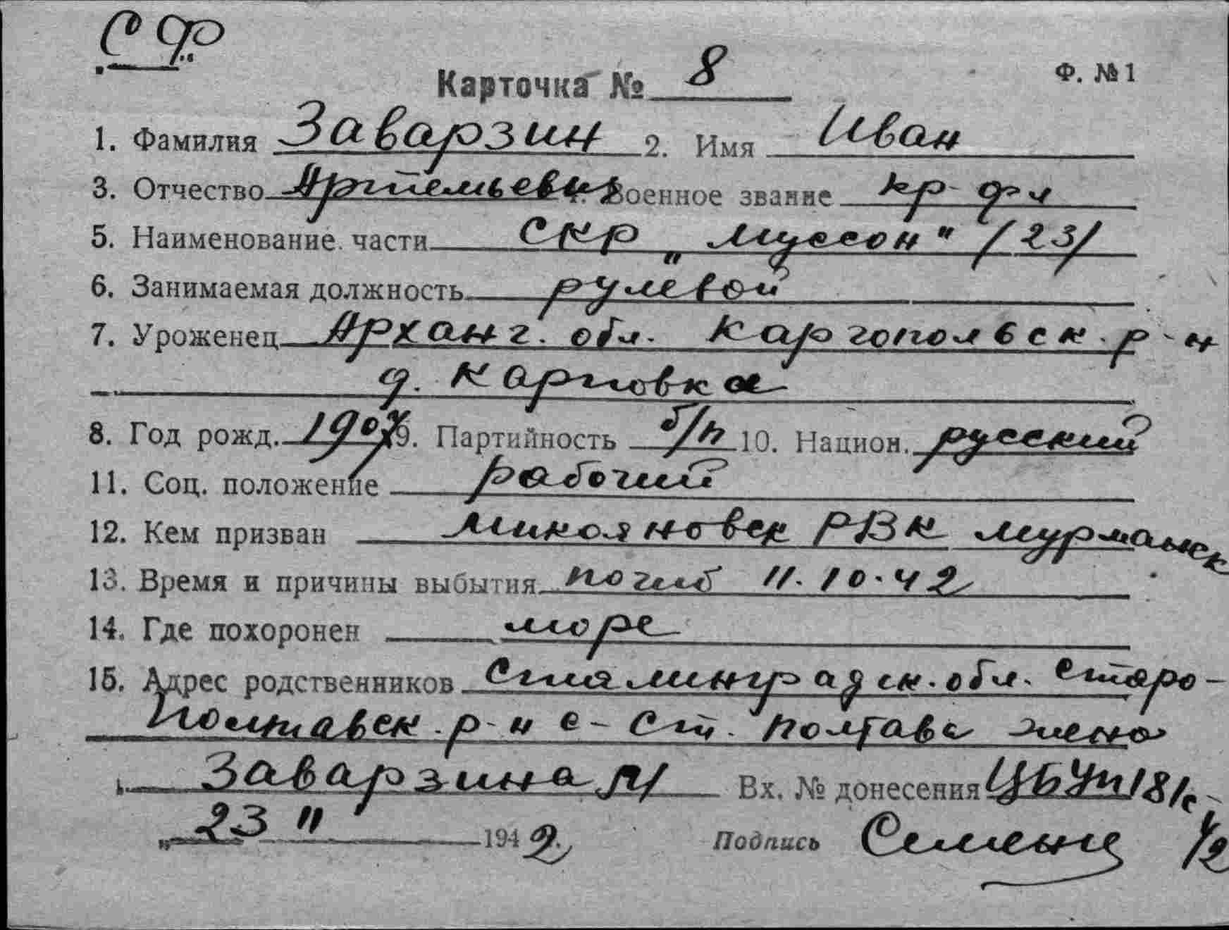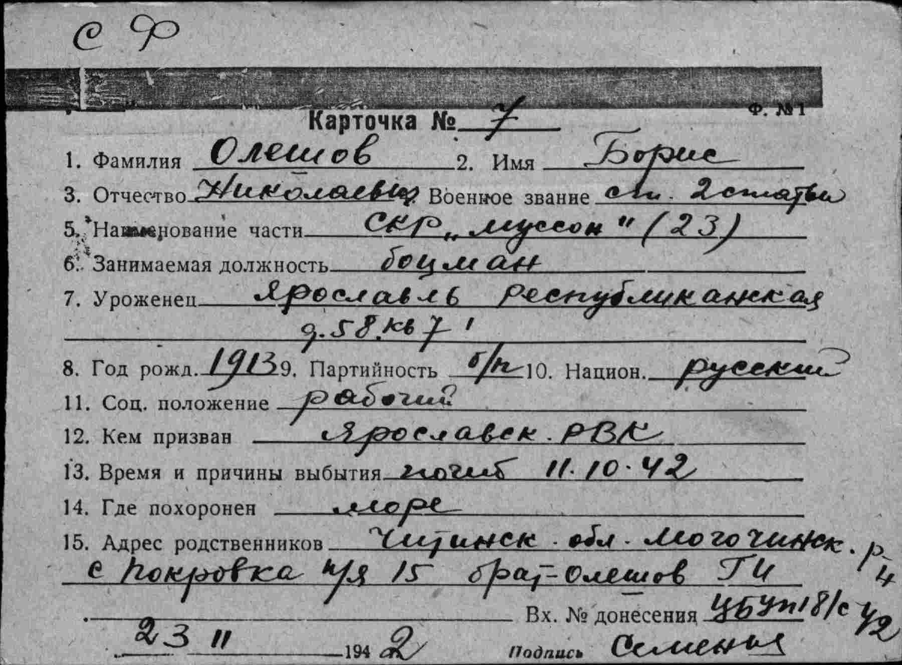 Список членов экипажа СКР-23 "Муссон" погибших 11 октября 1942 г. в пр. Маточкин Шар
