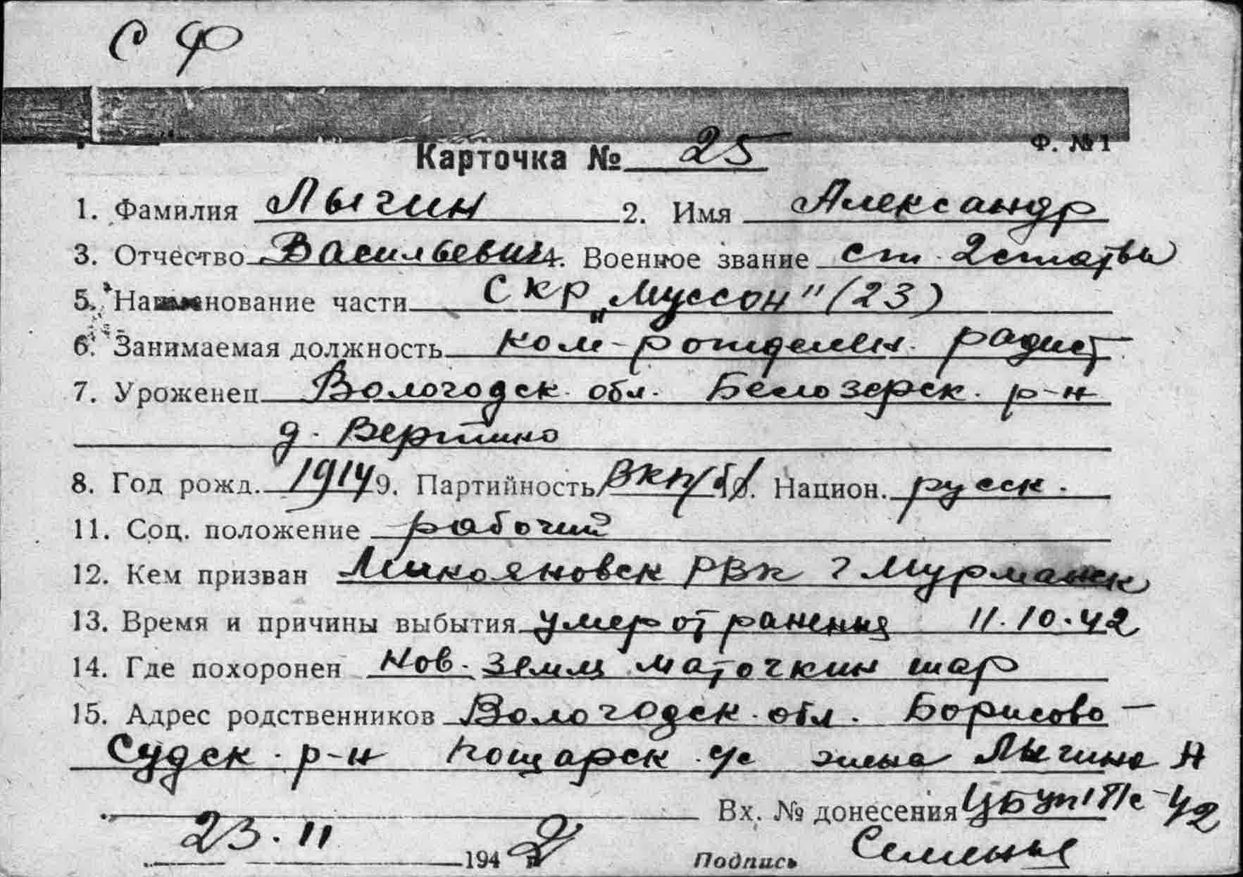 24. Лыгин Александр Васильевич,старшина 2 ст.,к/о радист,1914,Вологодская обл., Белозерский р-н., д.Вертино,умер от ранения 11.10.42, похоронен Новая Земля, Маточкин Шар.