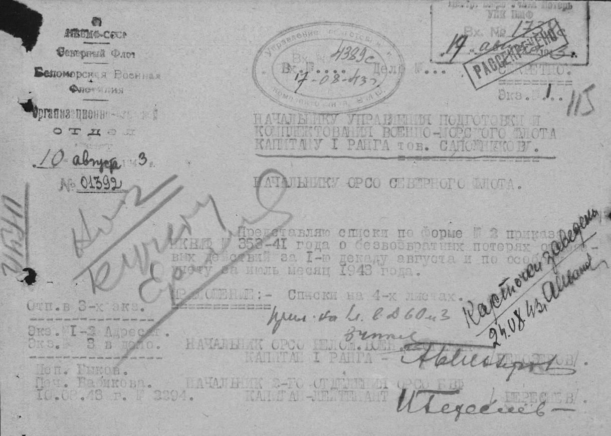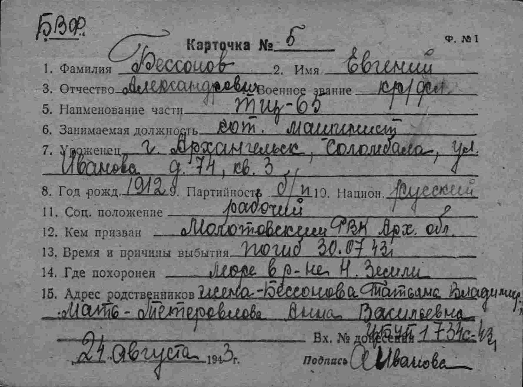 Наконец, еще уточнение. В списке погибших моряков минного тральщика Т-911 мы находим имя краснофлотца Е. А. Бессонова, котельного машиниста этого корабля. Он тоже уроженец Архангельска, до войны некоторое время жил в Соломбале, но, в отличие от остальных членов экипажа «Астрахани», единственный, кто был призван во флот молотовским военкоматом. В Книге памяти, изданной в Северодвинске к 50-летию Победы, указывается, что матрос Евгений Александрович Бессонов «погиб 30 июля 1943 года в районе Новой Земли». В следующем издании Книги теперь можно внести уточнение, координаты его гибели — Баренцево море, 70 градусов 07 северной широты и 51 градус 50 восточной долготы.