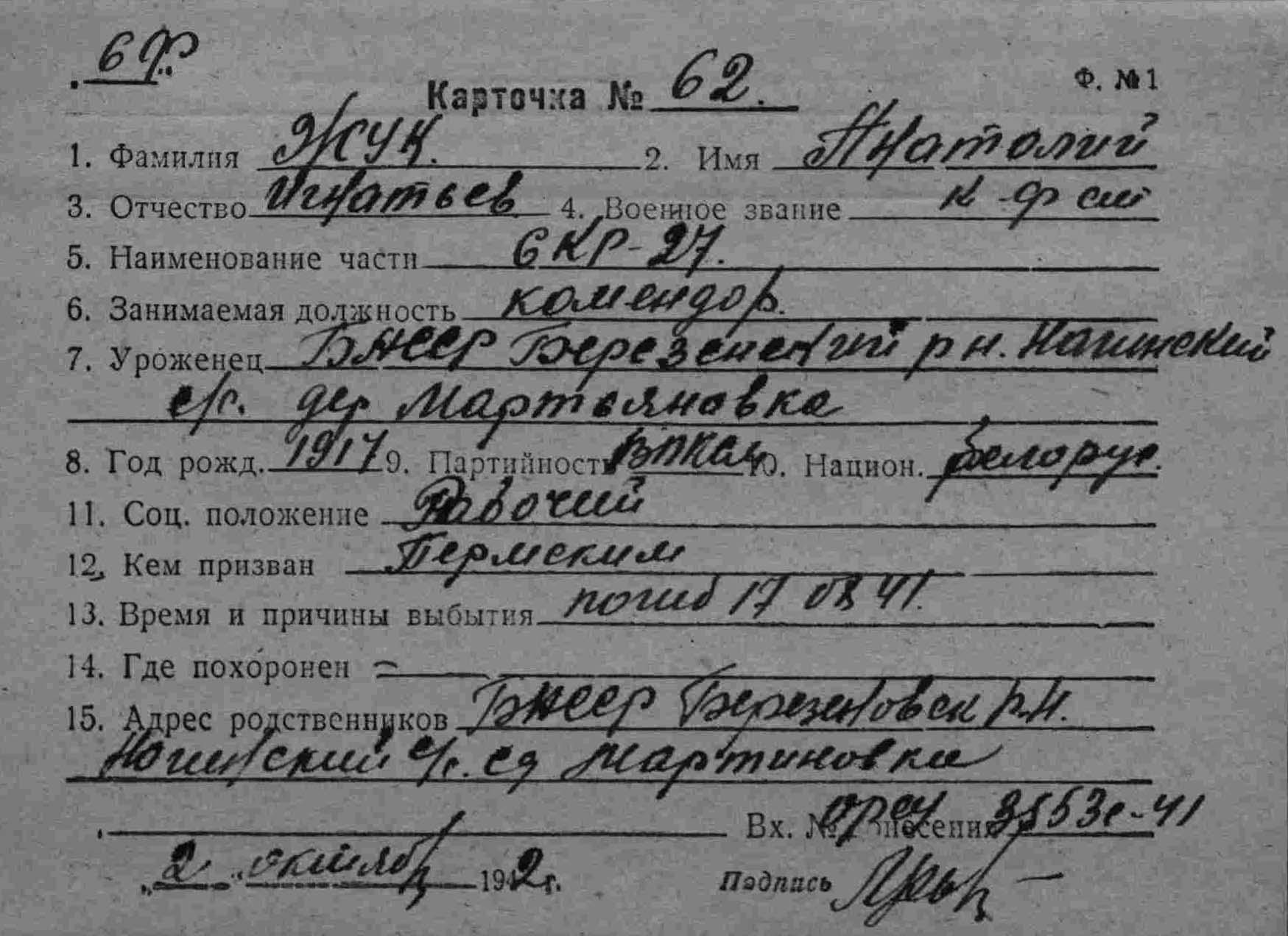 Место рождения Белорусская ССР, Брестская обл., Березовский р-н, Нагинский с/с, д. Мартьяновка