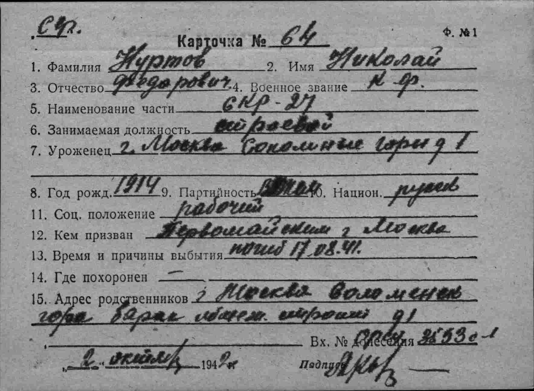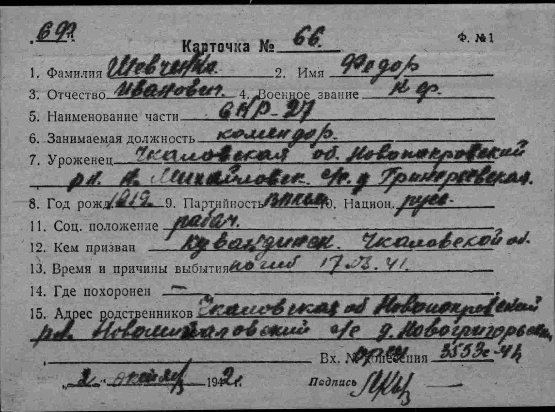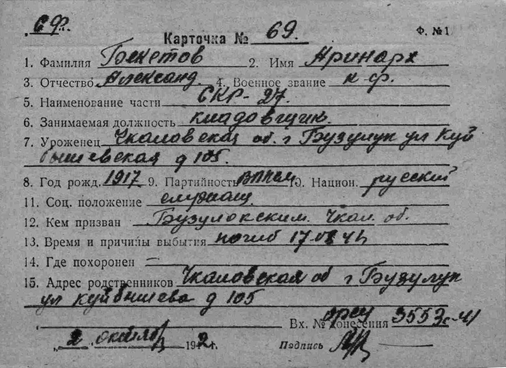 Дата и место призыва Кировский РВК, Чкаловская обл., г. Чкалов, Кировский р-н