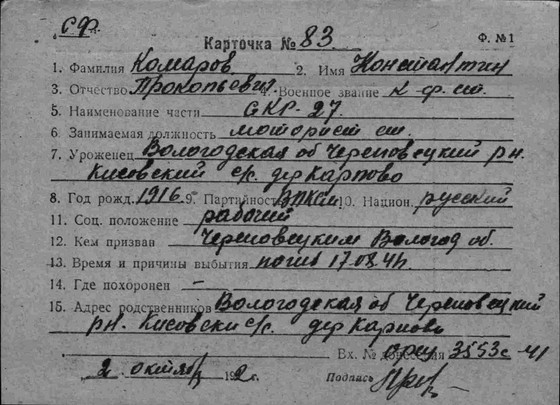 Дата и место призыва Череповецкий РВК, Вологодская обл., Череповецкий р-н
