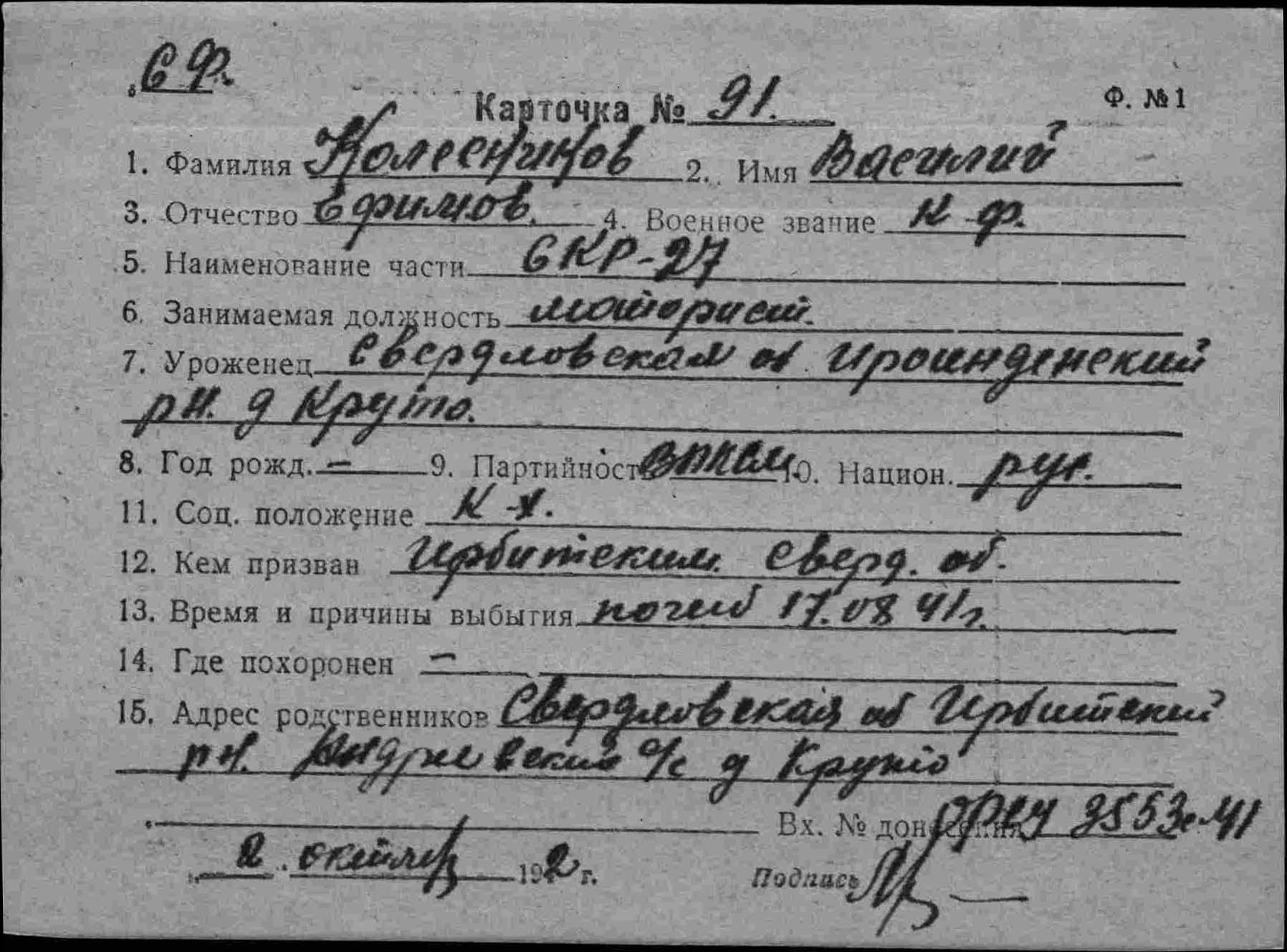 Дата и место призыва Ирбитский РВК, Свердловская обл., Ирбитский р-н
