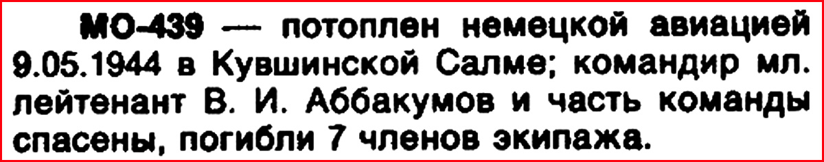 МО-439 — потоплен немецкой авиацией 9.05.1944 в Кувшинской Салме; командир мл.лейтенант В. И. Аббакумов и часть команды спасены, погибли 7 членов экипажа.