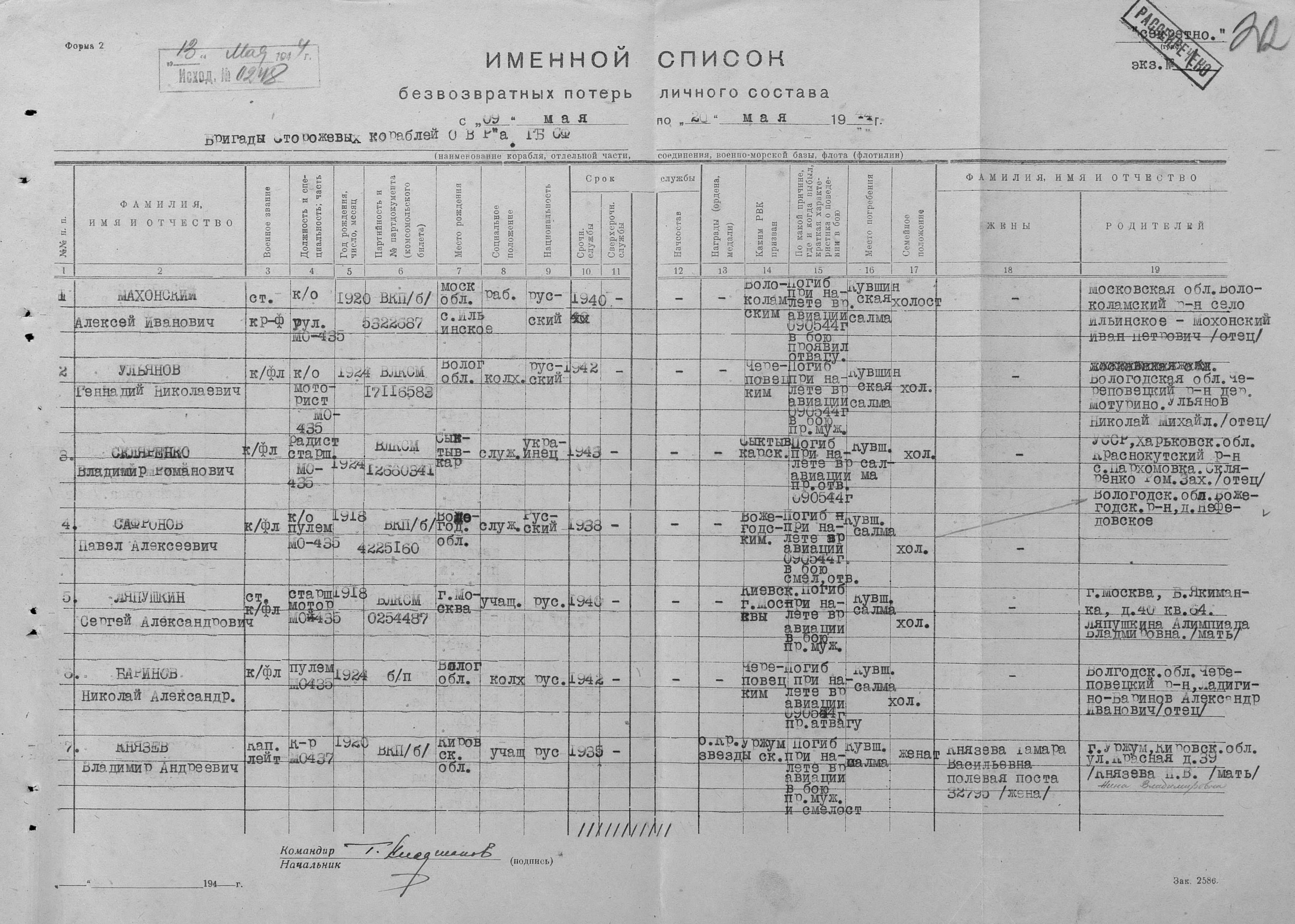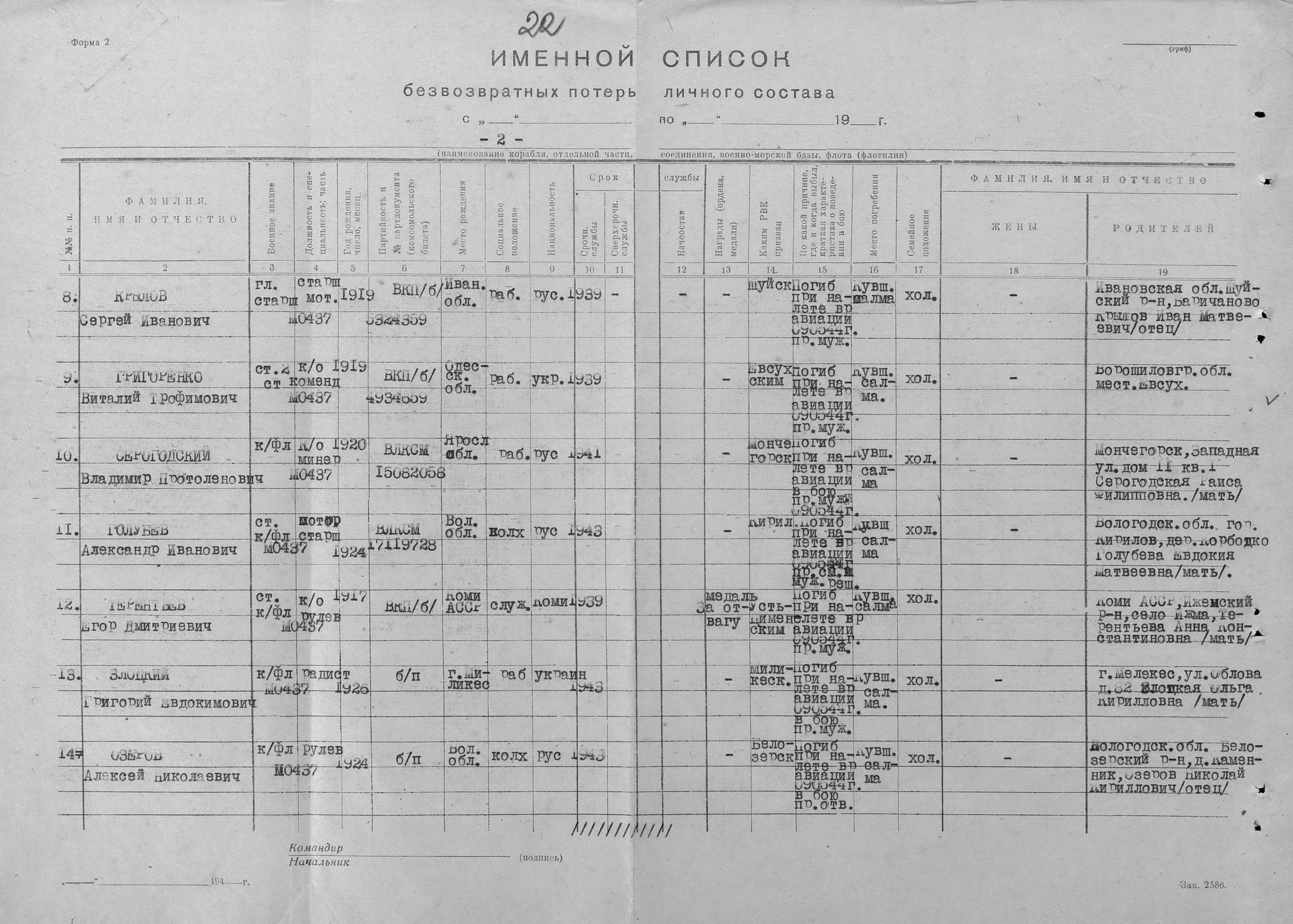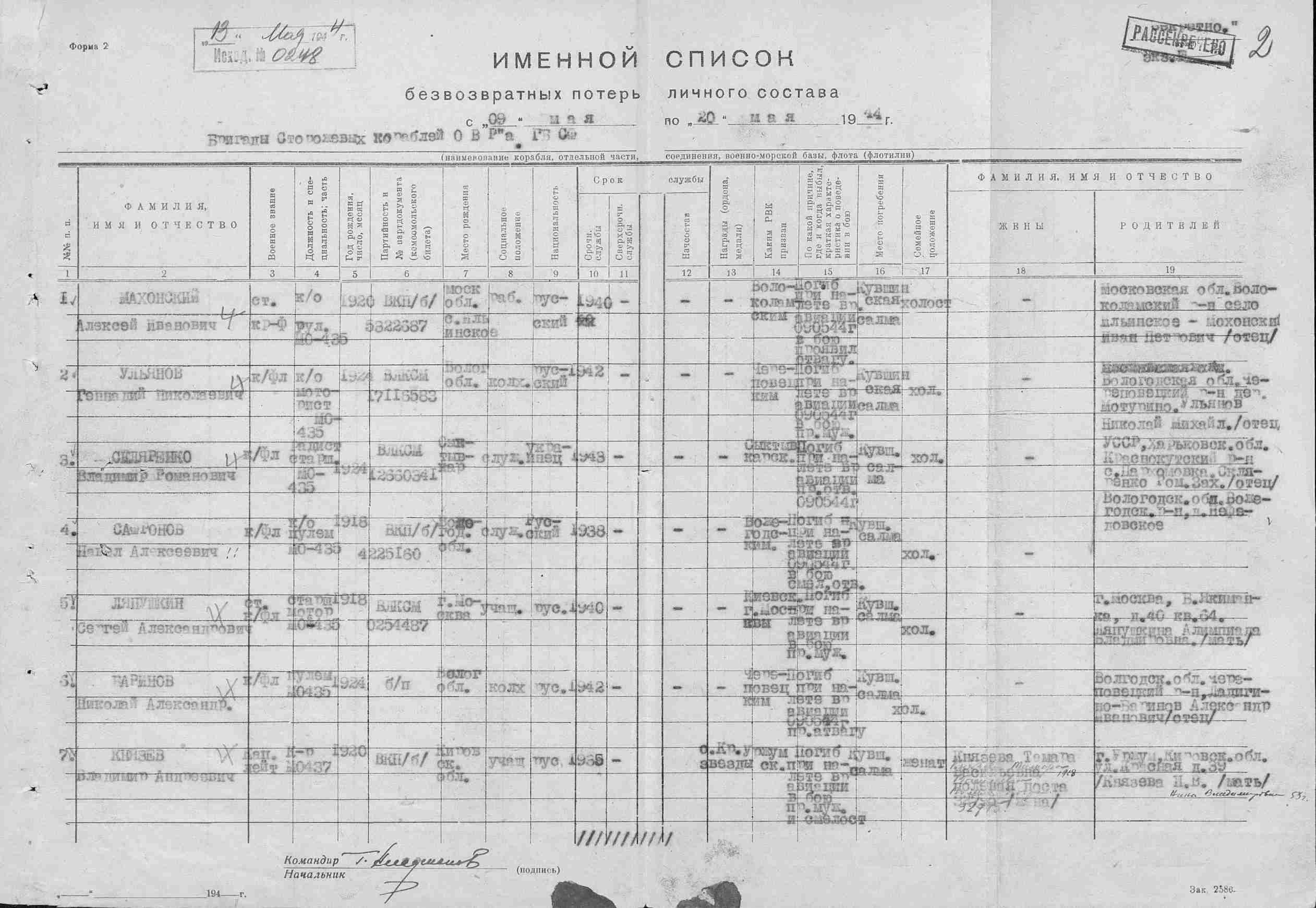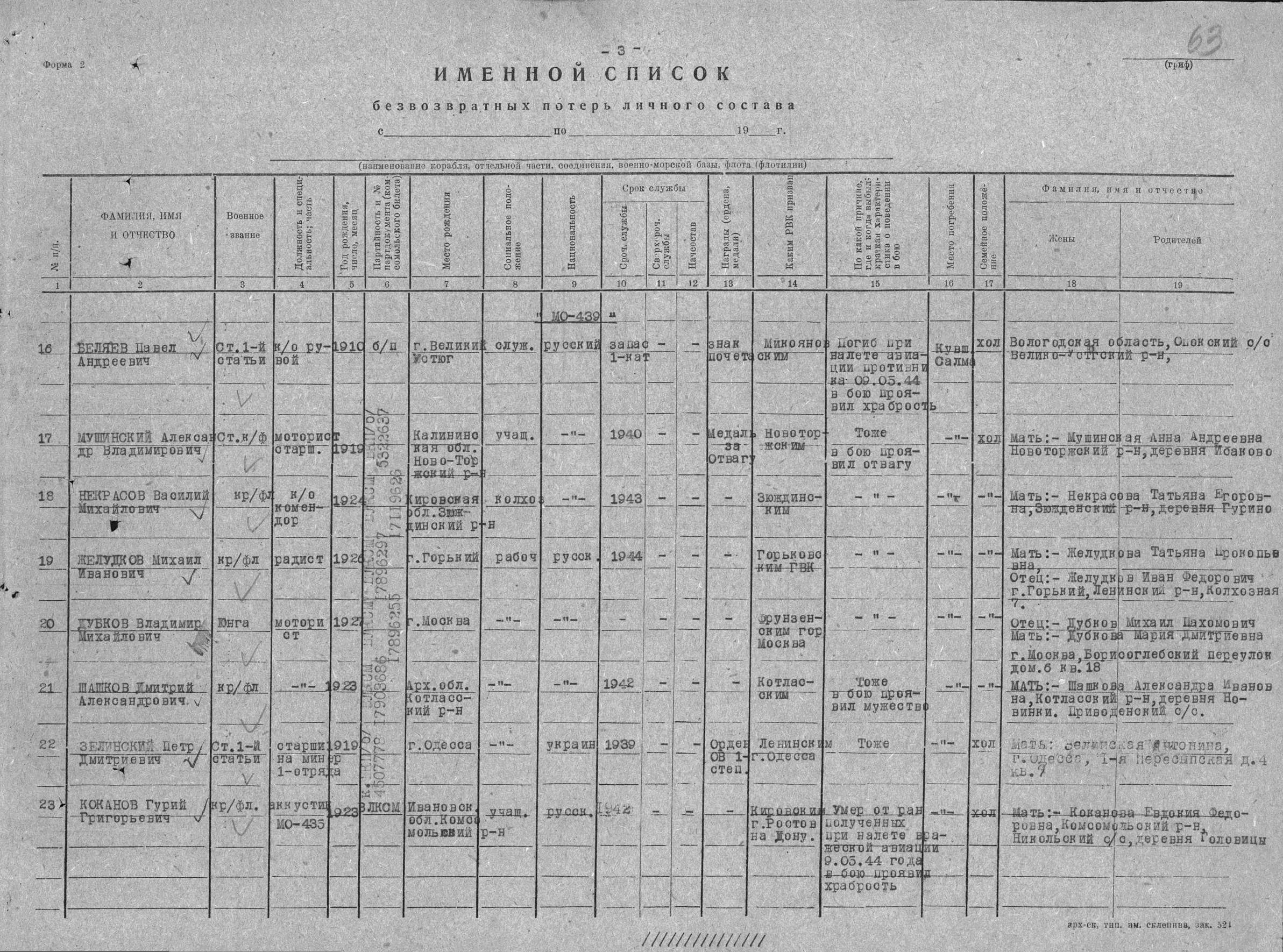 Список членов экипажа МО-435, МО-437, МО-439 БСКР ОВРа ГБ СФ погибших 9 мая 1944 г. при авианалете германской авиации в Кувшинской Салме