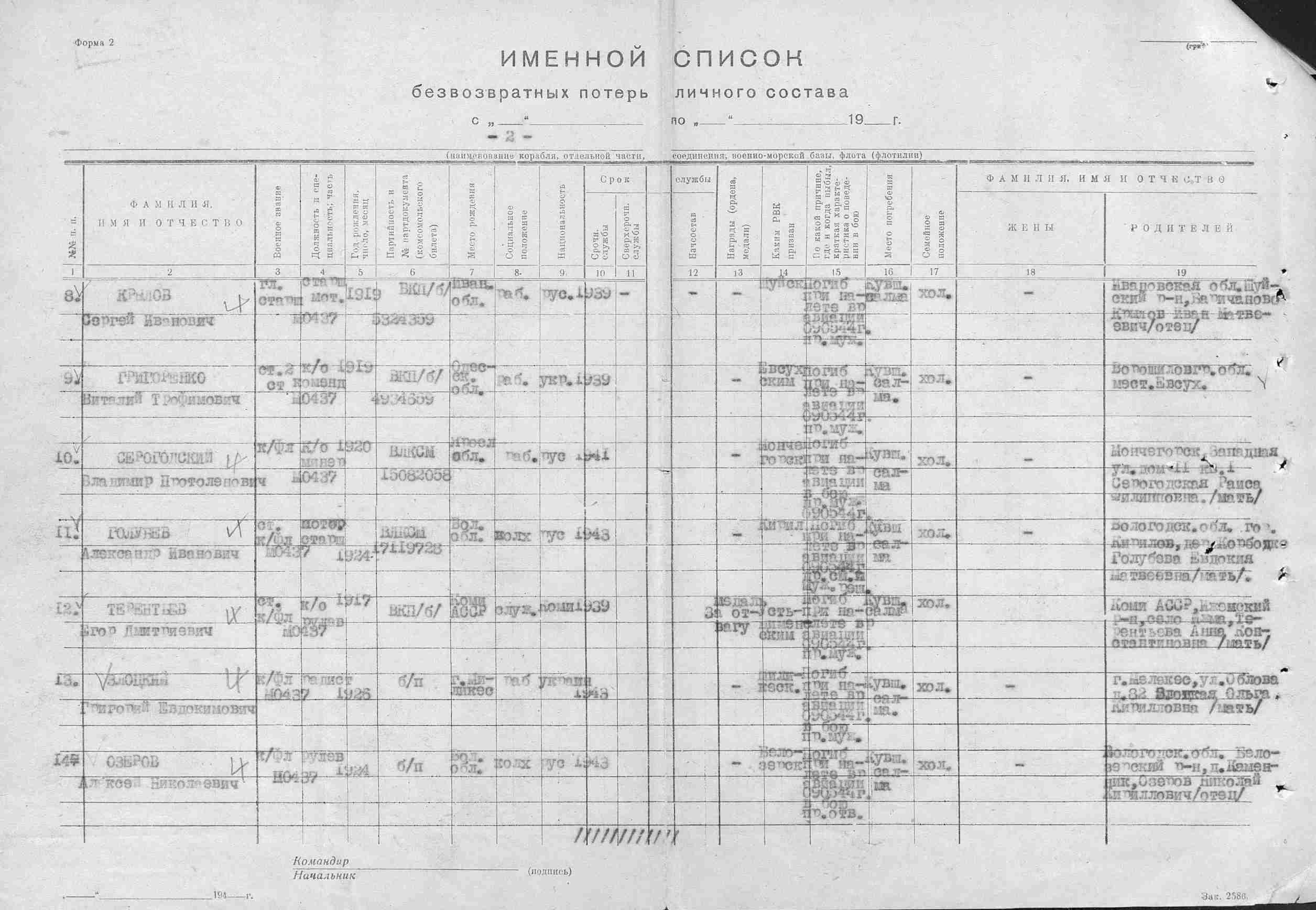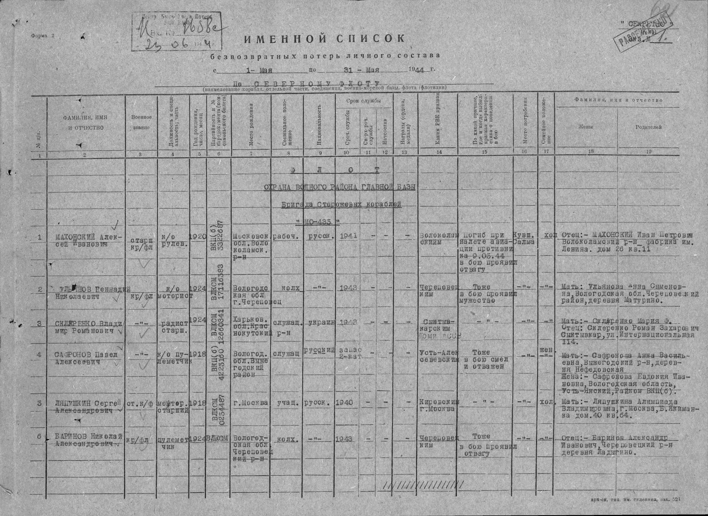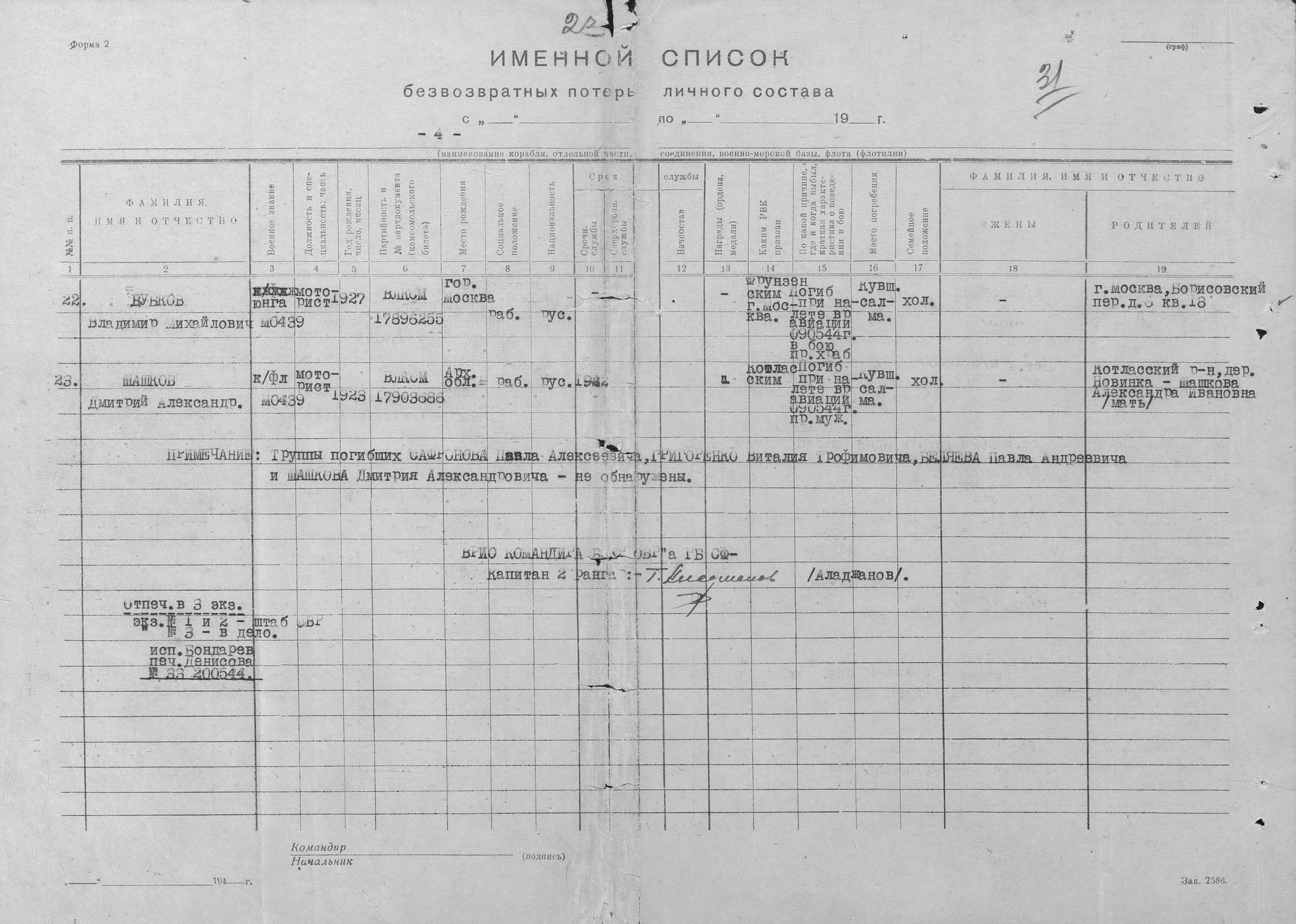 Список членов экипажа МО-435, МО-437, МО-439 БСКР ОВРа ГБ СФ погибших 9 мая 1944 г. при авианалете германской авиации в Кувшинской Салме