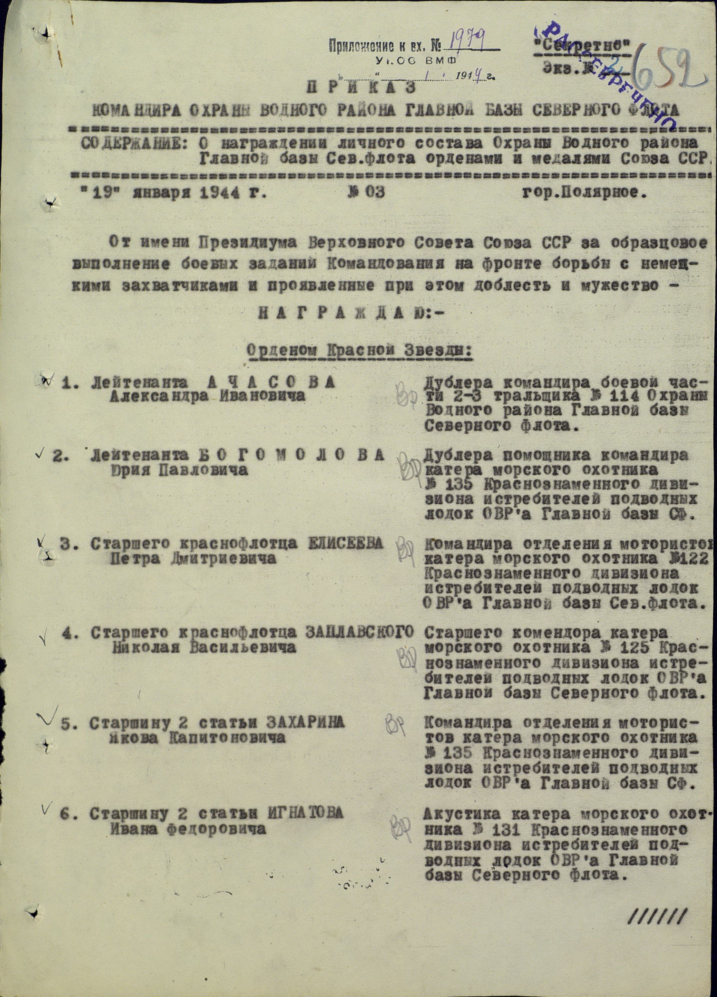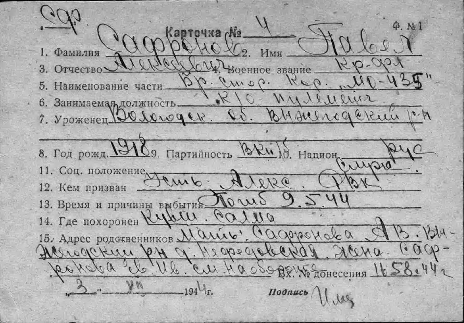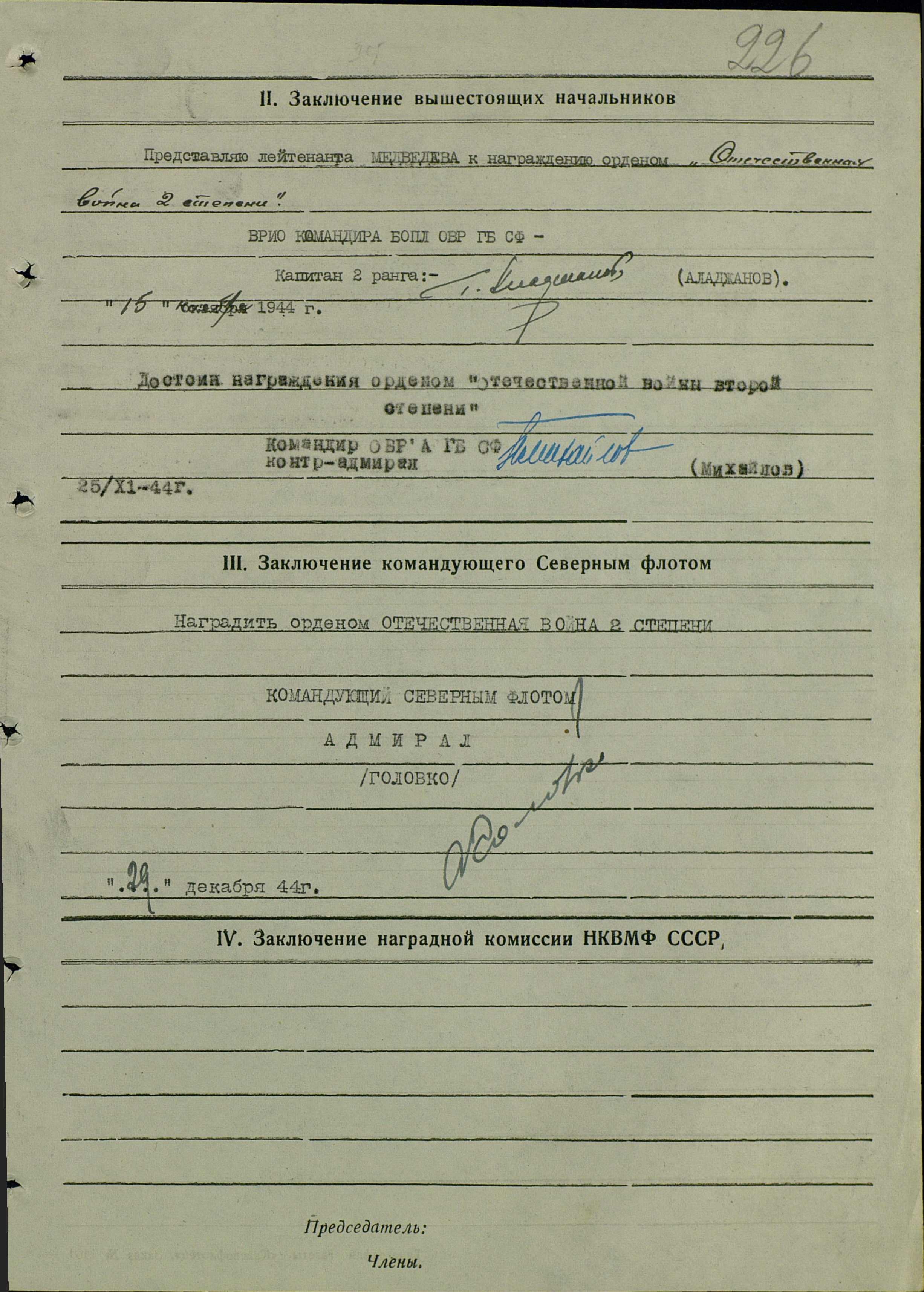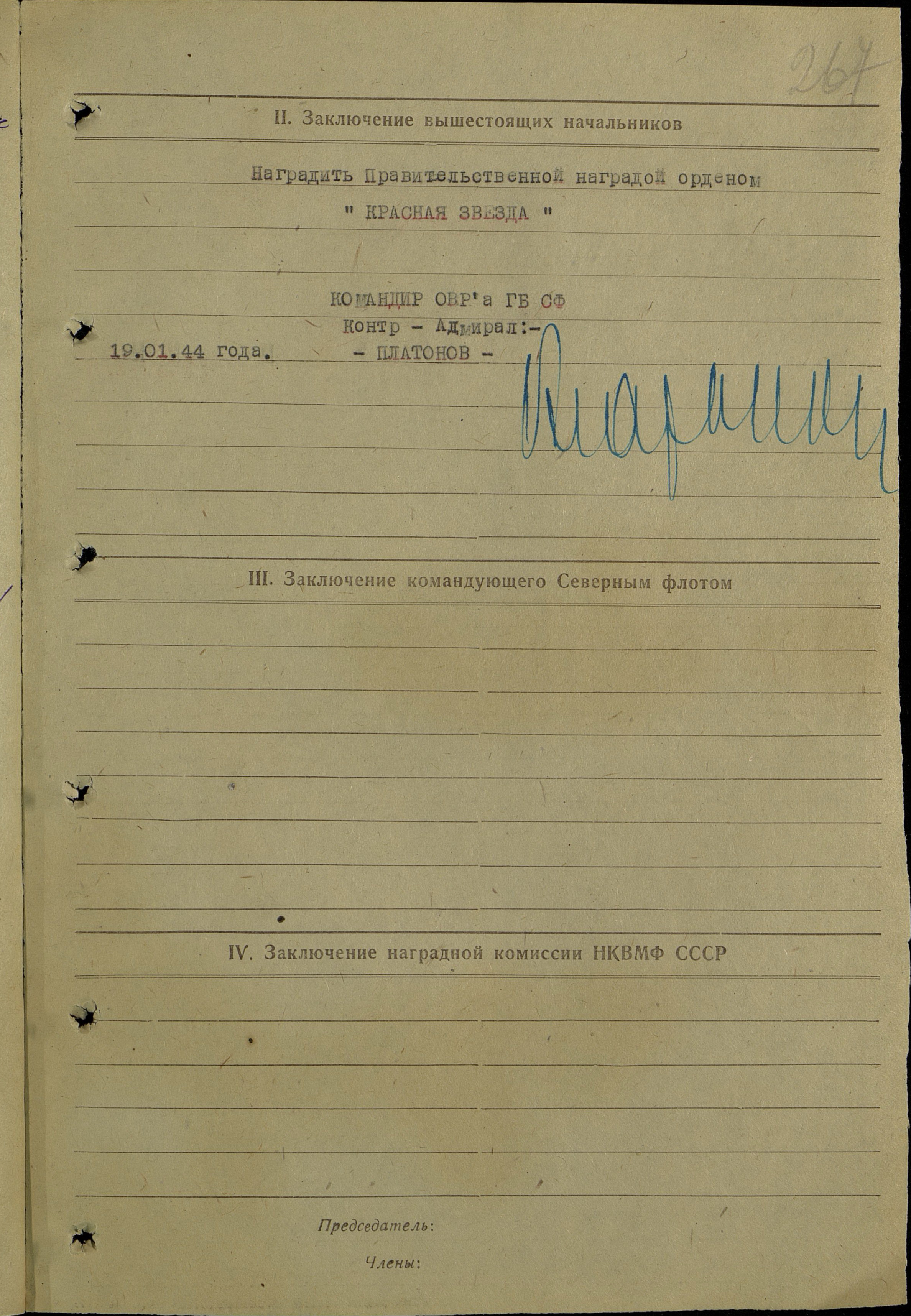 Наградной лист: фонд 3 опись 1 единица хранения 1026