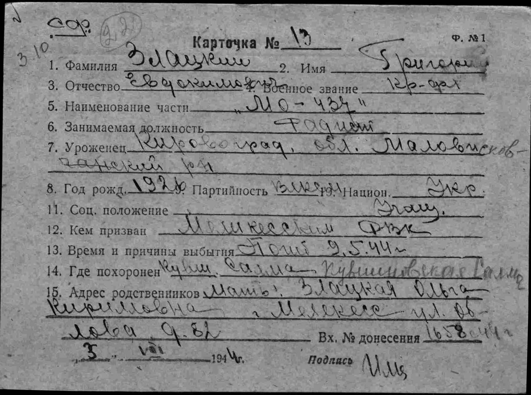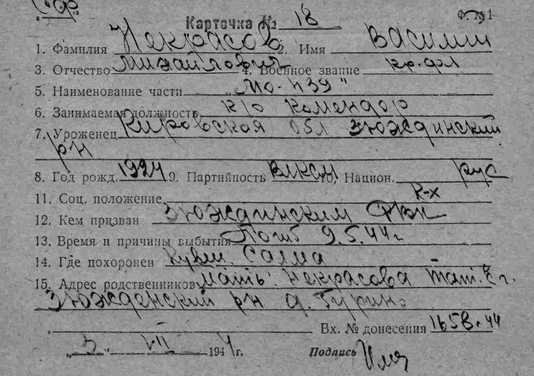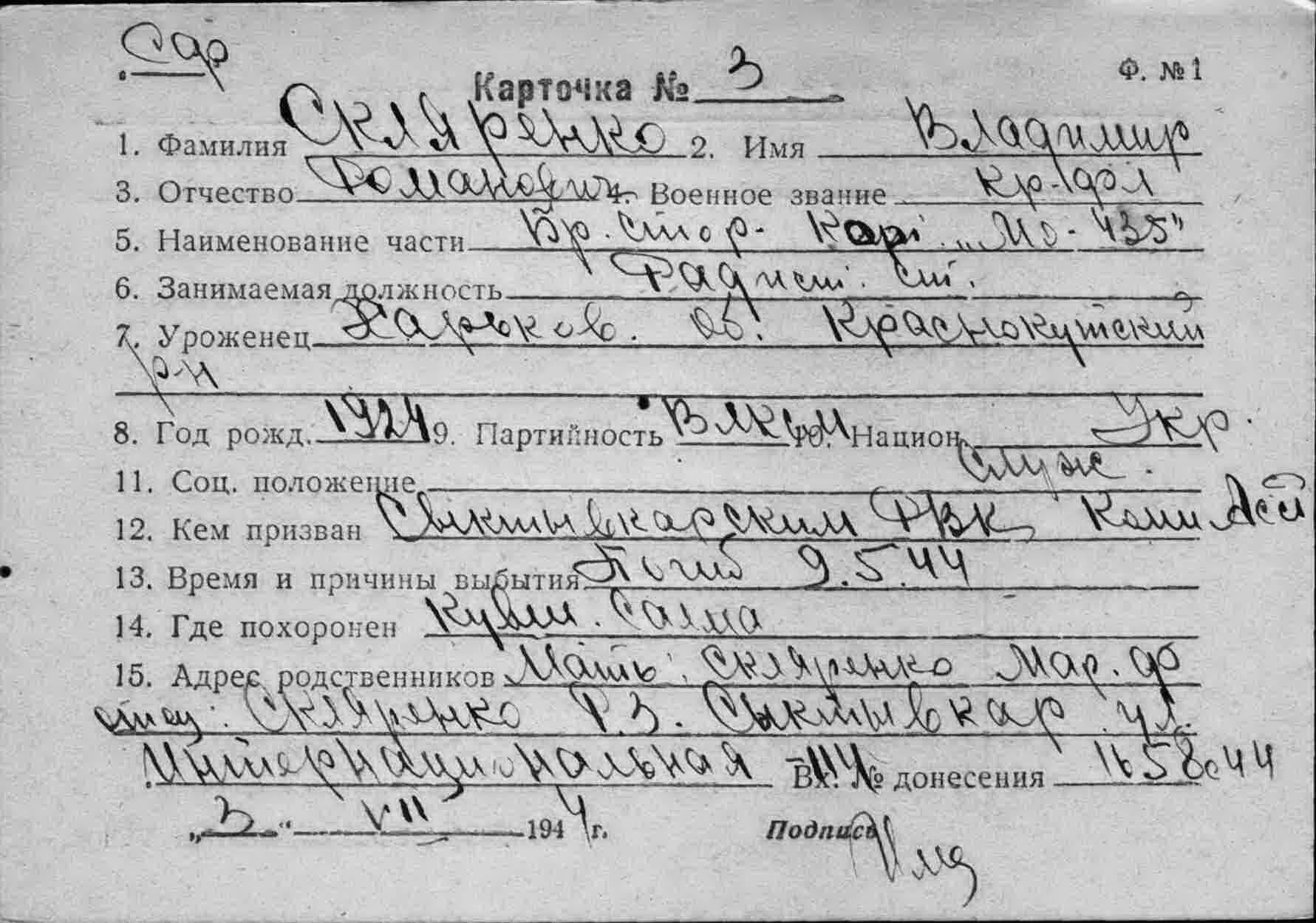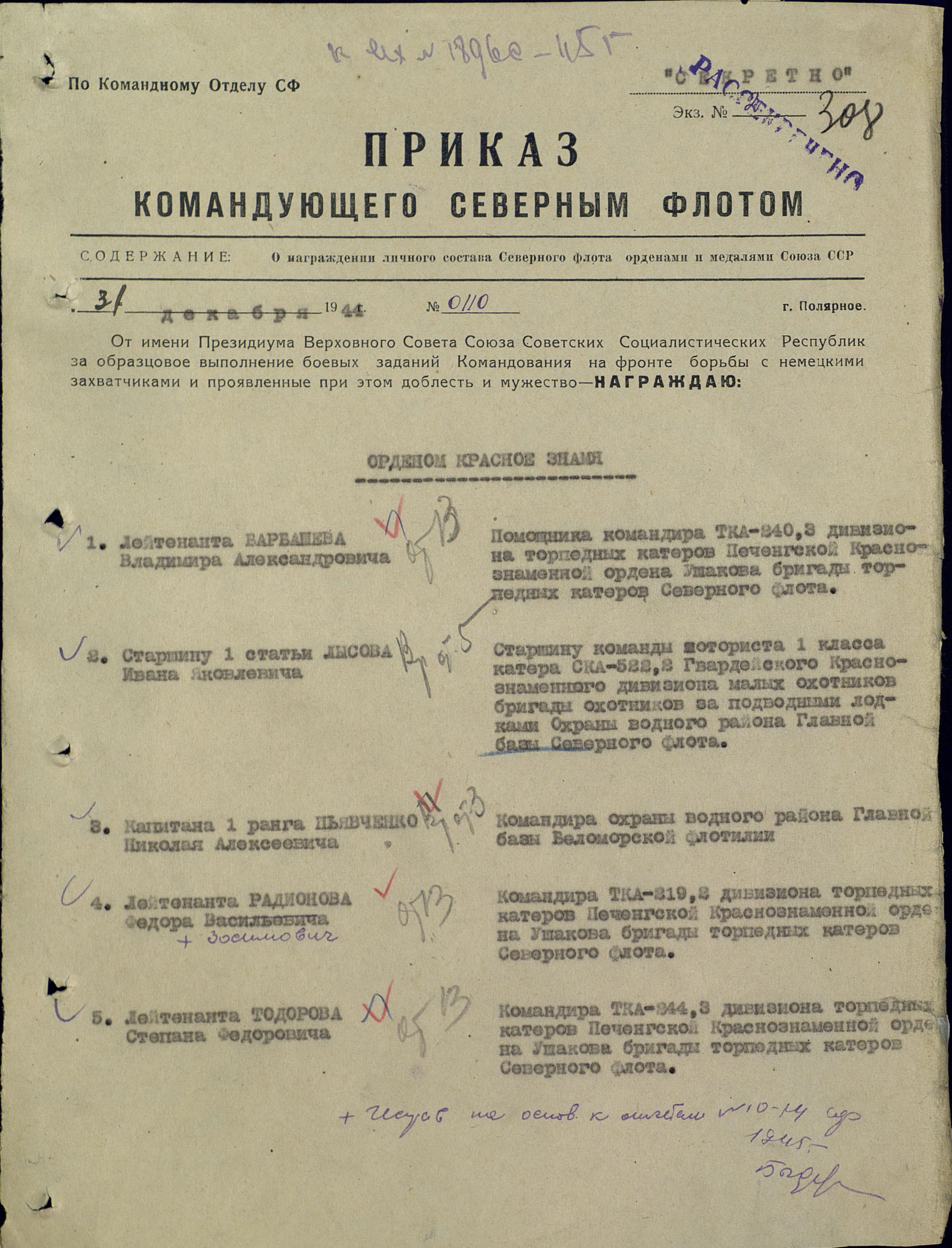 Наградной лист: фонд 3 опись 1 единица хранения 1026