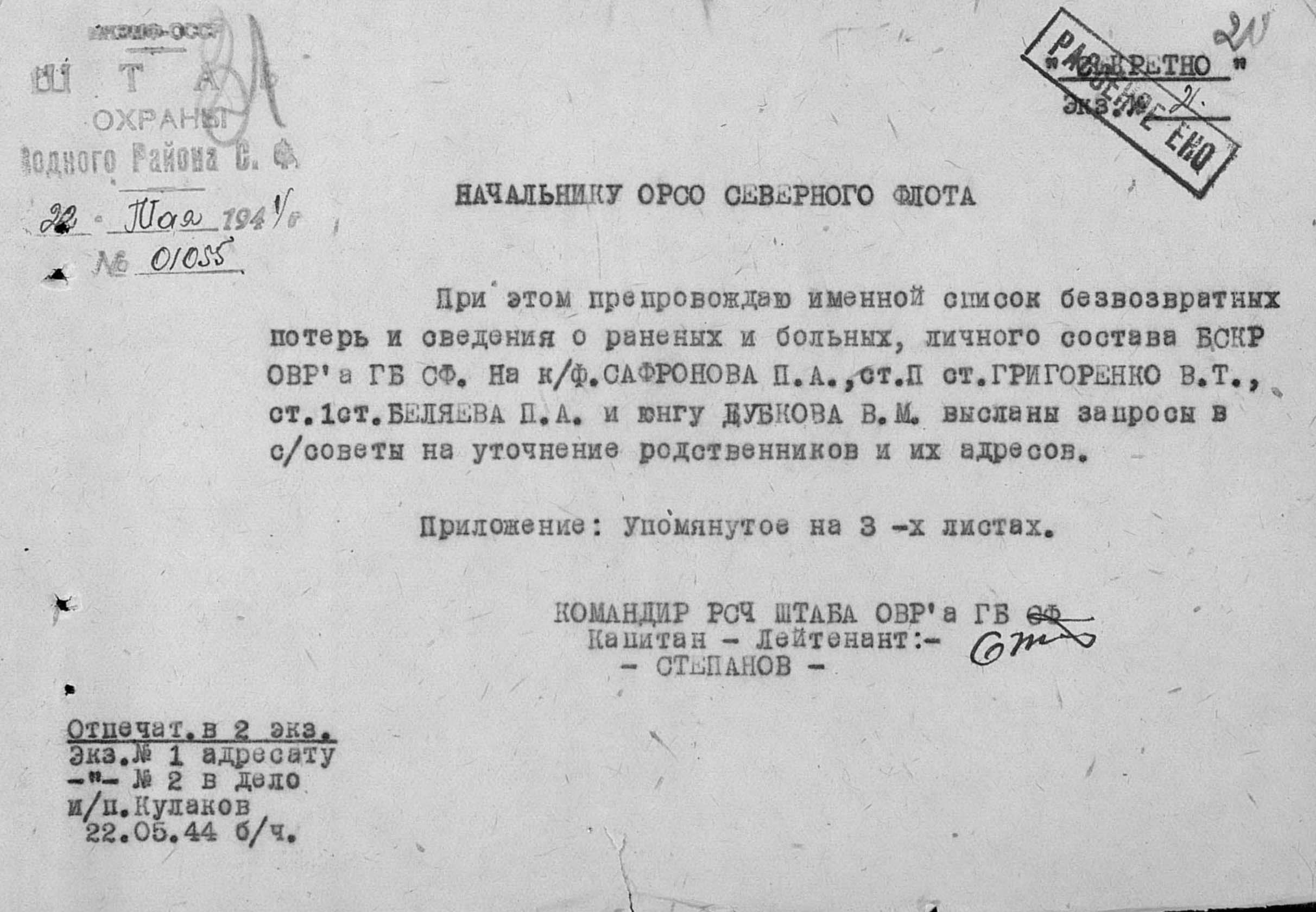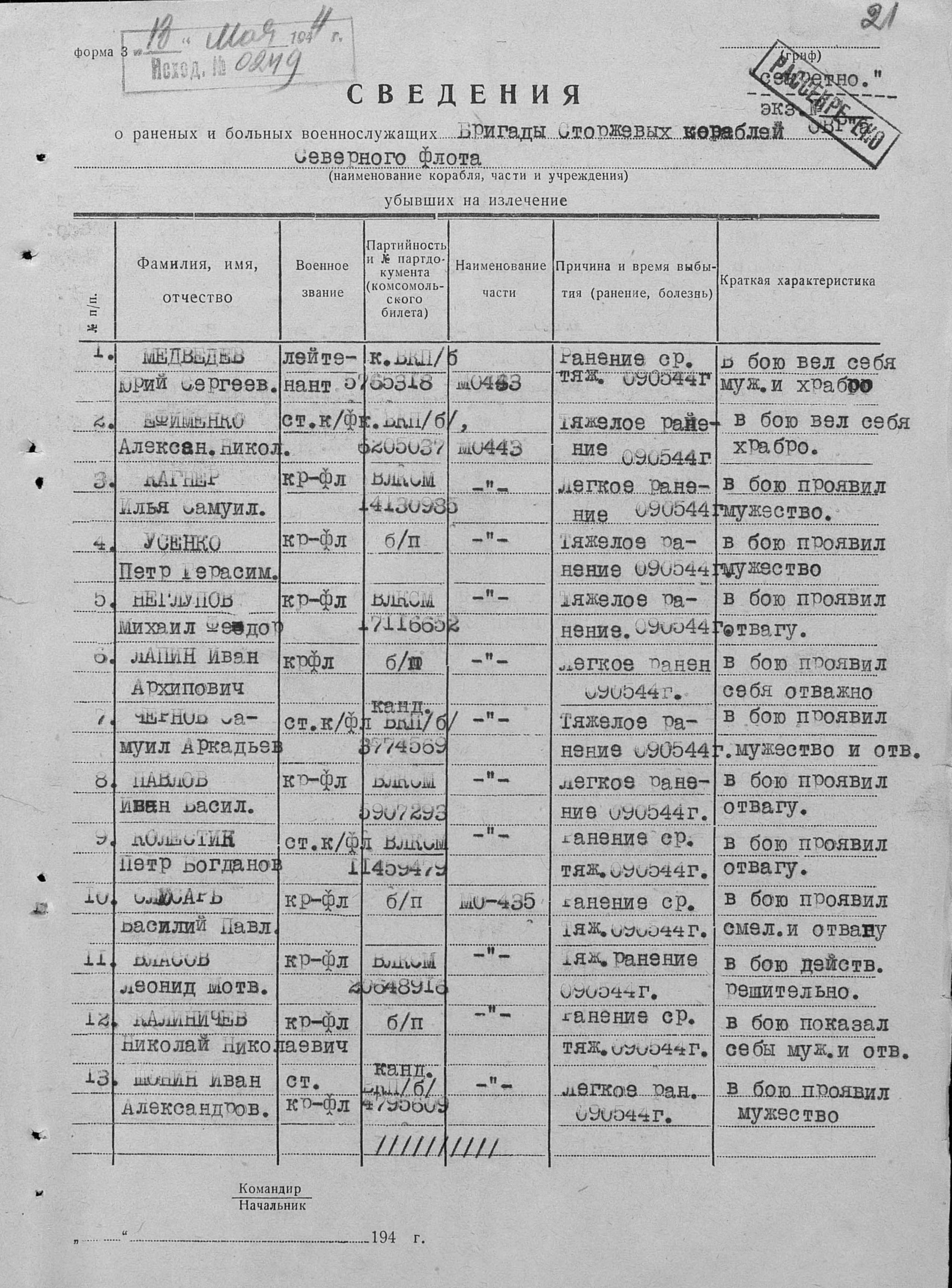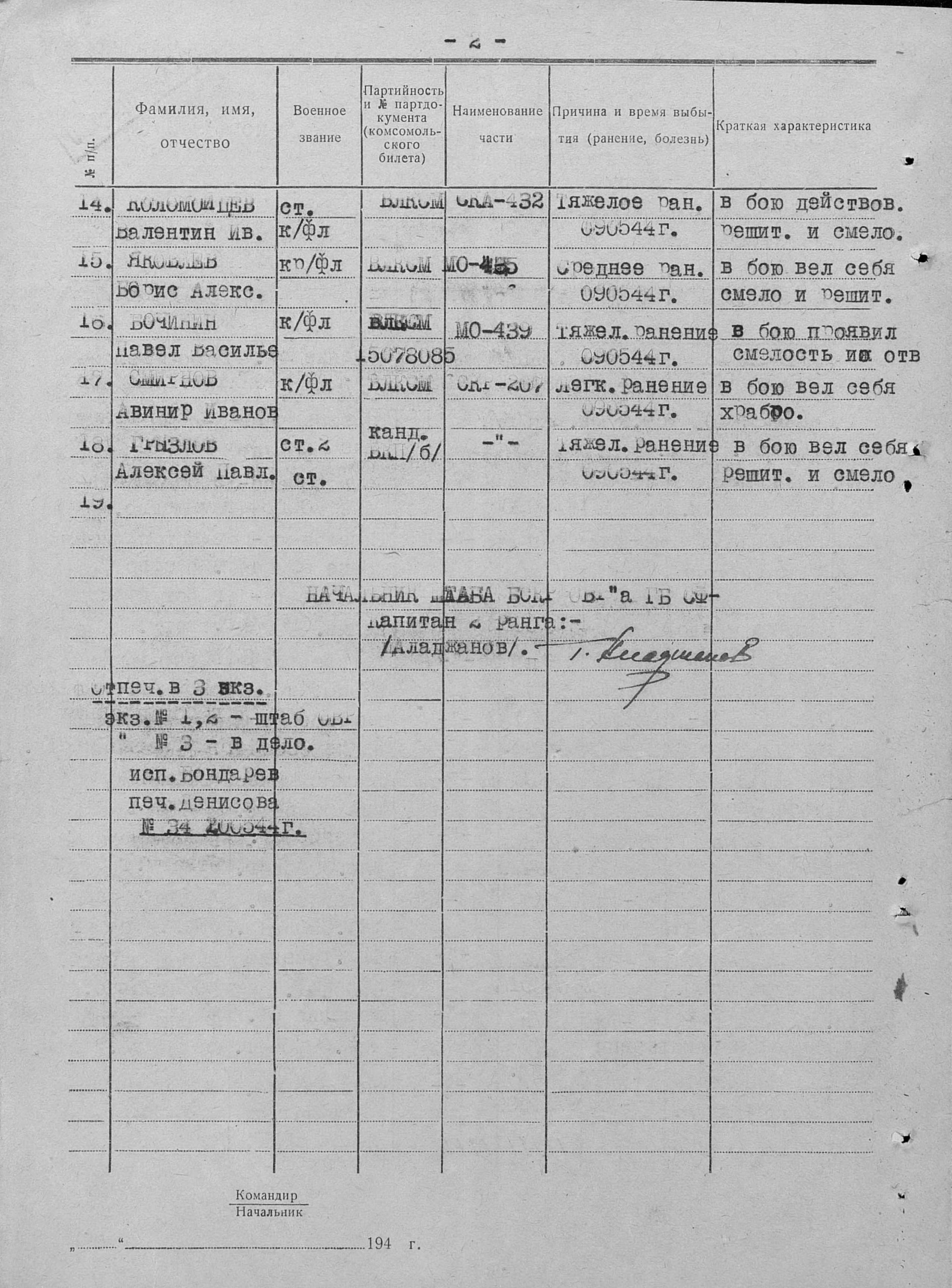 Список в/сл. БСКР ОВРа ГБ СФ раненых 9 мая 1944 г. при авианалете германской авиации в Кувшинской Салме