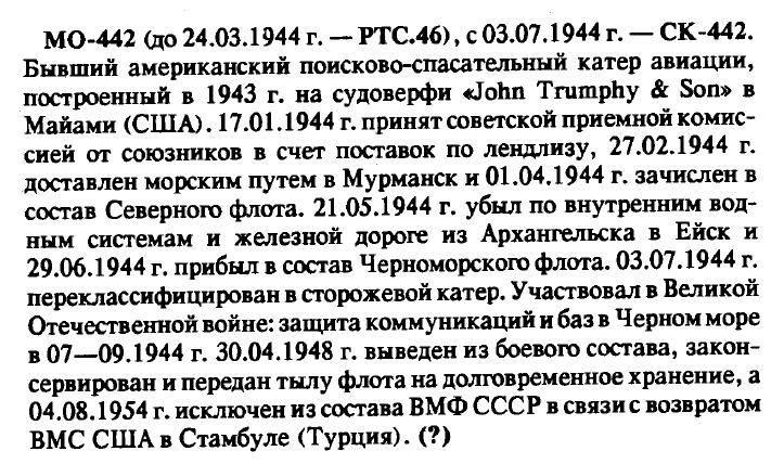Интересно, что катера этого типа в США строились для спасения экипажей сбитых над морем самолетов. Однако поскольку они могли брать на борт 32 глубинных бомбы, их в СССР первоначально причислили к классу малых охотников за подводными лодками. Этим и объясняется, что им присвоили обозначения серии «МО». Только после того как флотское командование «неожиданно» узнало, что на этих катерах нет гидроакустической аппаратуры для поиска подлодок, они в начале июля 1944 г. были отнесены к классу сторожевых и получили обозначения серии «СК».