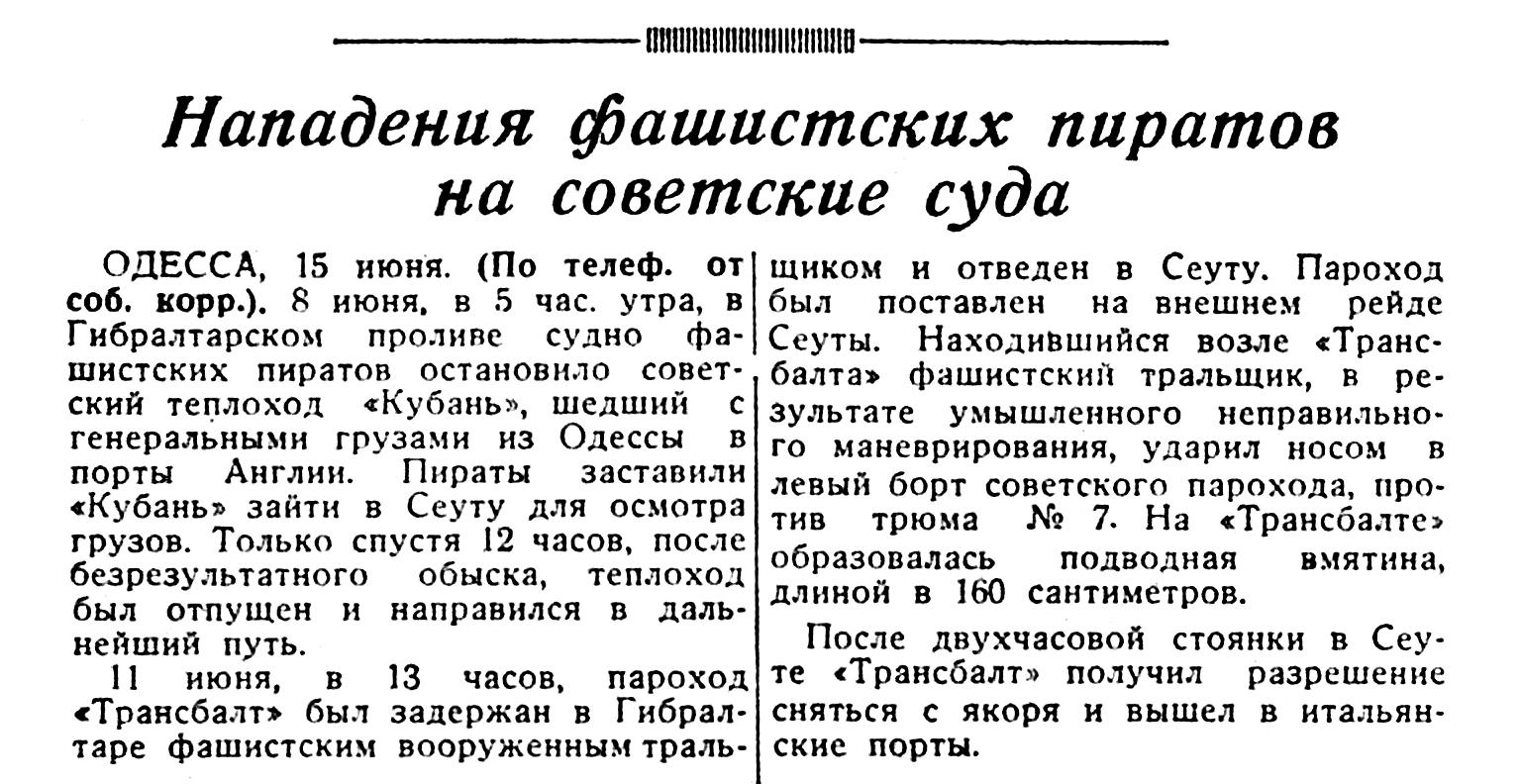 ОДЕССА, 15 июня. (По телеф. от соб. корр.). 8 июня, в 5 час. утра, в Гибралтарском проливе судно фашистских пиратов остановило советский теплоход «Кубань», шедший с генеральными грузами из Одессы в порты Англии. Пираты заставили «Кубань» зайти в Сеуту для осмотра грузов. Только спустя 12 часов, после безрезультатного обыска, теплоход был отпущен и направился в дальнейший путь.