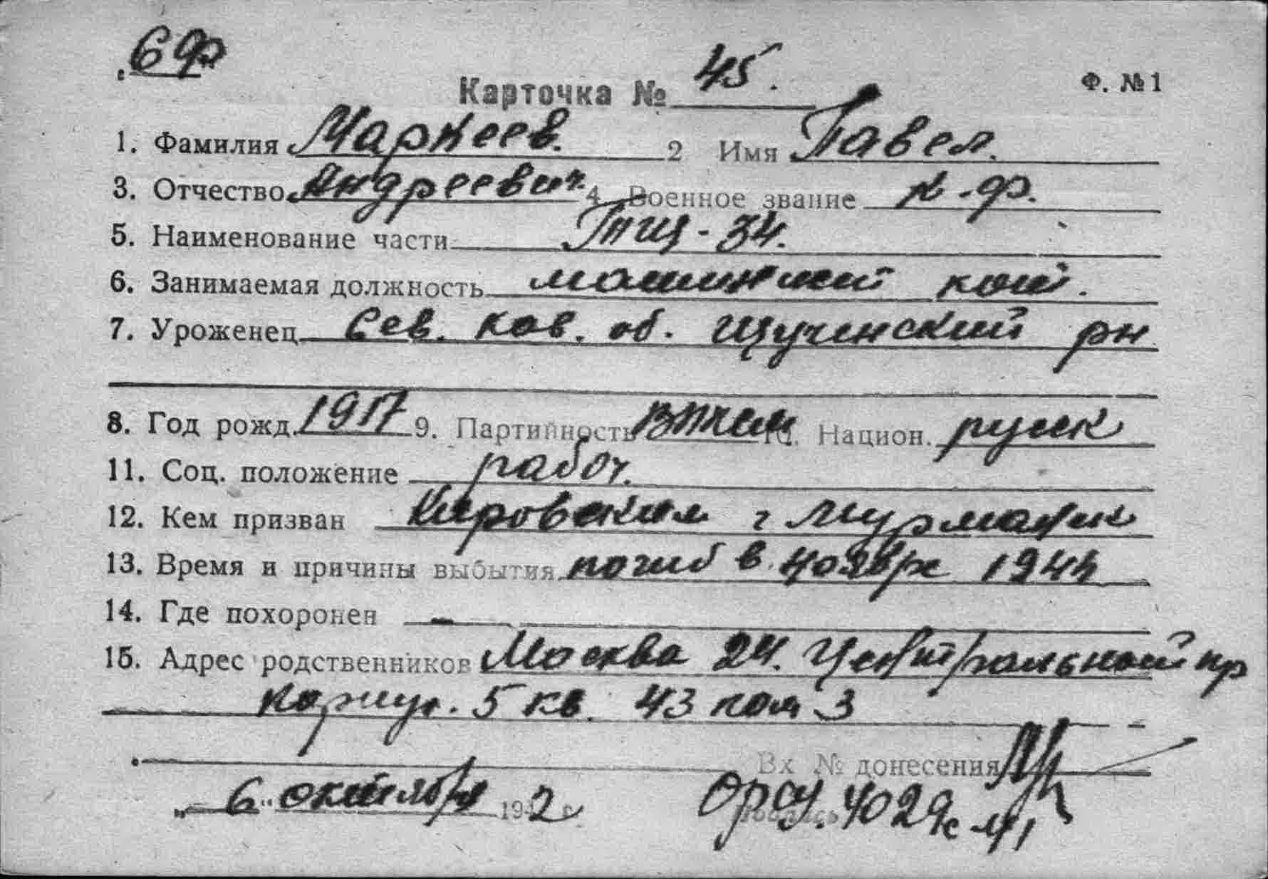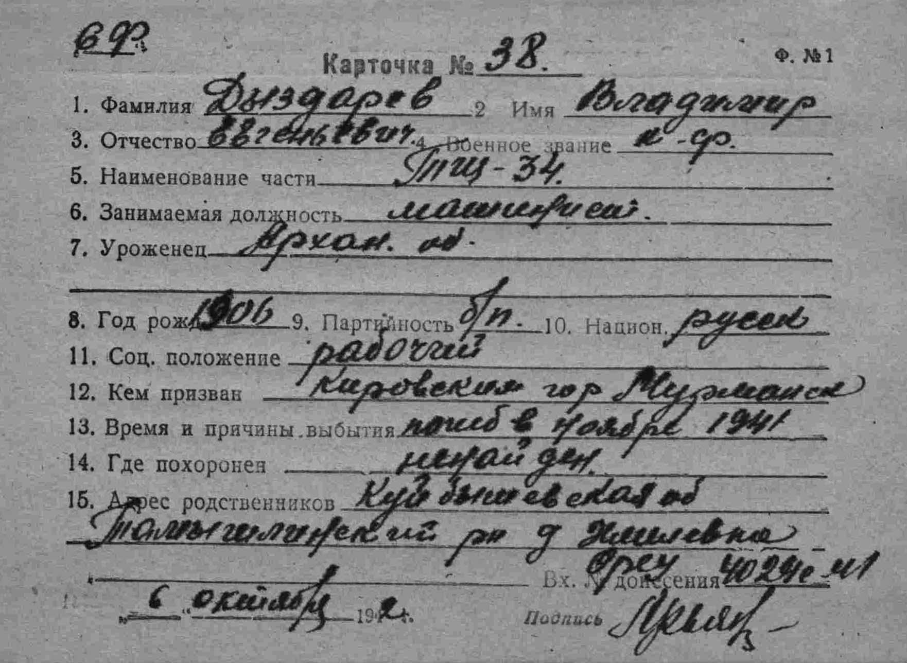 Дата и место призыва Кировский РВК, Мурманская обл., г. Мурманск, Кировский р-н