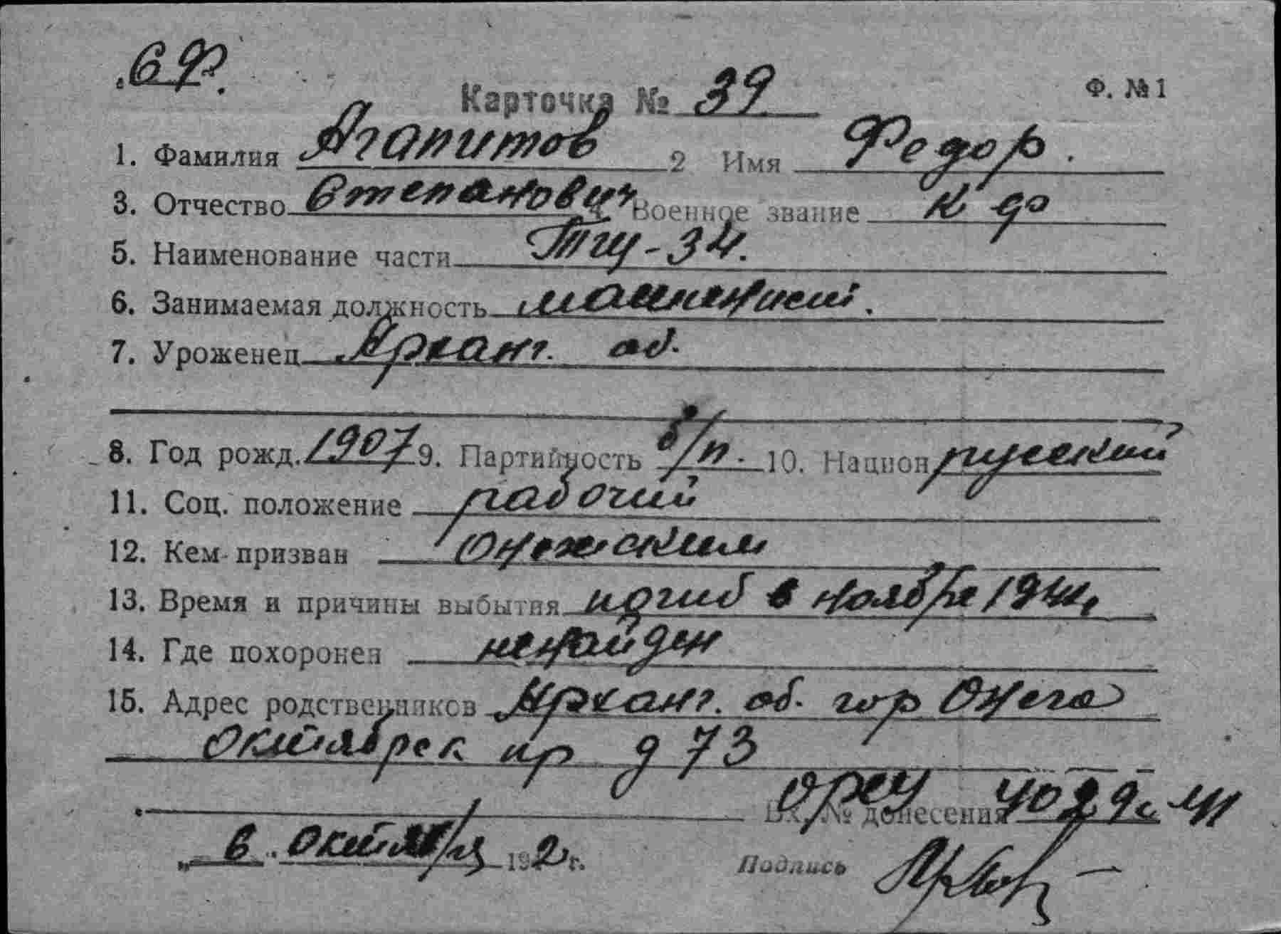 Дата и место призыва Октябрьский РВК, Архангельская обл., г. Архангельск, Октябрьский р-н