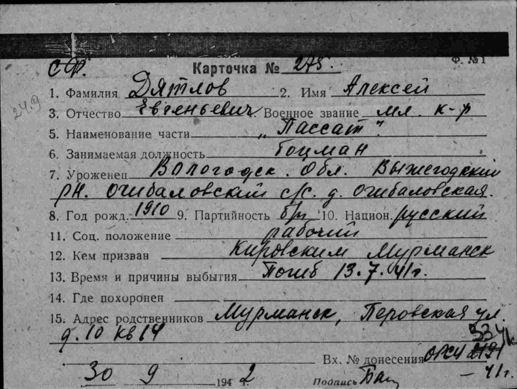 Я эту запись видел и внес эти данные уже в списки участников конвоя БД-5. Отчества разные - как записаны в документах. Поиск по Архангельску - это вообще отдельная тема для разговора. У меня до всего руки не доходят, а помогать в Архангельске никто не хочет.