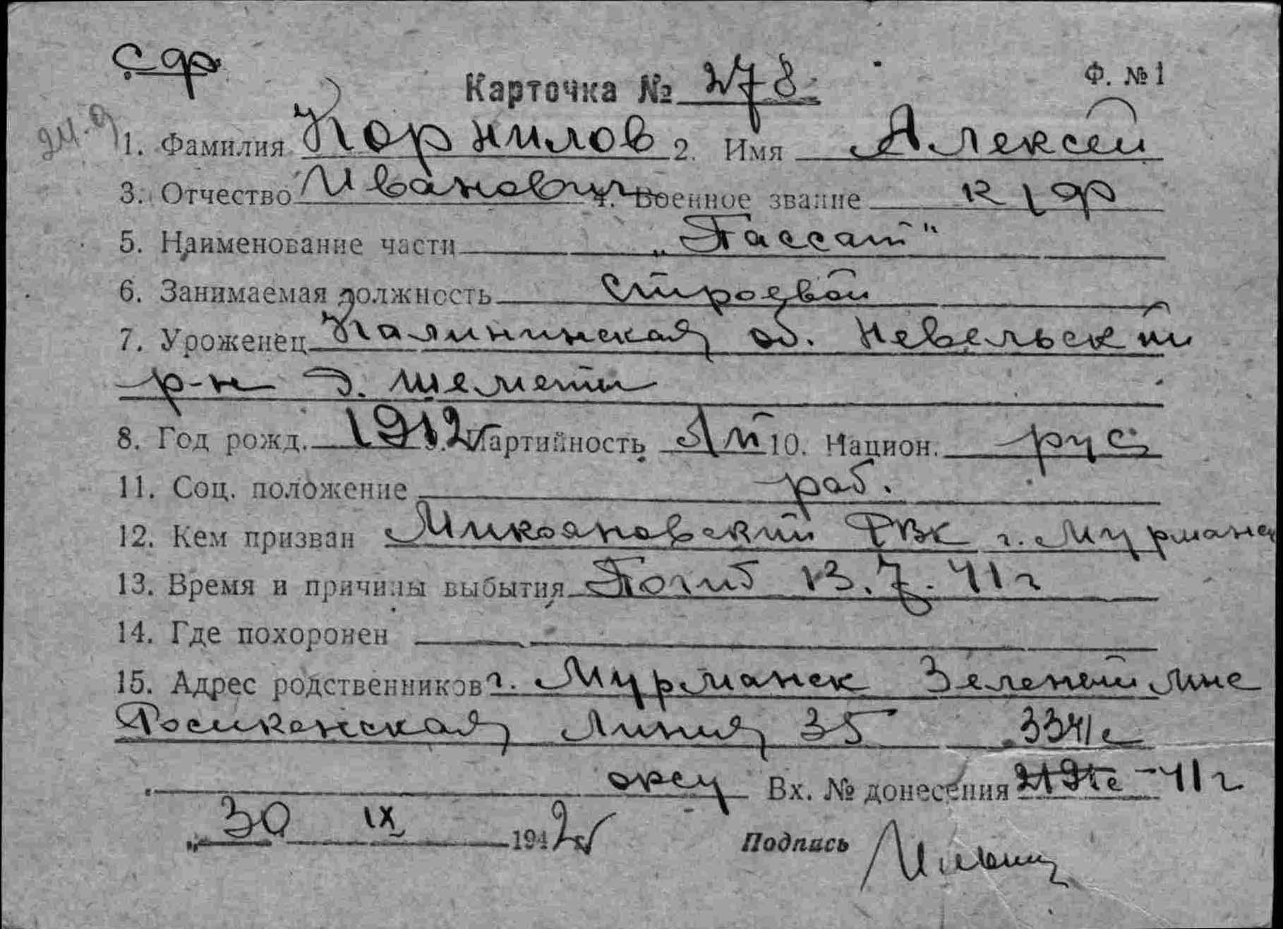 Дата и место призыва Кировский РВК, Мурманская обл., г. Мурманск, Кировский р-н