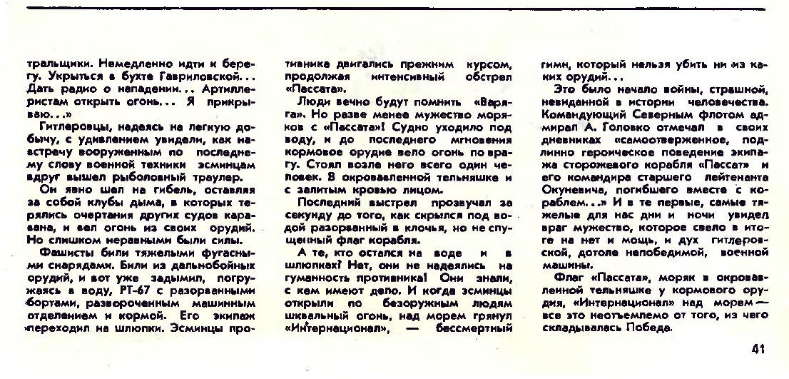 Удалось разыскать Бориса Никитовича Моцеля, который работает сейчас в Архангельском траловом флоте, узнать подробности боя «Пассата» с эсминцами.
