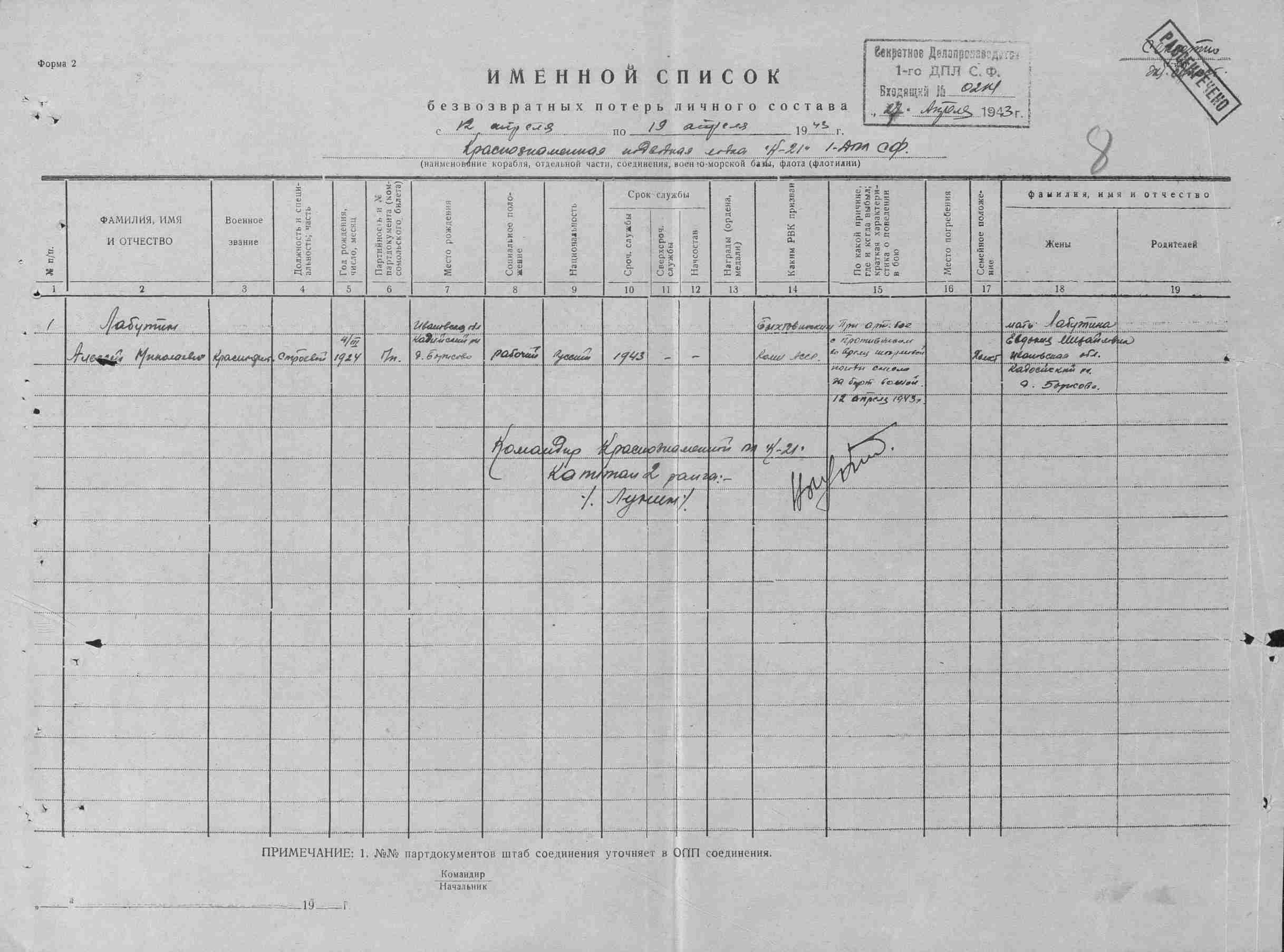 Однако и К-21 понесла потери: исчез матрос Алексей Лабутин. Норвежцы здесь были не при чем: рыбаки не имели оружия. 19-летний Алексей выполнял на лодке обязанности вестового и матроса на камбузе. Однако по боевому расписанию он действовал в качестве подносчика снарядов для носового орудия, и во время обстрела его смыло волной со скользкой палубы. Командир, хотя и заметил потерю бойца, по каким-то причинам отдал приказ на срочное погружение.