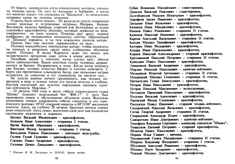 Сообщение о гибели "Шквала" глубоко потрясло моряков Аварийно-спасательного отдела. Это была их первая потеря за три года войны. Навсегда ушли от них дорогие товарищи, с которыми делили и радость, и горе. Но особенно тяжелой она была потому, что вместе с кораблем погибли командир АСО Н. М. Петров, командир "Шквала" В. С. Тимофеев, флагманский штурман Новоземельской базы Н. Н. Марлян и другие специалисты аварийно-спасательной службы флотилии. Сорок пять человек навсегда поглотило море.