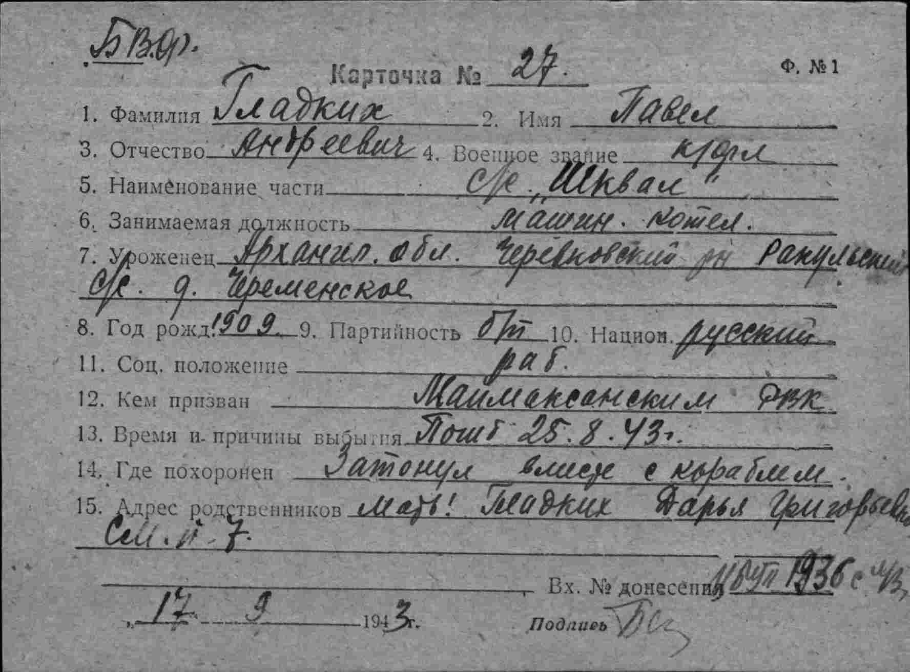 Гладких Павел Андреевич краснофлотец машинист котельн.