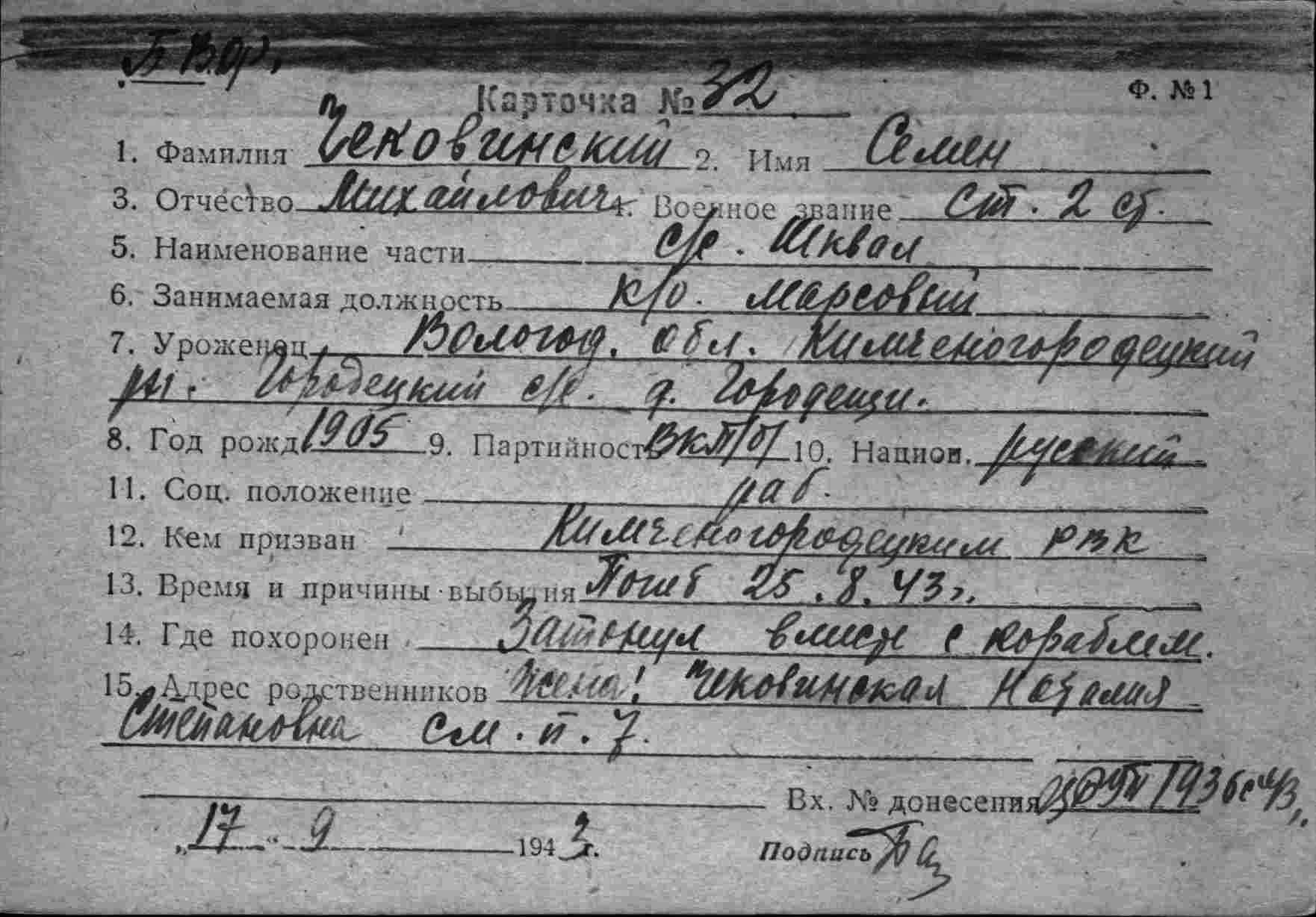 Чековинский Семен Михайлович старшина 2 ст. к/отд.марсовый