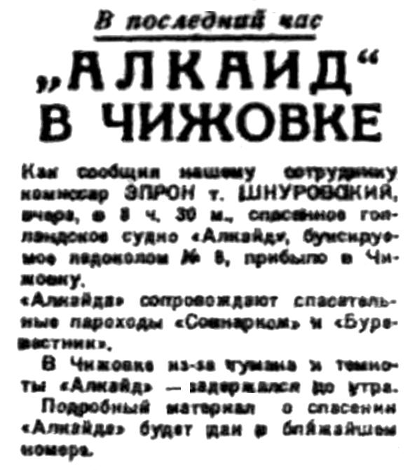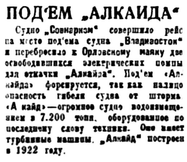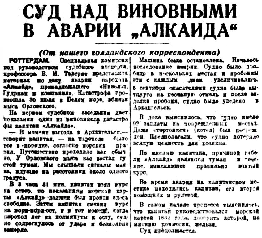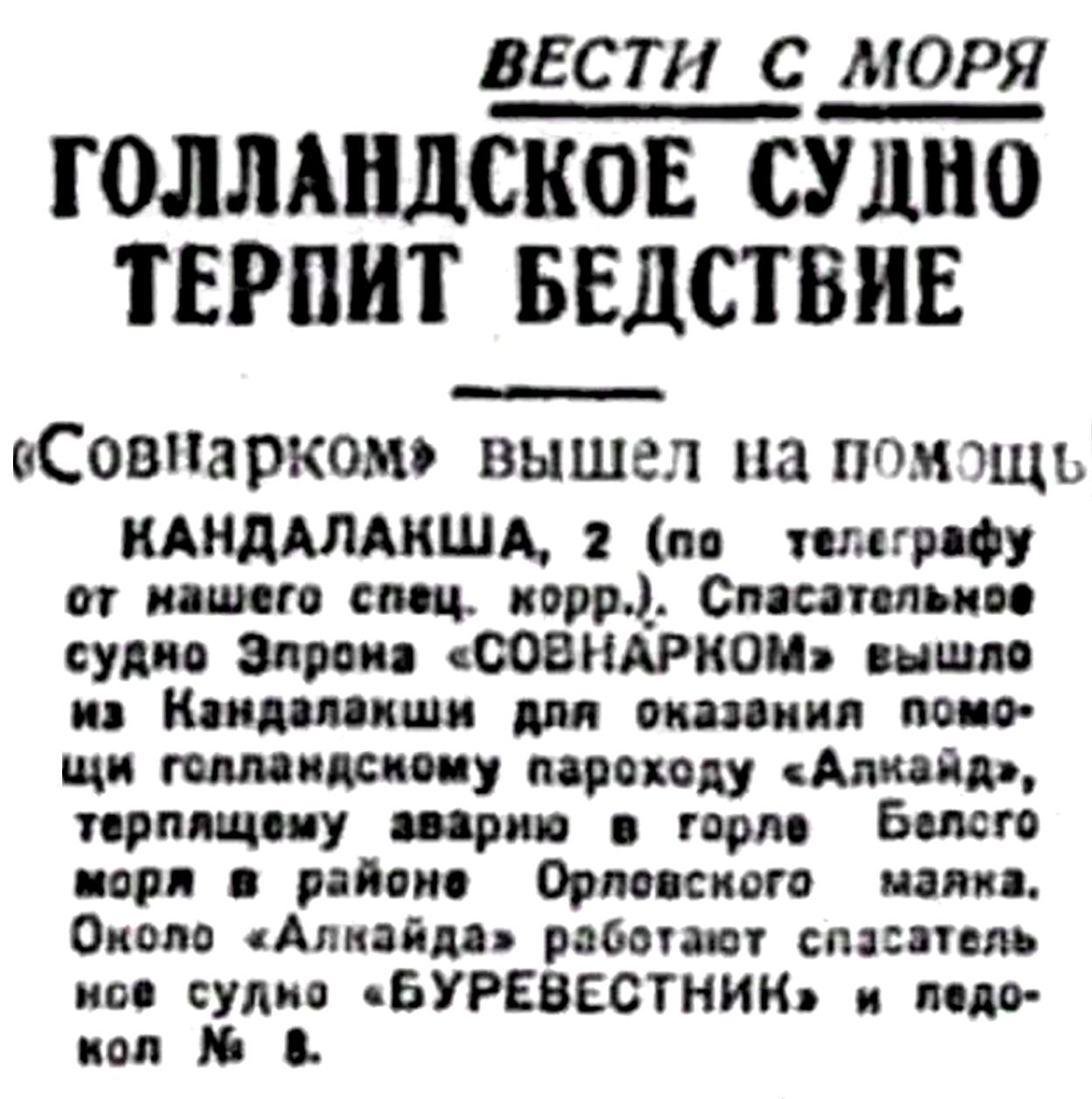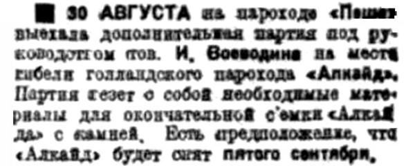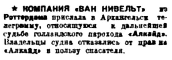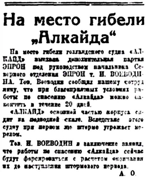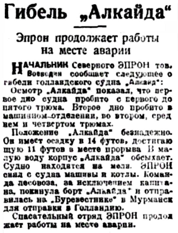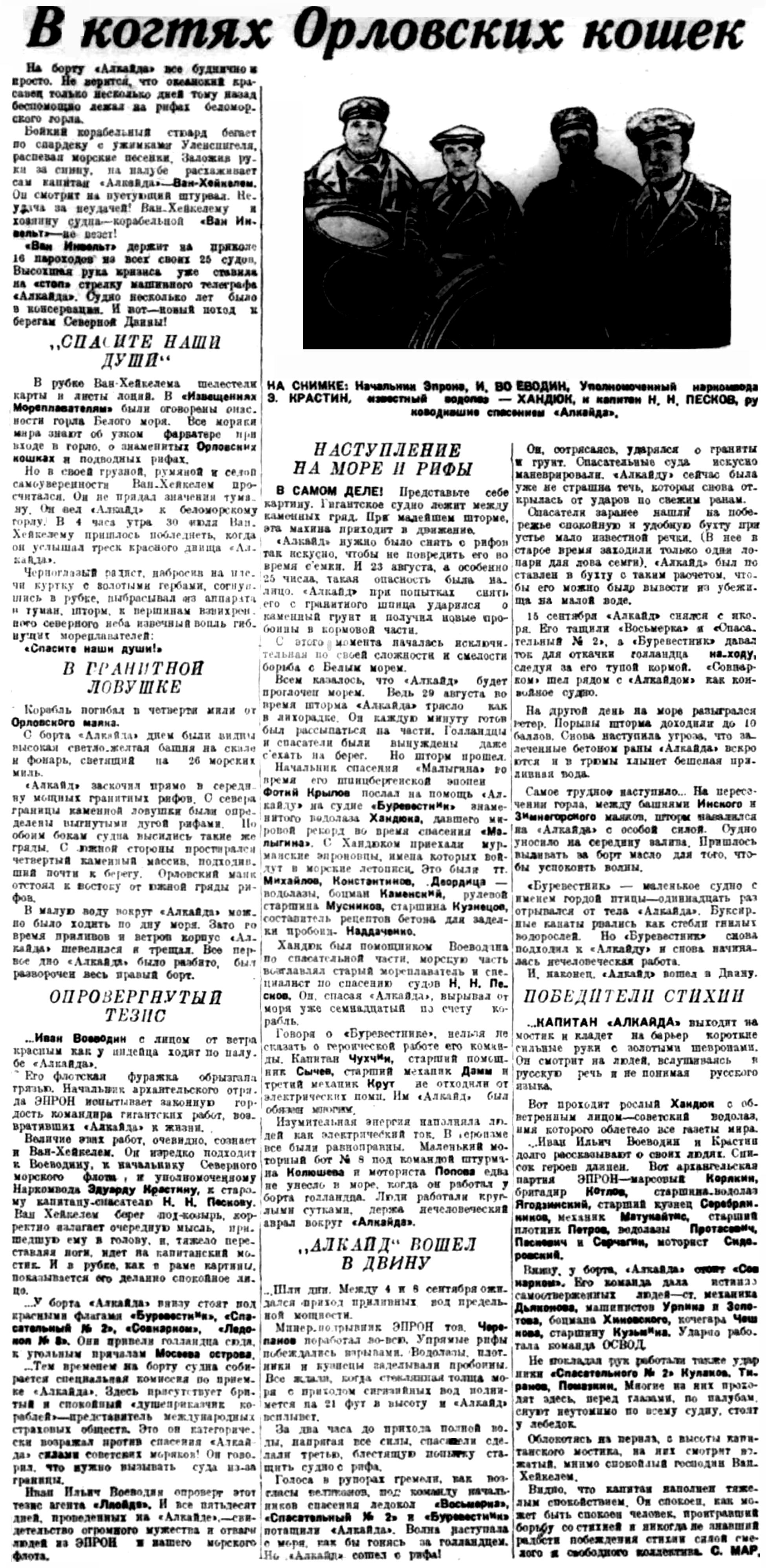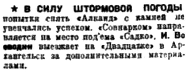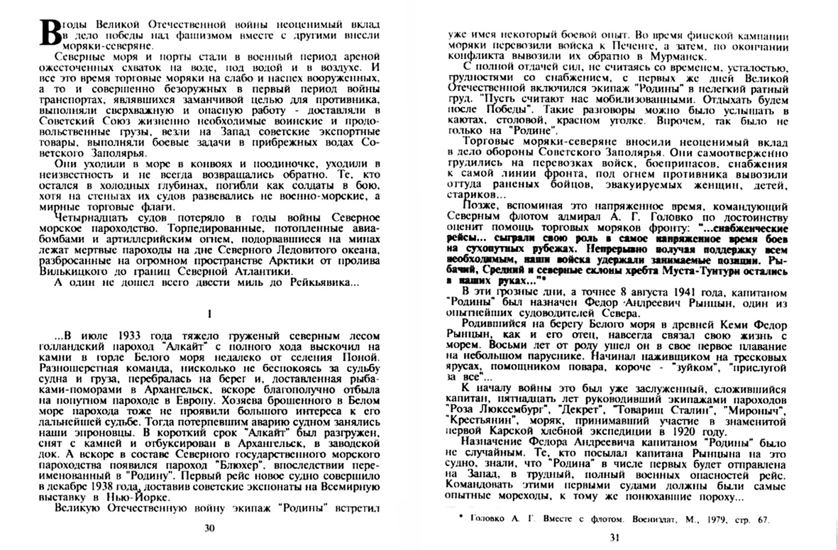 I...В июле 1933 года тяжело груженый северным лесом голландский пароход "Алкайт" с полного хода выскочил на камни в горле Белого моря недалеко от селения Поной. Разношерстная команда, нисколько не беспокоясь за судьбу судна и груза, перебралась на берег и. доставленная рыбаками-поморами в Архангельск, вскоре благополучно отбыла на попутном пароходе в Европу. Хозяева брошенного в Белом море парохода тоже не проявили большого интереса к его дальнейшей судьбе. Тогда потерпевшим аварию судном занялись наши эпроновцы. В короткий срок 'Алкайт" был разгружен, снят с камней и отбуксирован в Архангельск, в заводской док. А вскоре в составе Северного государственного морского пароходства появился пароход "Блюхер", впоследствии переименованный в "Родину". Первый рейс новое судно совершило в декабре 1938 года, доставив советские экспонаты на Всемирную выставку в Нью-Йорке.