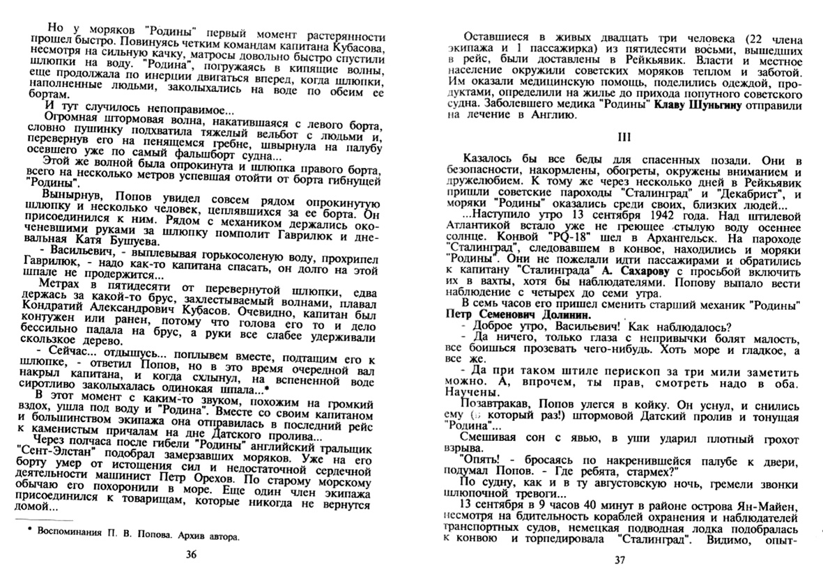 IIIКазалось бы все беды для спасенных позади. Они в безопасности, накормлены, обогреты, окружены вниманием и дружелюбием. К тому же через несколько дней в Рейкьявик пришли советские пароходы "Сталинград" и "Декабрист", и моряки "Родины" оказались среди своих, близких людей...