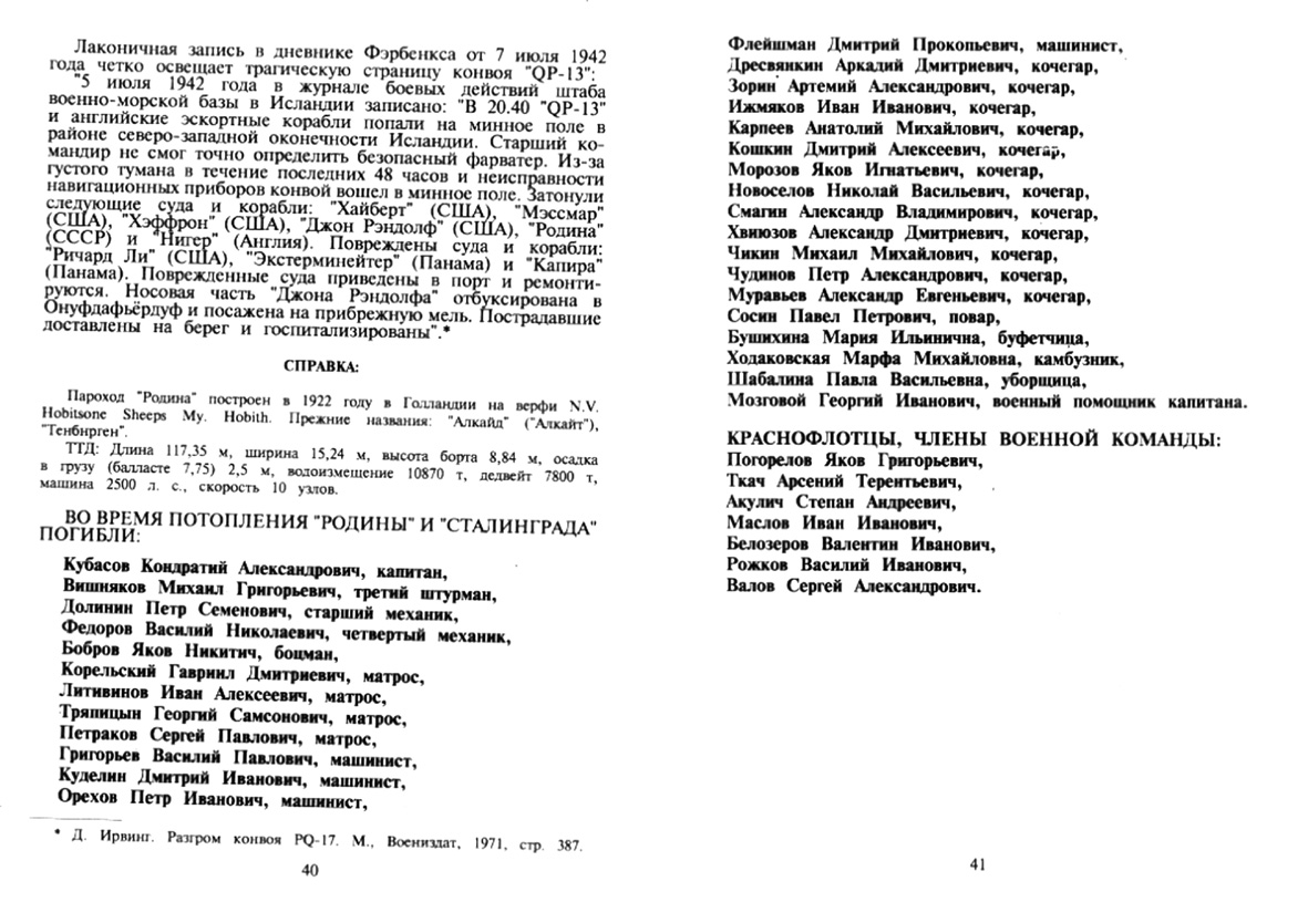 * Д. Ирвинг. Разгром конвоя PQ-17 М., Воениздат, 1971. стр 387.СПРАВКА.Пароход "Родина" построен в 1922 голу в Голландии на верфи N.V. Hobitsone Sheeps Му. Нobith. Прежние названия: "Алкайд" ("Алкайт"),