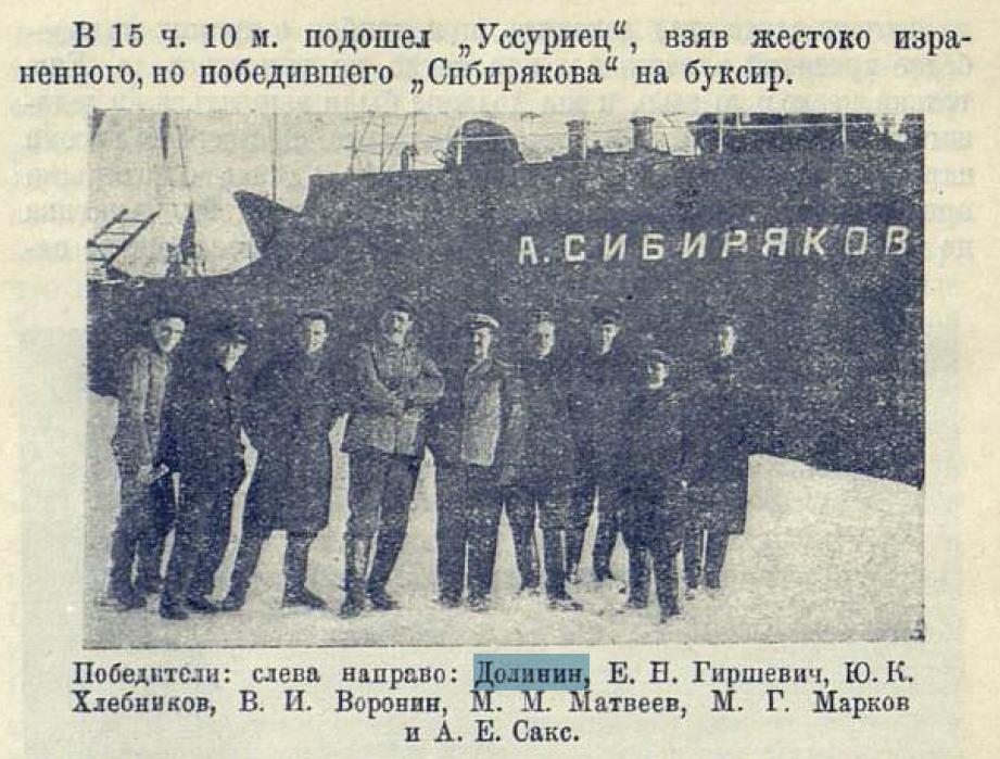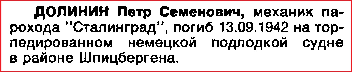 На палубе эсминца Попов встретил своих товарищей с "Родины" - помполита В. Гаврилюка, третьего механика А. Порошина, кочегара П. Панкратова, матроса В. Кузьмина и других. Не хватало двоих - Петра Семеновича Долинина и кочегара первого класса Михаила Михайловича Чикина...