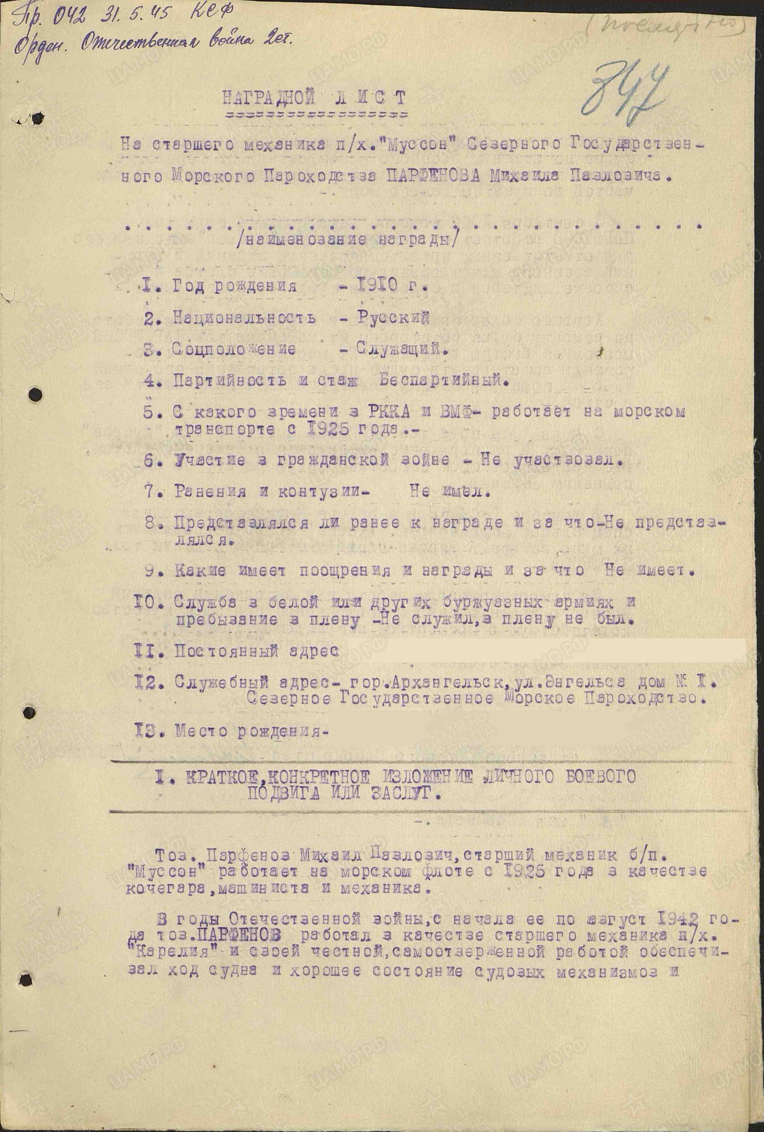 Впервые вышел я в морское плавание в навигацию 1942 года на п/х "Лахта" Северного морского пароходства, когда мне еще не исполнилось шестнадцати лет. На смену взрослым кадровым морякам, уходящим на фронт, тогда приходила зеленая молодежь, прибывавшая со всех концов нашей страны. Мне же, архангельскому пареньку, само собой уготована была морская судьба. Трудными и опасными были плавания в те годы, но нас, молодых ребят, это не пугало. Мне и моим товарищам военных лет, кого из них я помню, страстно хотелось найти свое место и вносить посильный вклад в защиту Родины. Пусть не покажутся выспренными эти слова, это было именно так. Я не знал никого из моих сверстников по учебе в школе, в морском техникуме или среди своих дворовых ребят, кто думал бы иначе. Белое и Баренцево море, где проходили наши каботажные плавания, были доступны для вражеских подводных лодок и авиации, и мы всегда были готовы к встрече с опасностями, а без них обходилось редкое плавание. Иногда они заканчивались трагически. В вестибюле управления Северного морского пароходства имеется памятная доска, где перечислены суда, погибшие в период войны, и пофамильно названы имена погибших на них моряков. Есть на этой доске и буксирный пароход "Муссон" и девять членов его экипажа. И когда я прочитал эти строки, передо мной ожили в воспоминаниях мои товарищи, многие из которых разделили судьбу этого небольшого суденышка и вместе с ним погребены в водах Баренцева моря. И мне захотелось поделиться своими воспоминаниями и отдать дань памяти тем, кто погиб на боевом посту, если учесть, что наше судно входило в состав вспомогательных судов Северного флота под номером М-39, имело вооружение и на гафеле несло военно-морской флаг. Всю навигацию 1943 года я проплавал на пароходе "Канин", а в декабре, после передачи судна в Севгосрыбтрест, меня направили матросом на буксирный пароход "Муссон". Отправляясь на Экономию, я никак не предполагал, что буду участвовать в подъеме затонувшего судна, что придется мне жить не в теплой каюте, а в холодном бараке лесозавода № 26, а вместо матросской вахты справляться с почти пудовой пешней, окалывая лед вокруг судна, от которого над водой торчали только мачта, труба и часть верхнего мостика. Как мне помнится, работали все одинаково, без различия на комсостав или рядовой. Небольшой и, как я сразу почувствовал, дружный экипаж правильно понимал задачу-судно должно быть готово к подъему До наступления ледохода. Мы кололи лед, очищали майну от льда, заводили стальные тросы, вокруг корпуса судна и с помощью ручных лебедок поставили судно на ровный киль. Много было вложено труда, тросы рвались, судно снова заваливалось в первоначальное положение, все начинали сначала. Светлого времени было мало, затемно после трехкилометровой ходьбы приступали к работам и с темнотой уходили в барак, где совмещали скудный обед с таким же ужином. Организатором и зачинателем всех работ был наш старпом Андрей Федорович Афонин. Он не чурался никакой работы и был для нас примером в отношении к труду. Нельзя было стоять в стороне, видя, как он трудится, орудует топором или пешней. Небольшого роста, в полушубке, с красным от мороза лицом, он заражал всех трудовым энтузиазмом, и каждый день у нас не проходил даром. Вместе с нами трудился и второй штурман Елисеев, по оплошности которого осенью за