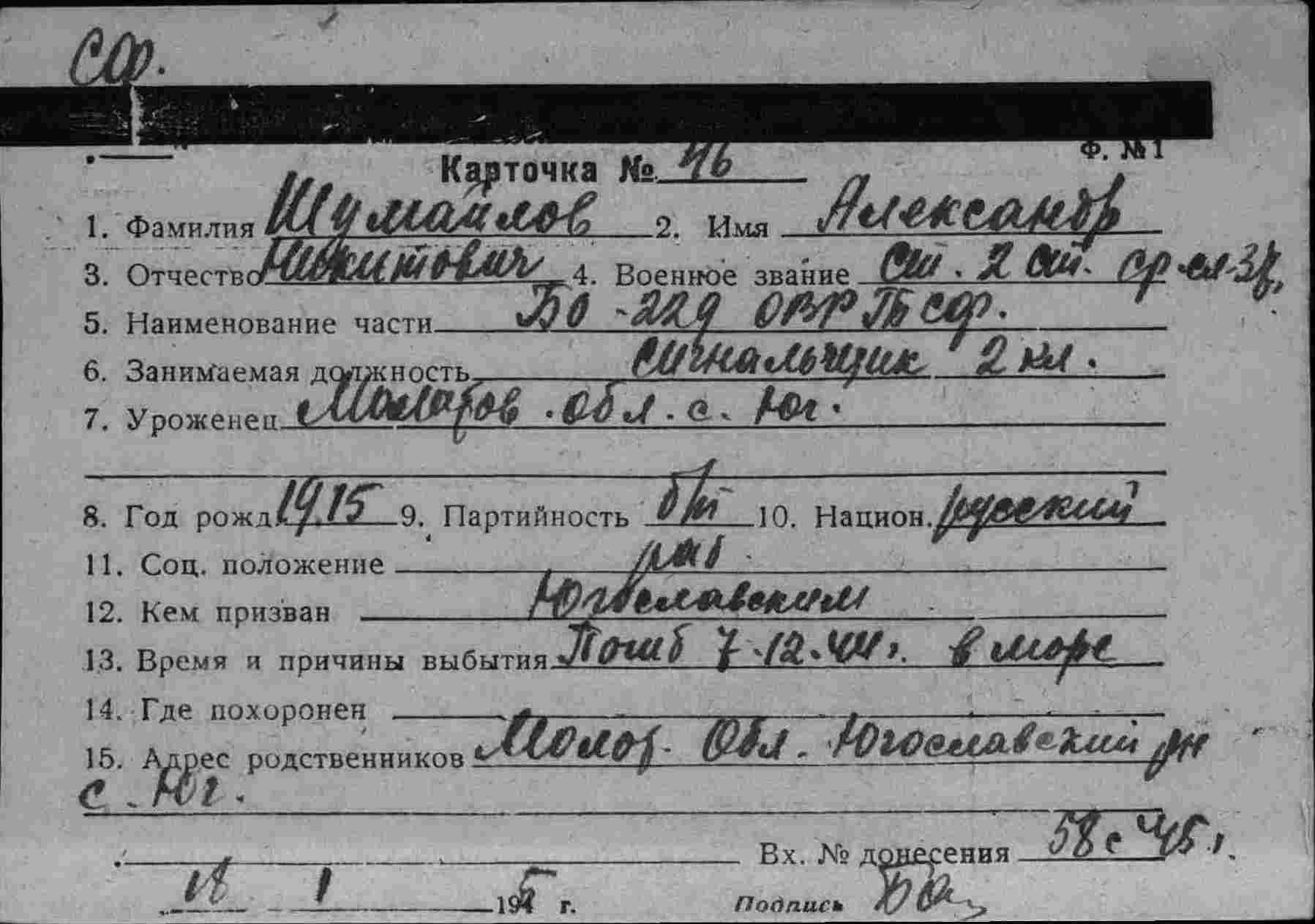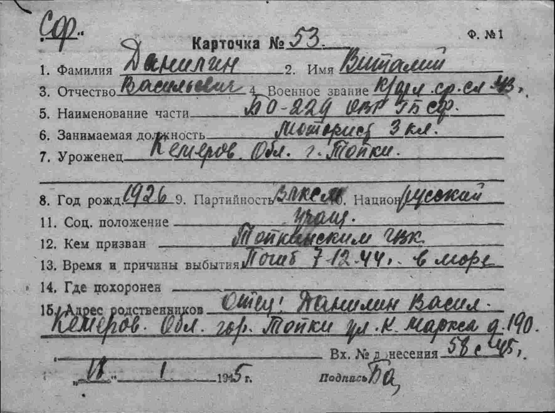Список членов экипажа БО-229 погибших 7.12.1944 г. при торпедировании германской подводной лодкой "U-997" в р-не о. Кильдин.