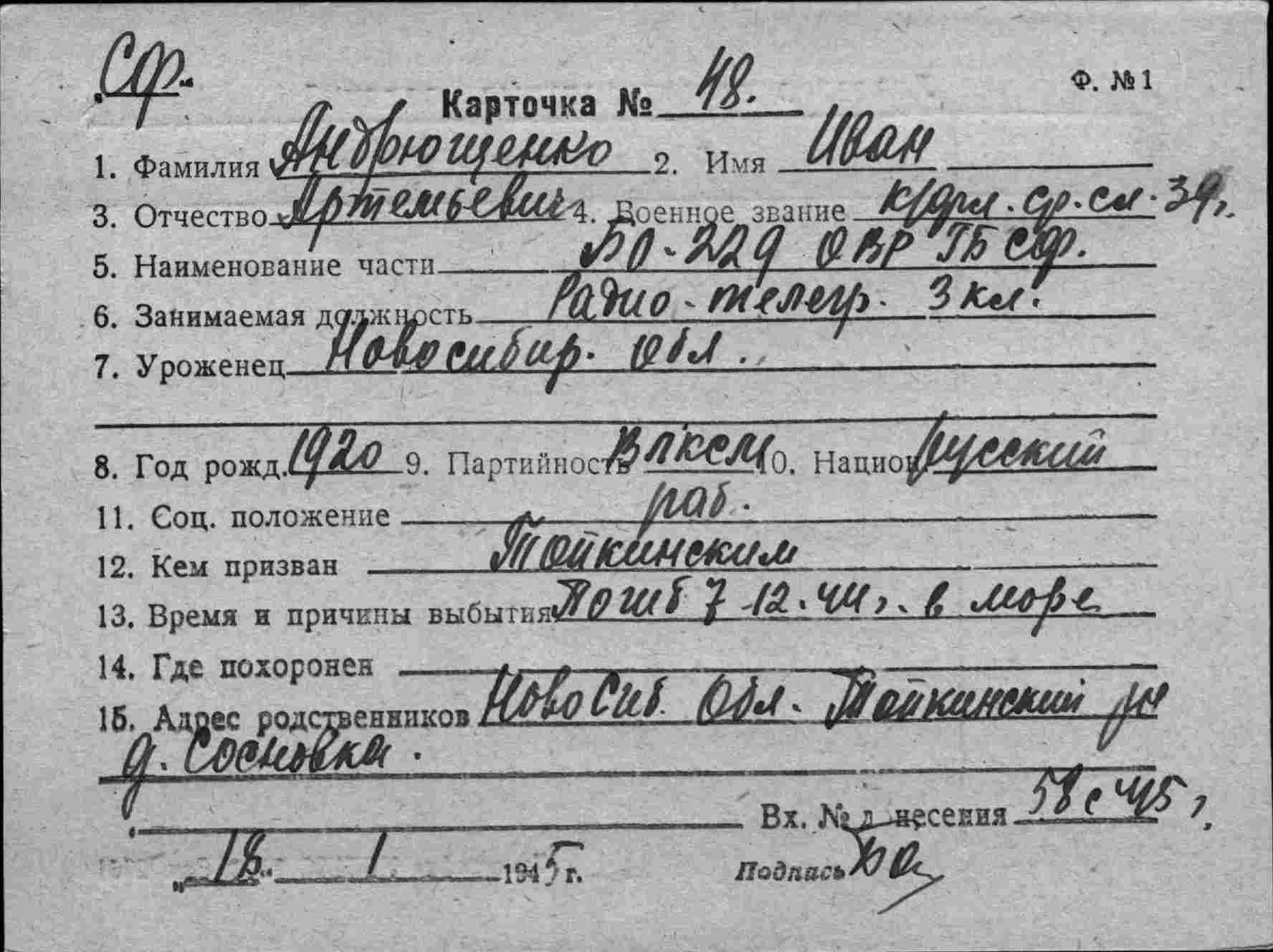 Название источника информации Картотека безвозвратных потерь